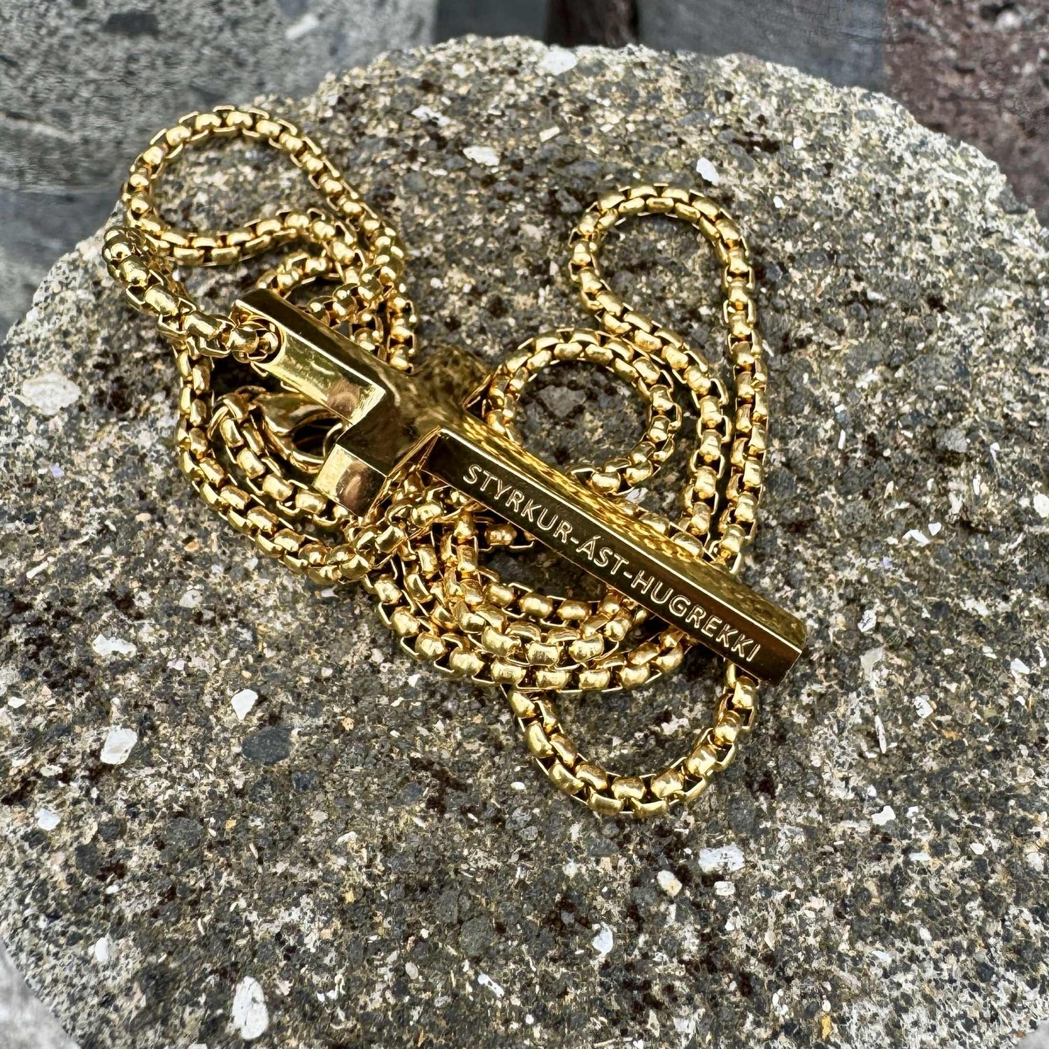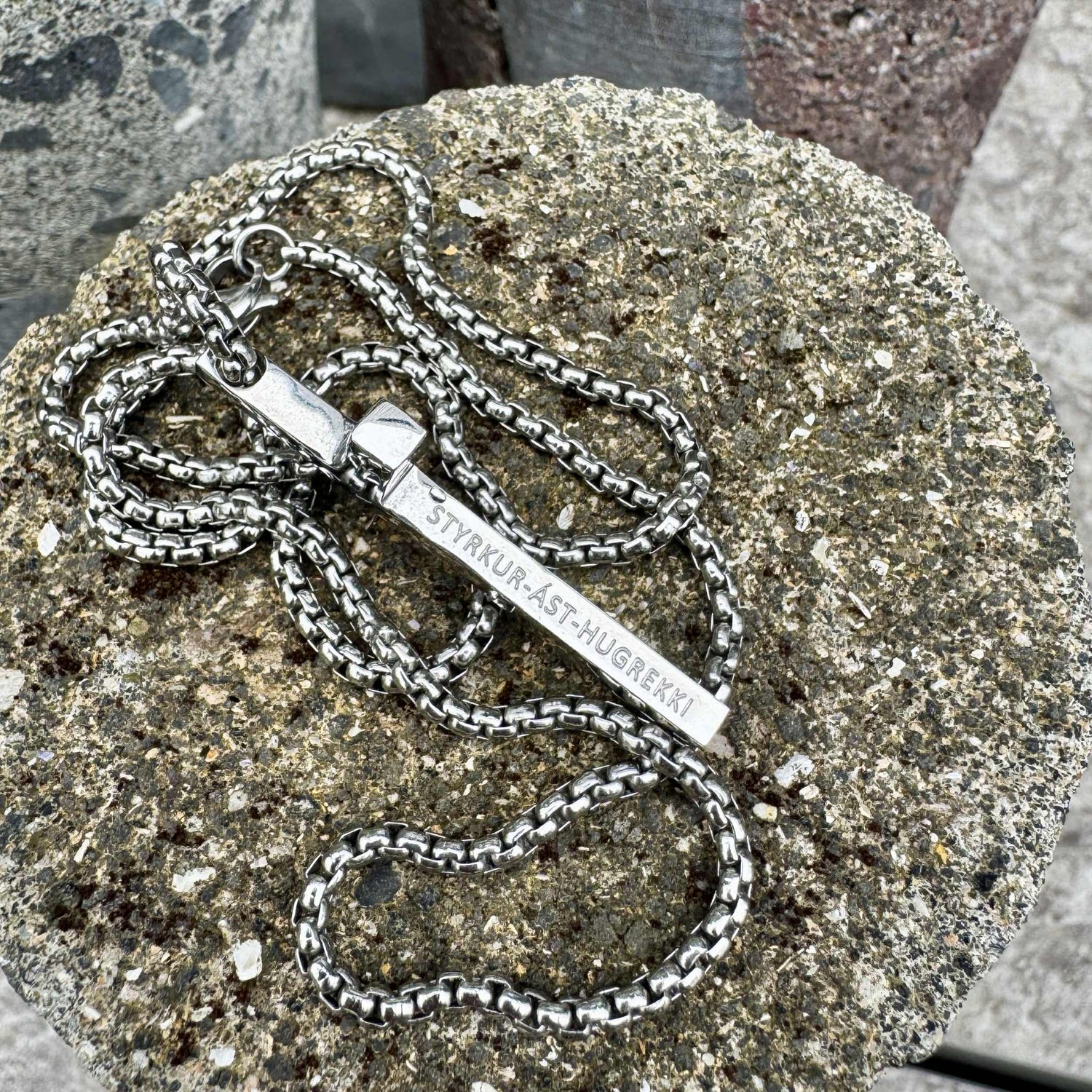 Þessir nisti eru ný af nálinni. Þau eru skreytt með textanum Styrkur, ást og hugrekki og fást bæði í Silfur og gylltum lit. Þau eru úr ryðfríu stáli og henta því í sund og sturtur án þess að falli á skartið. Keðjan er vegleg og stillanleg 51-57 cm. Breidd nistis er 15 mm og hæð 25 mm.