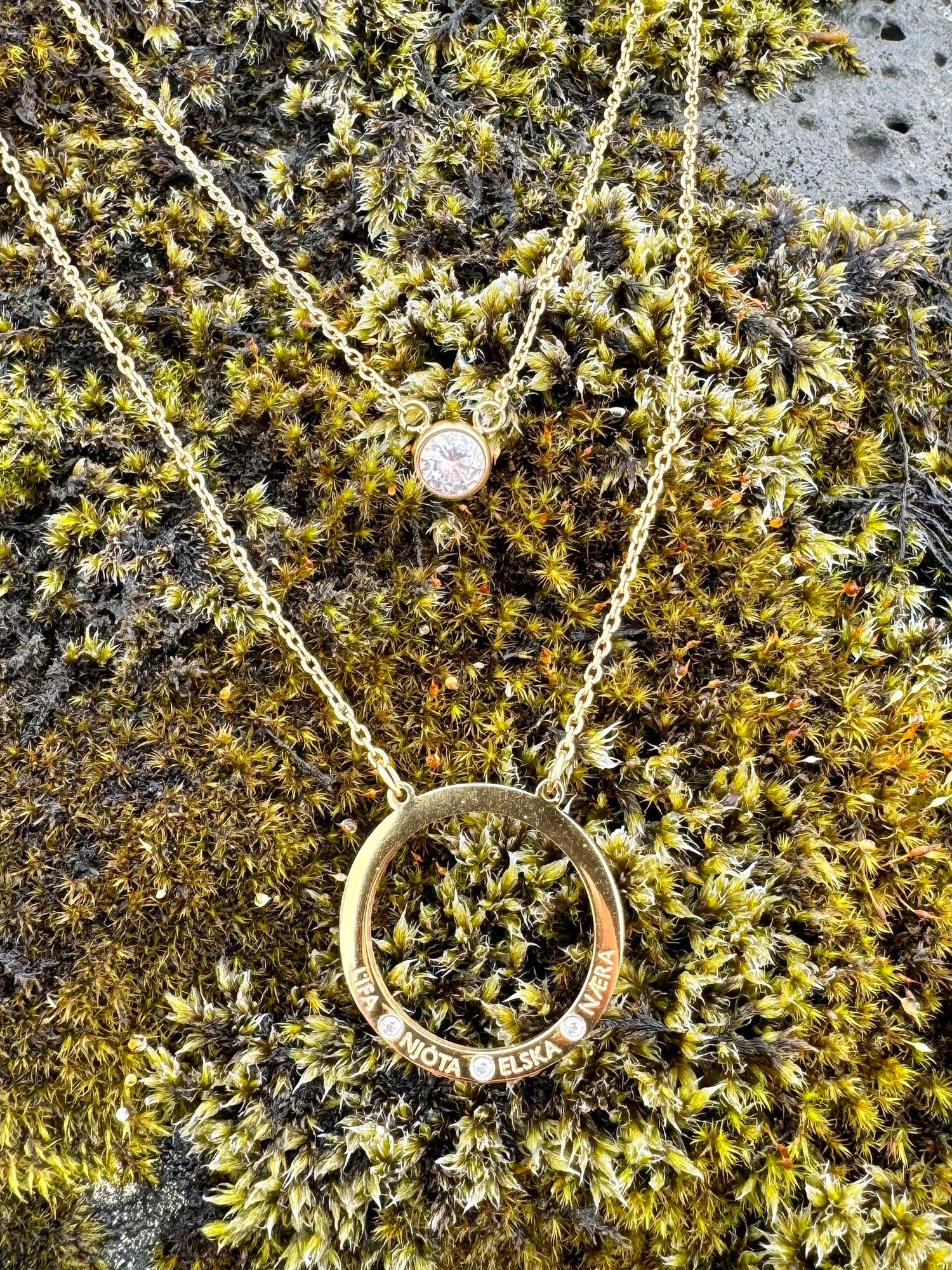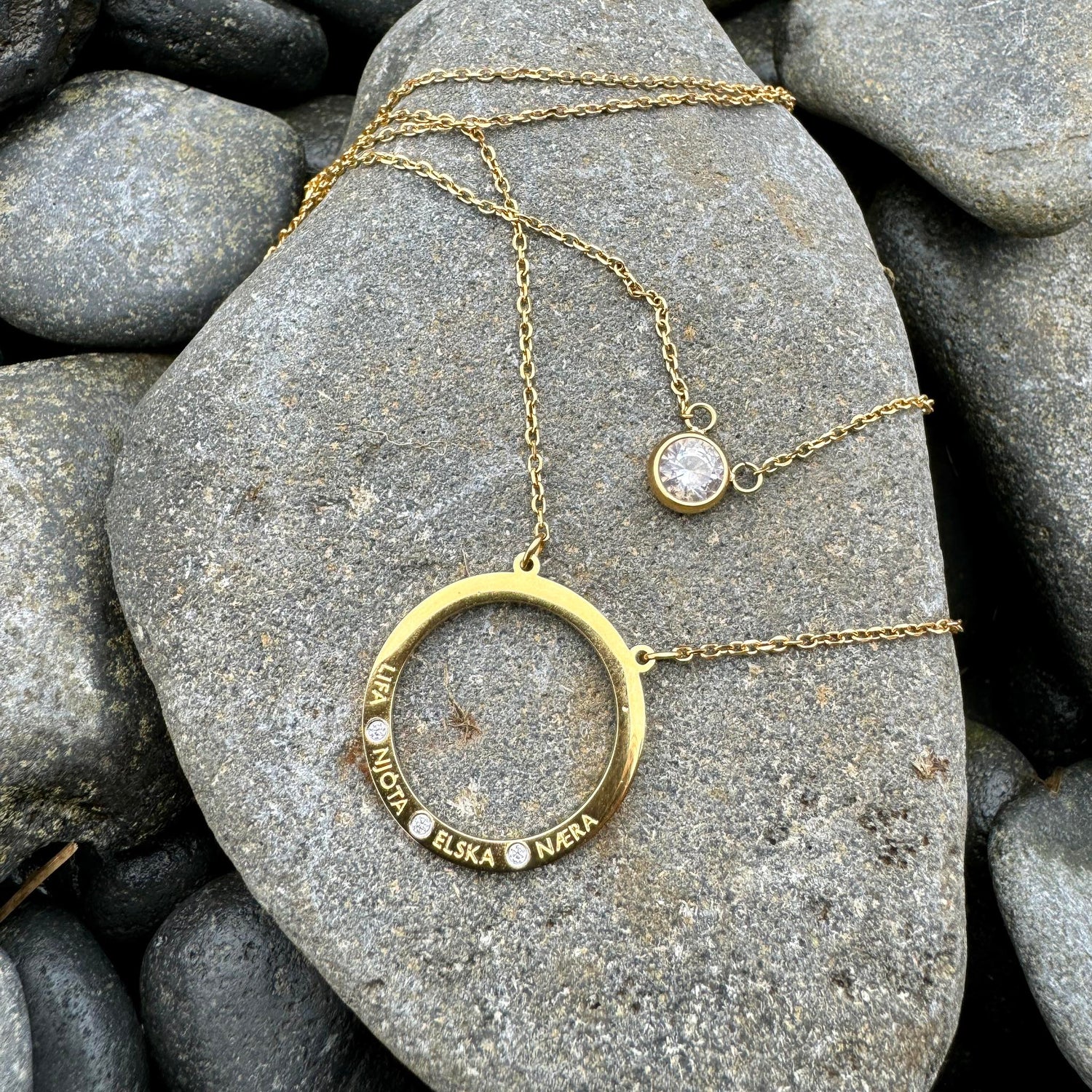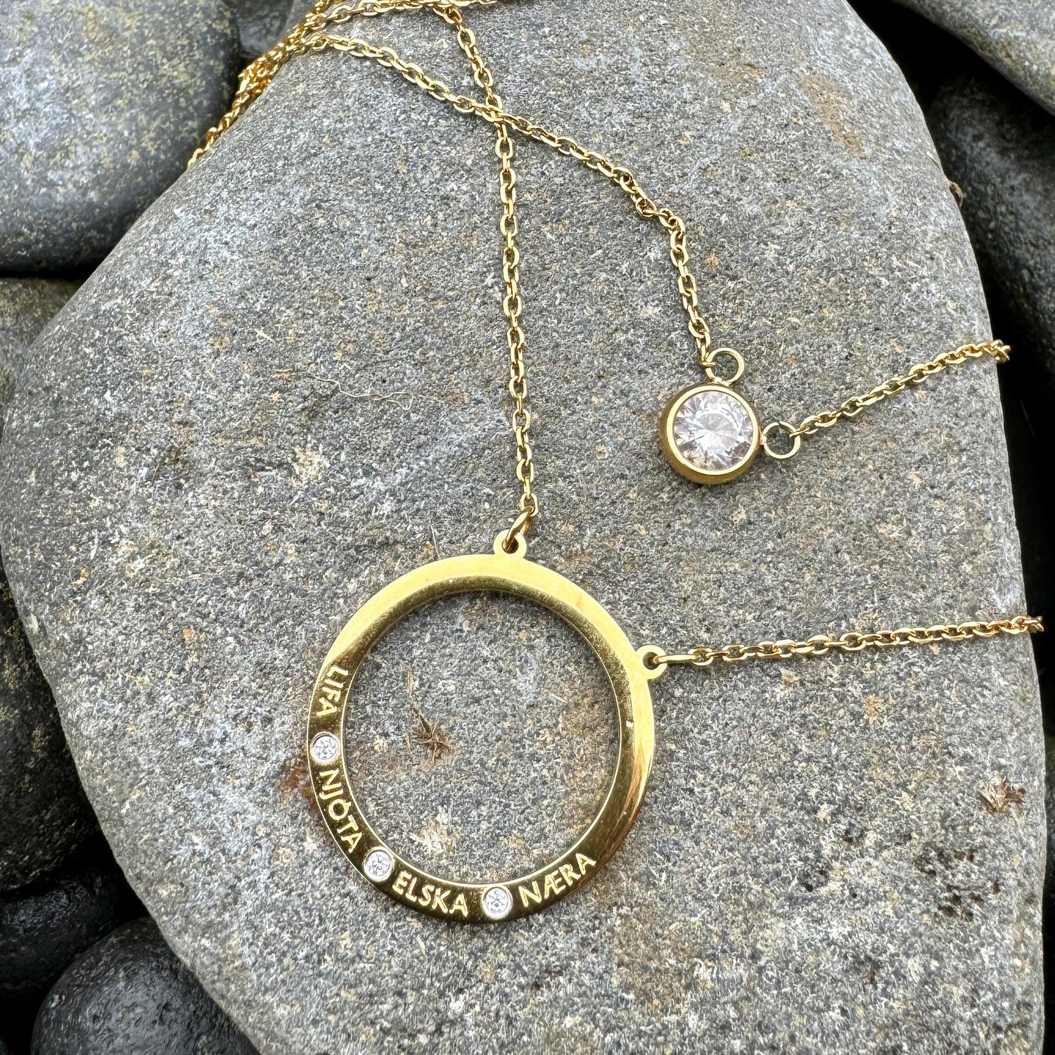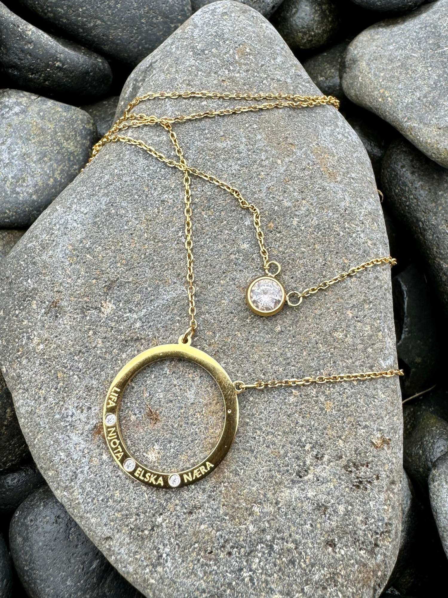 Nistin eru bæði í gylltu og silfur og með stillanlegri keðju svo hægt er að lengja úr 40 cm í 45 cm s.s. minni keðjan með steininum.