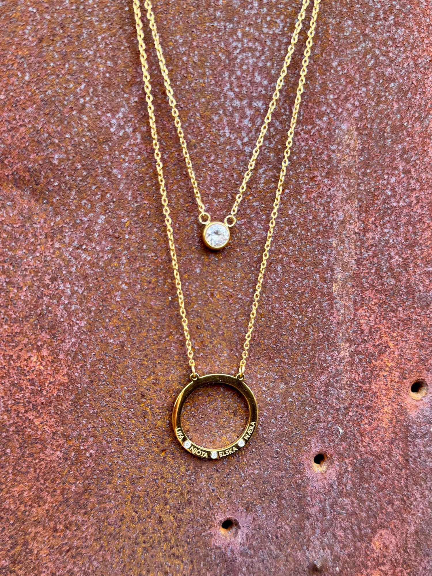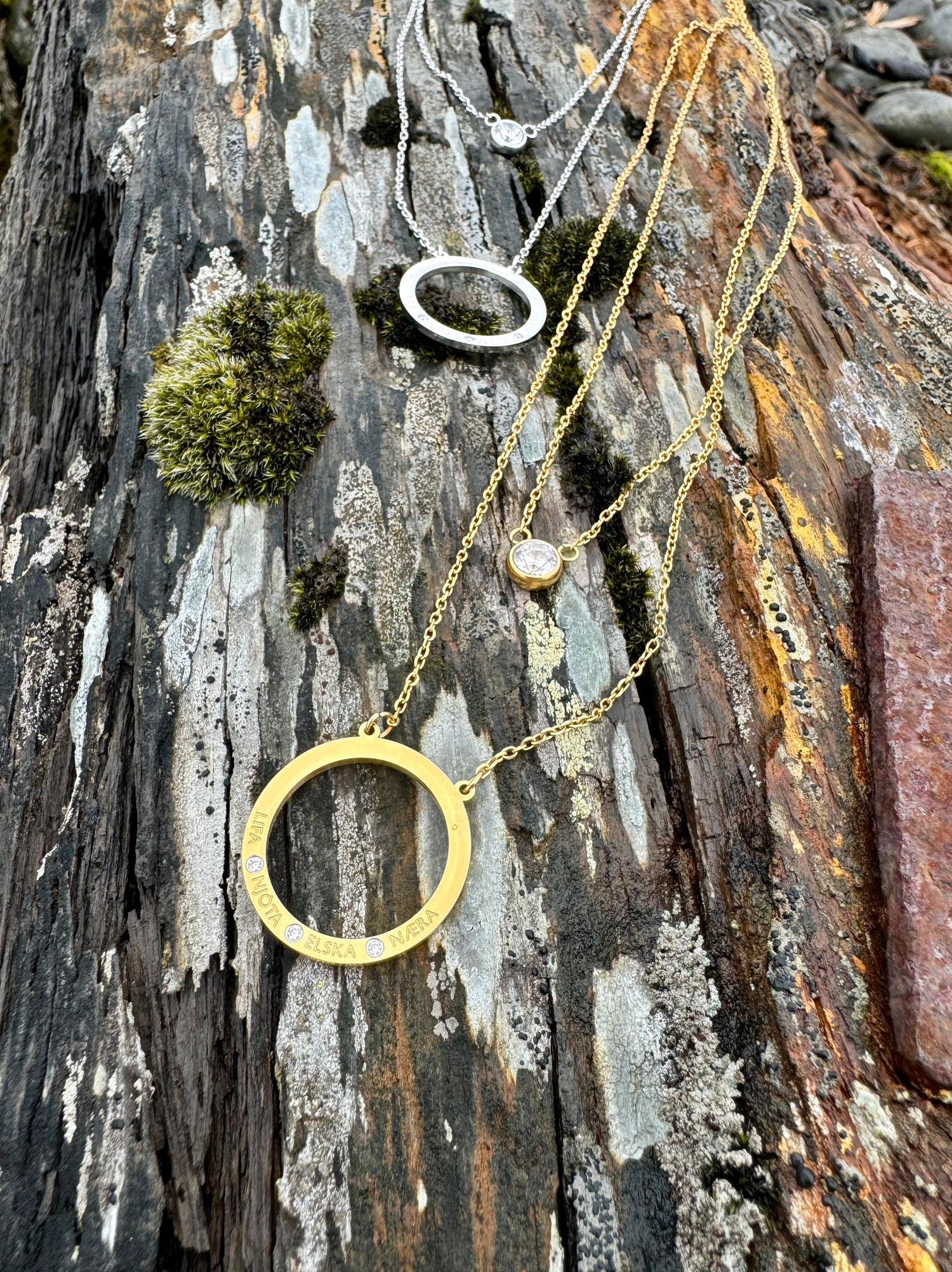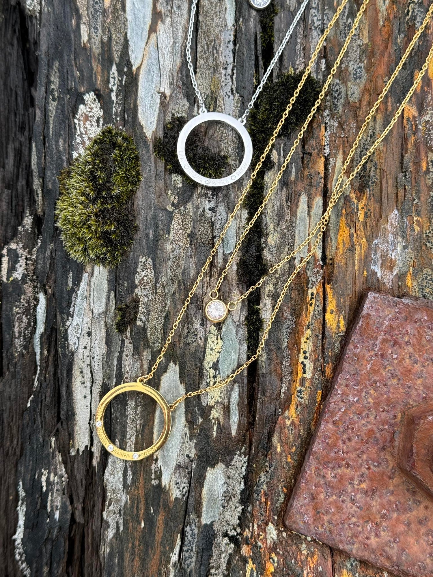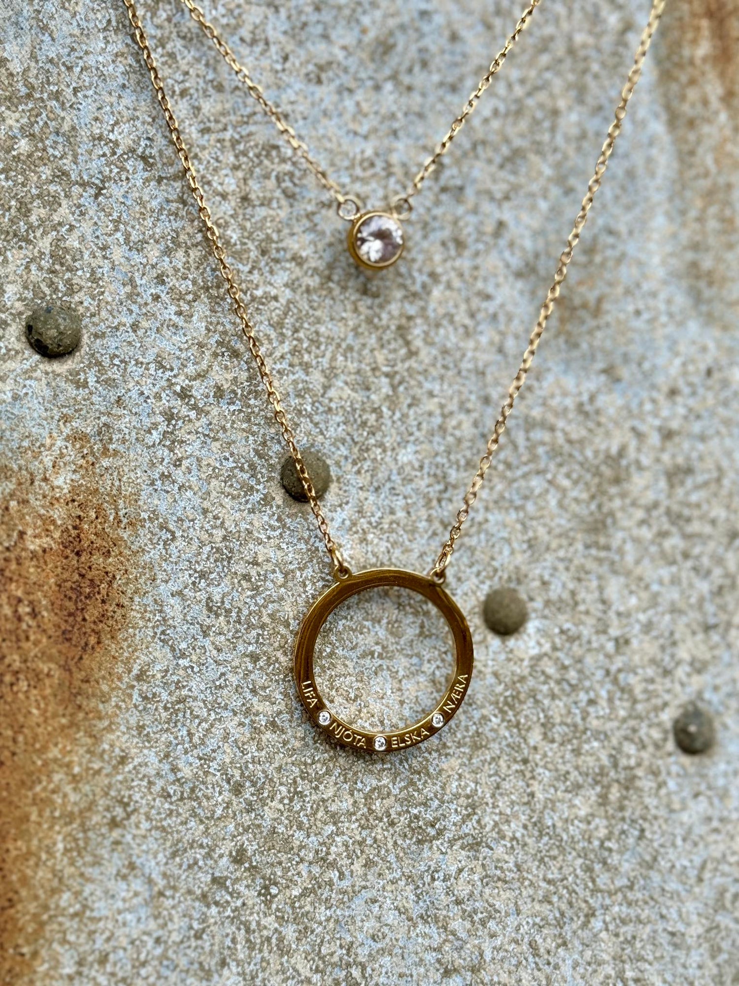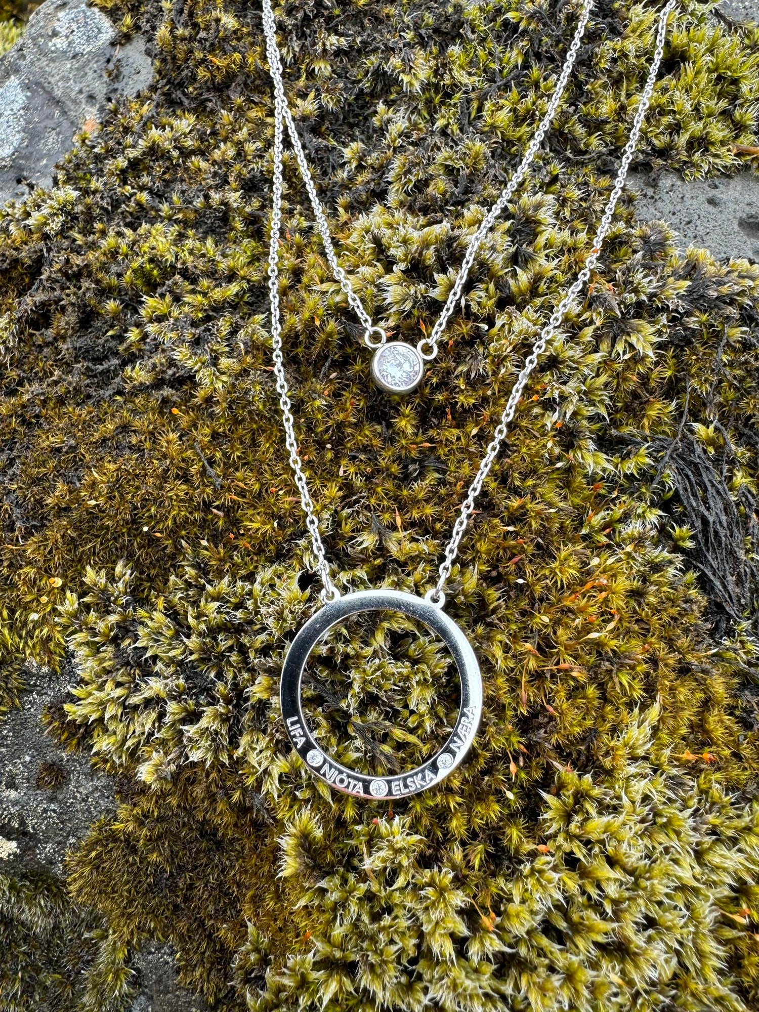 Nistin eru bæði í gylltu og silfur og með stillanlegri keðju svo hægt er að lengja úr 40 cm í 45 cm s.s. minni keðjan með steininum.