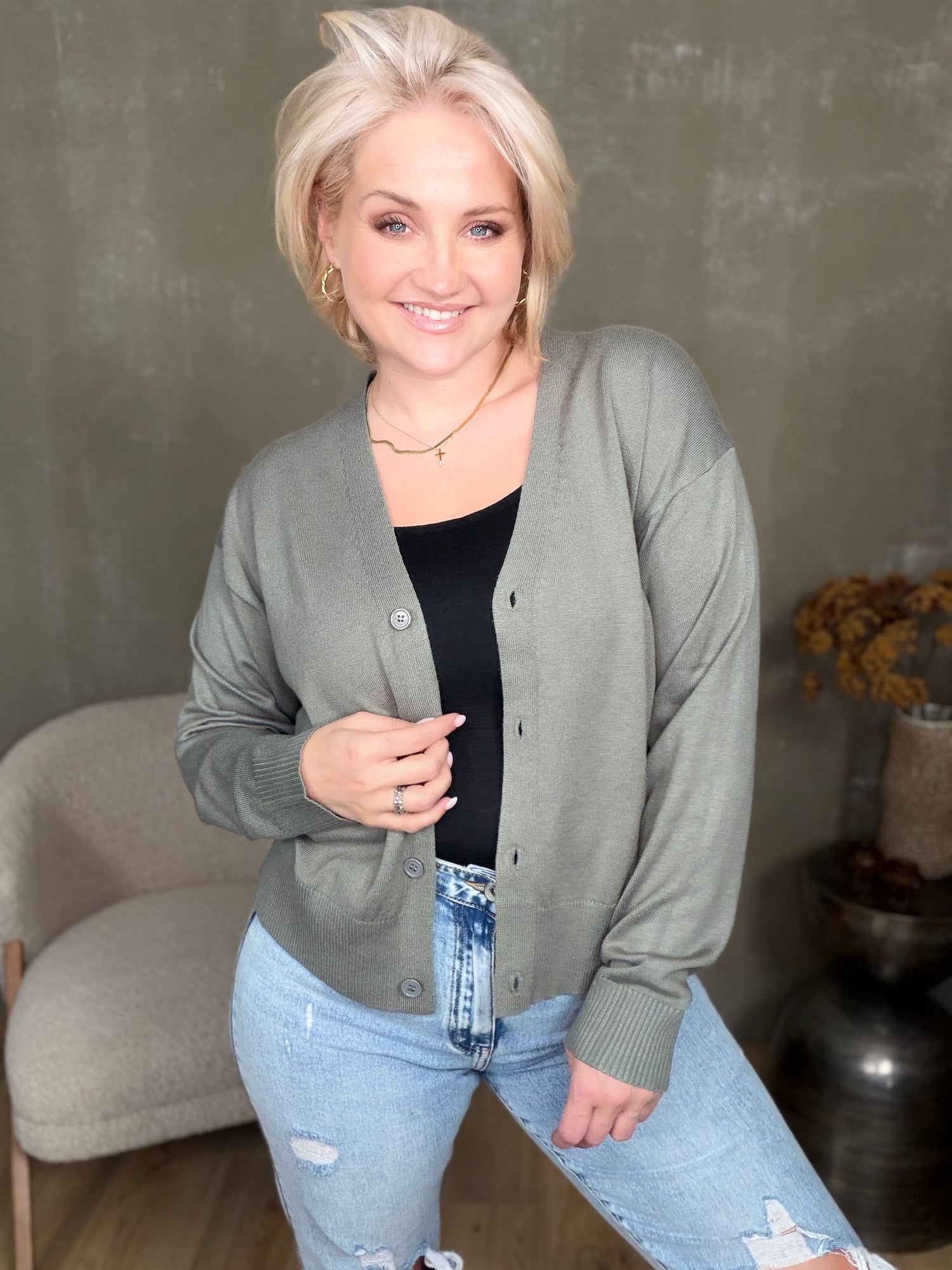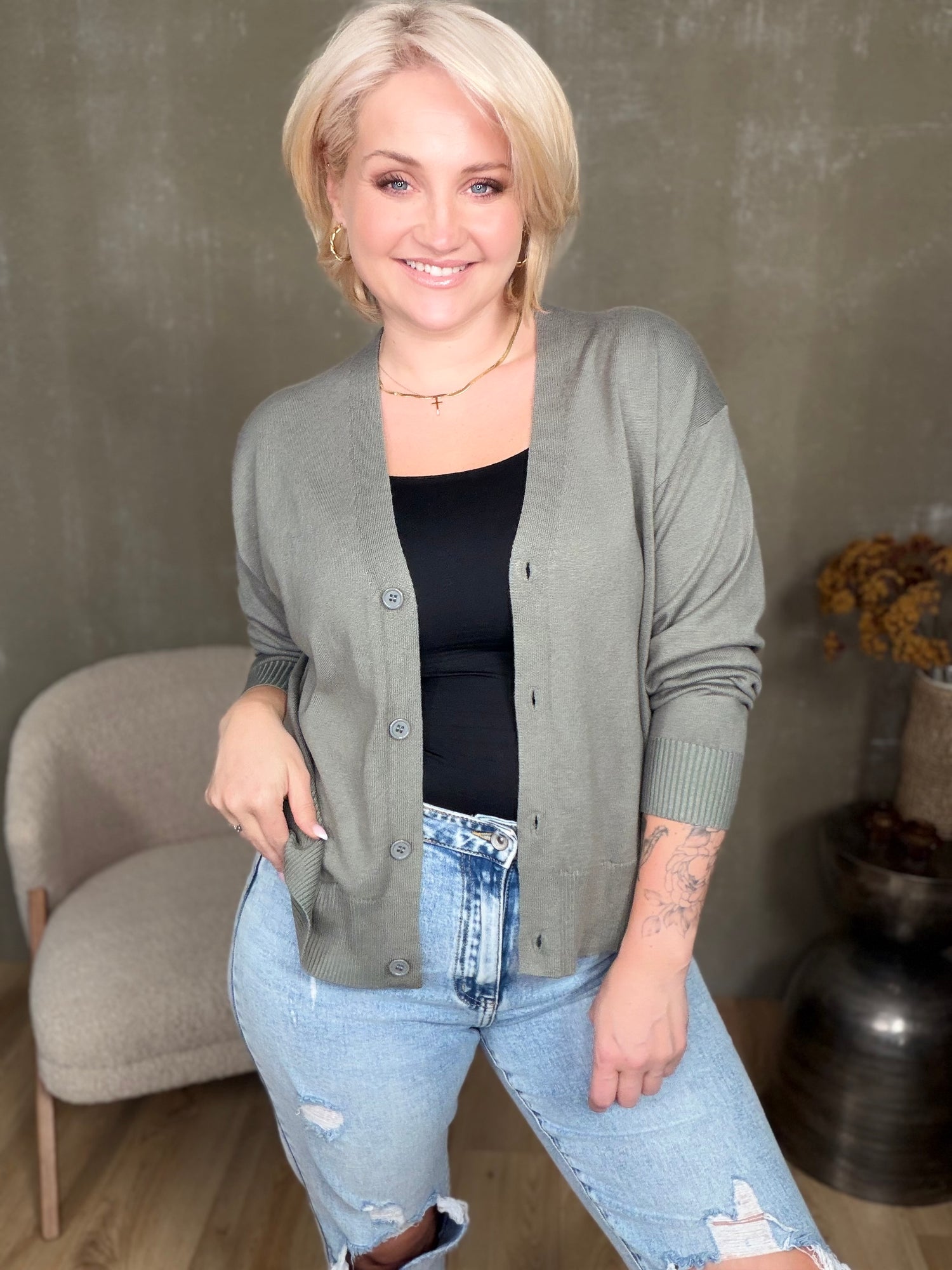 Athena gollan frá Movesgood er klassísk flík, fín prjónuð, hneppt að framan með tölum og V- hálsmáli.