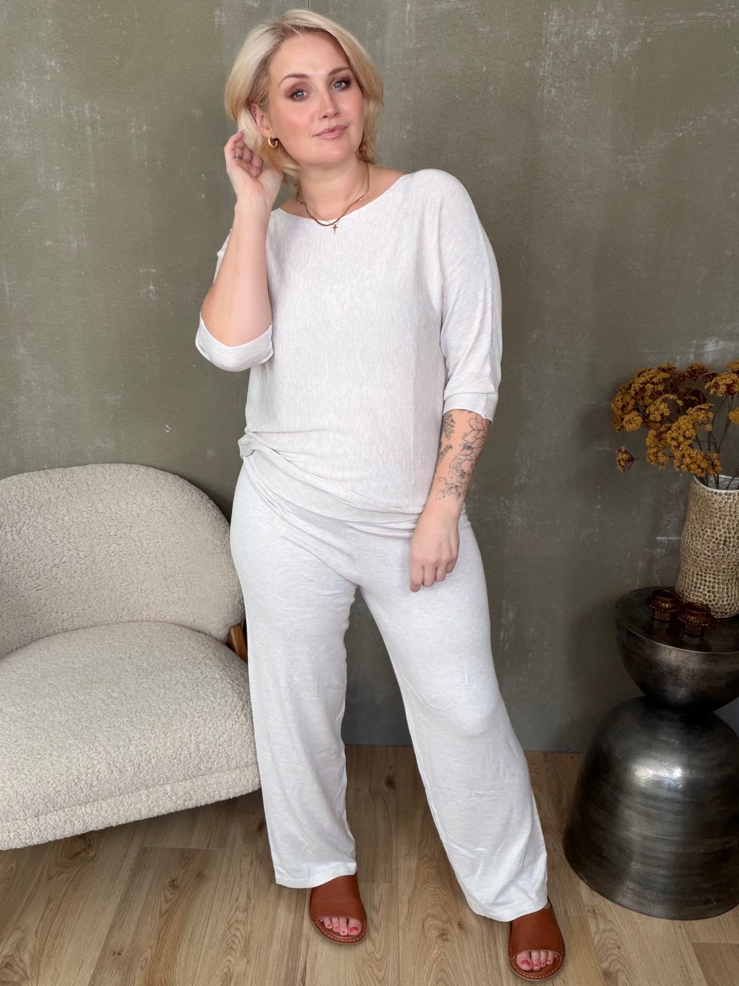 Kim buxurnar frá Movesgood eru ótrúlega mjúkar og þægilegar buxur. Þær eru beinar í sniðinu með teygju í mittið. Fullkomnar kosý buxur.
