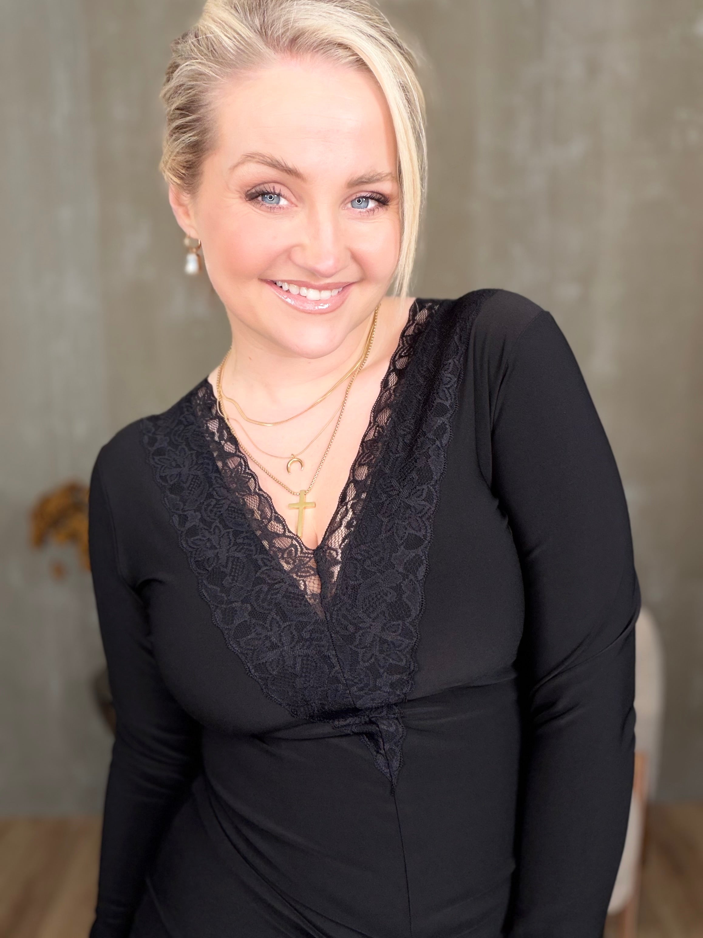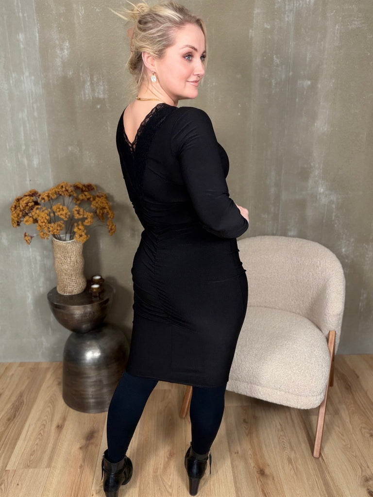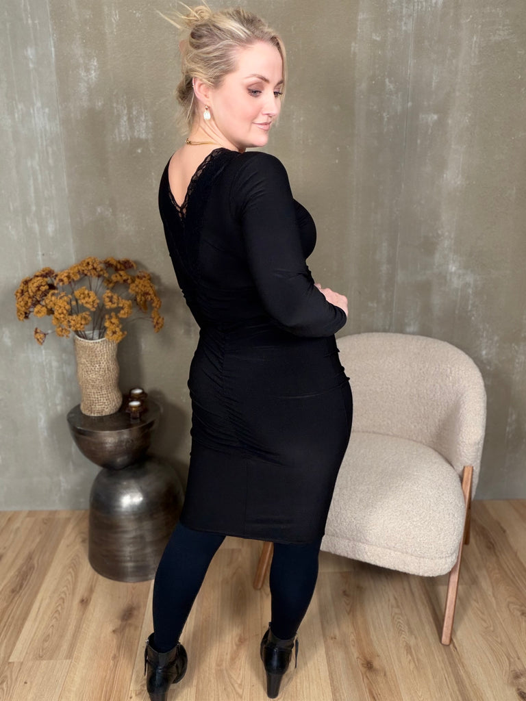 Skemmtilegur kjóll með einstaklega klæðilegum smáatriðum og er fáanlegur bæði með síðum ermum sem og ermalaus. Kjóllinn er úr stífu teygjuefni með mikilli teygju og veitir heilmikið aðhald.
