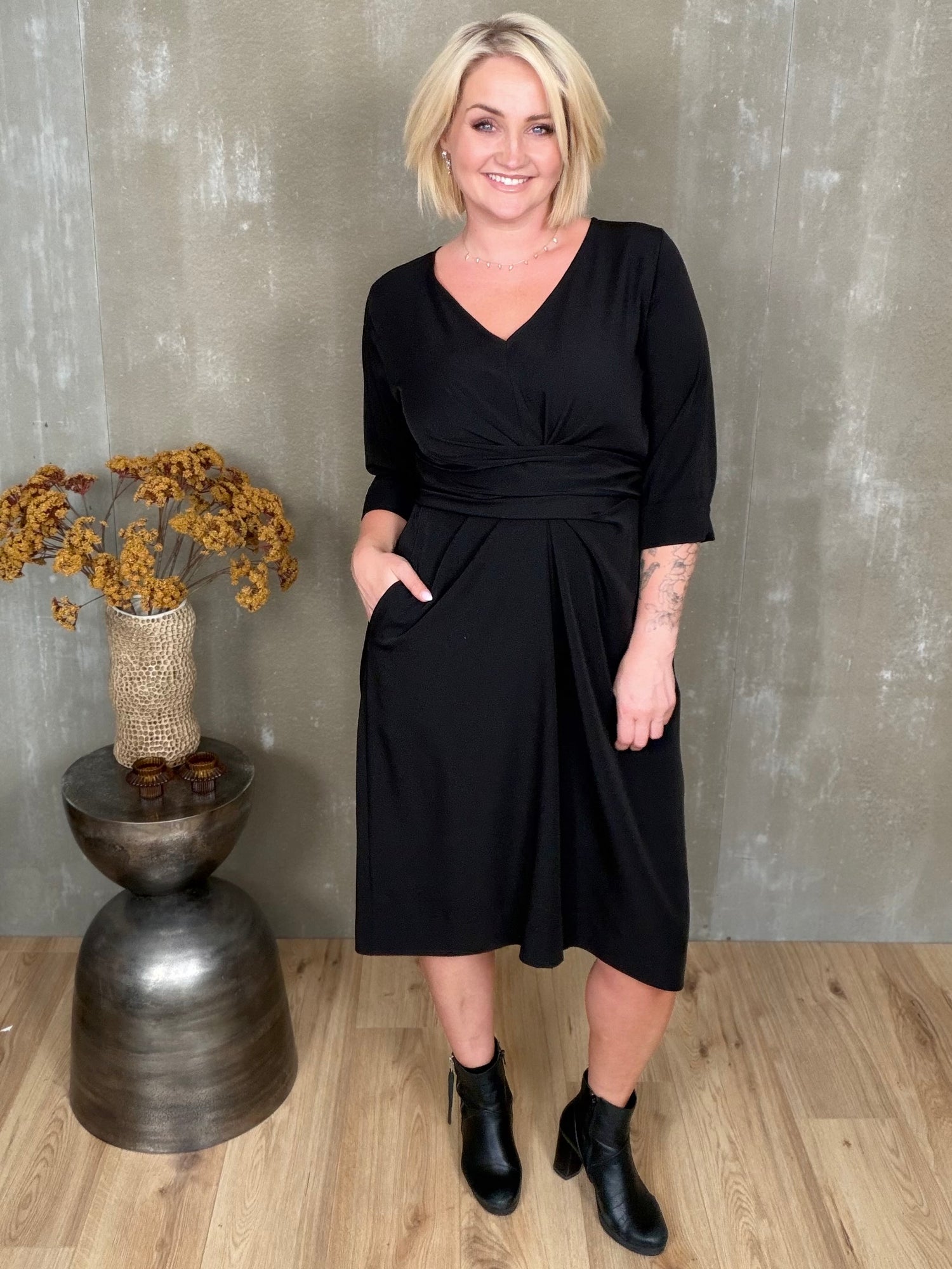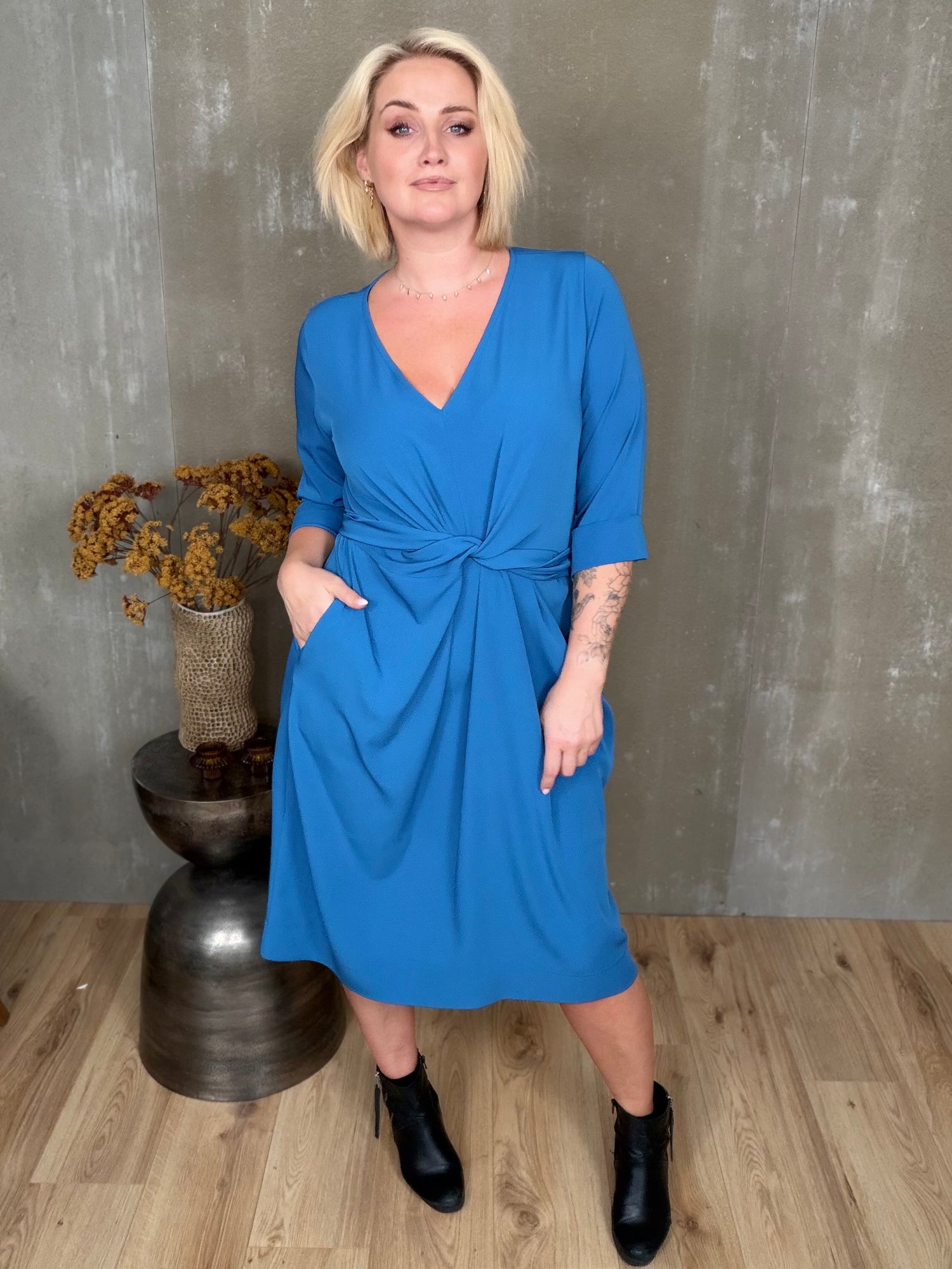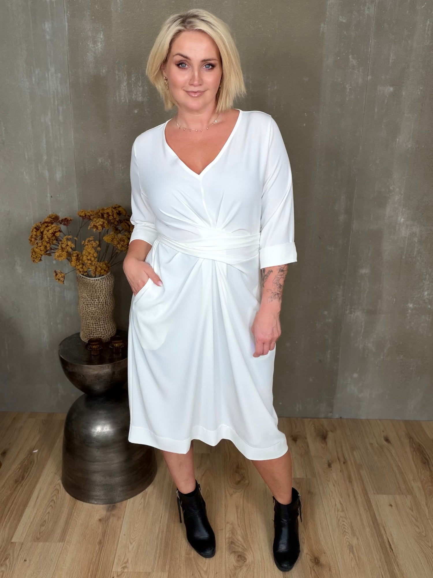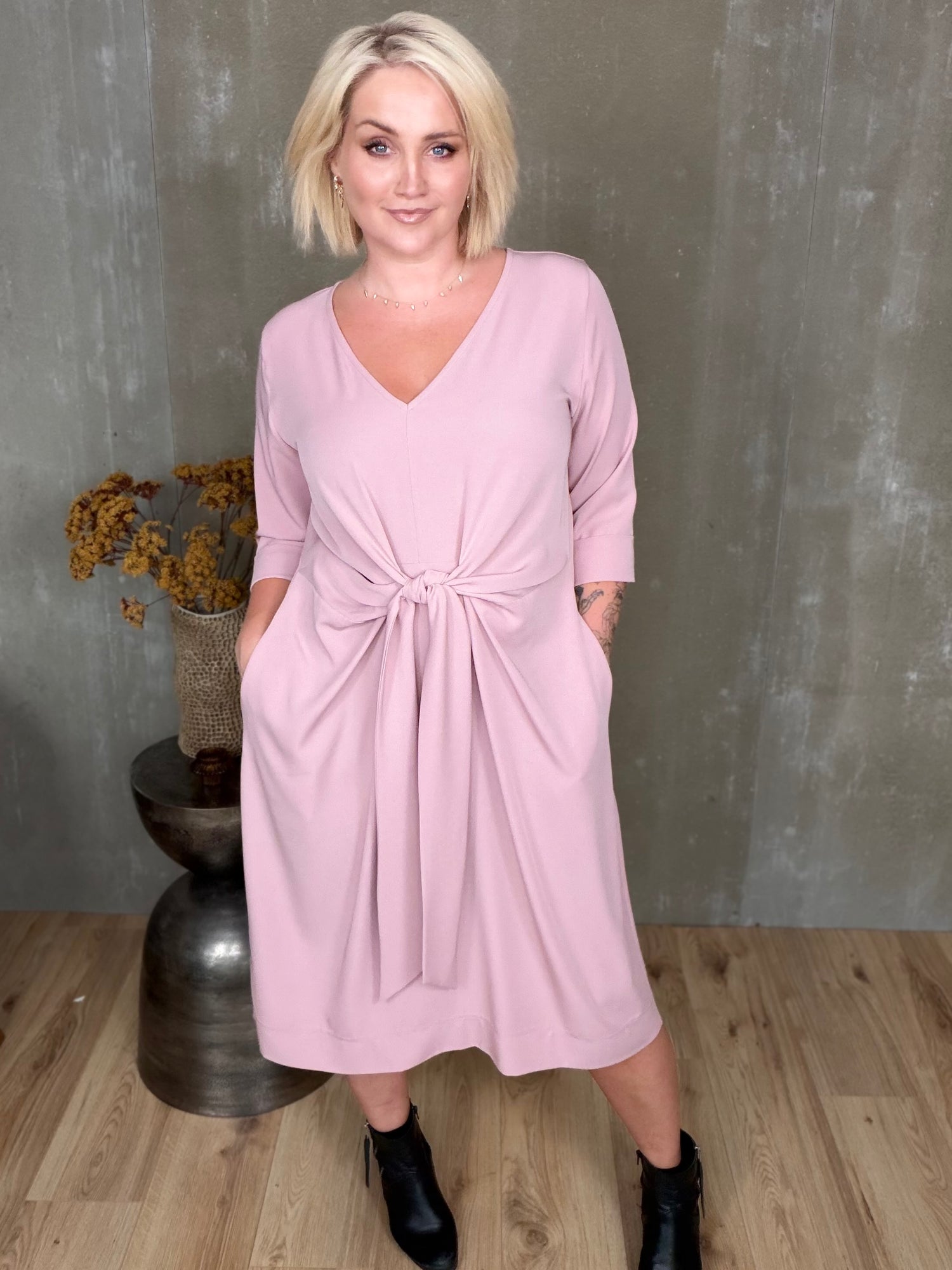 Stólpi er tímalaus og sniðugur kjóll með fallegu V-hálsmáli, kvart ermum með uppábroti og vösum í hlið! Hann er bundinn saman með hnút í mittið sem gefur fallegt form.