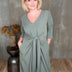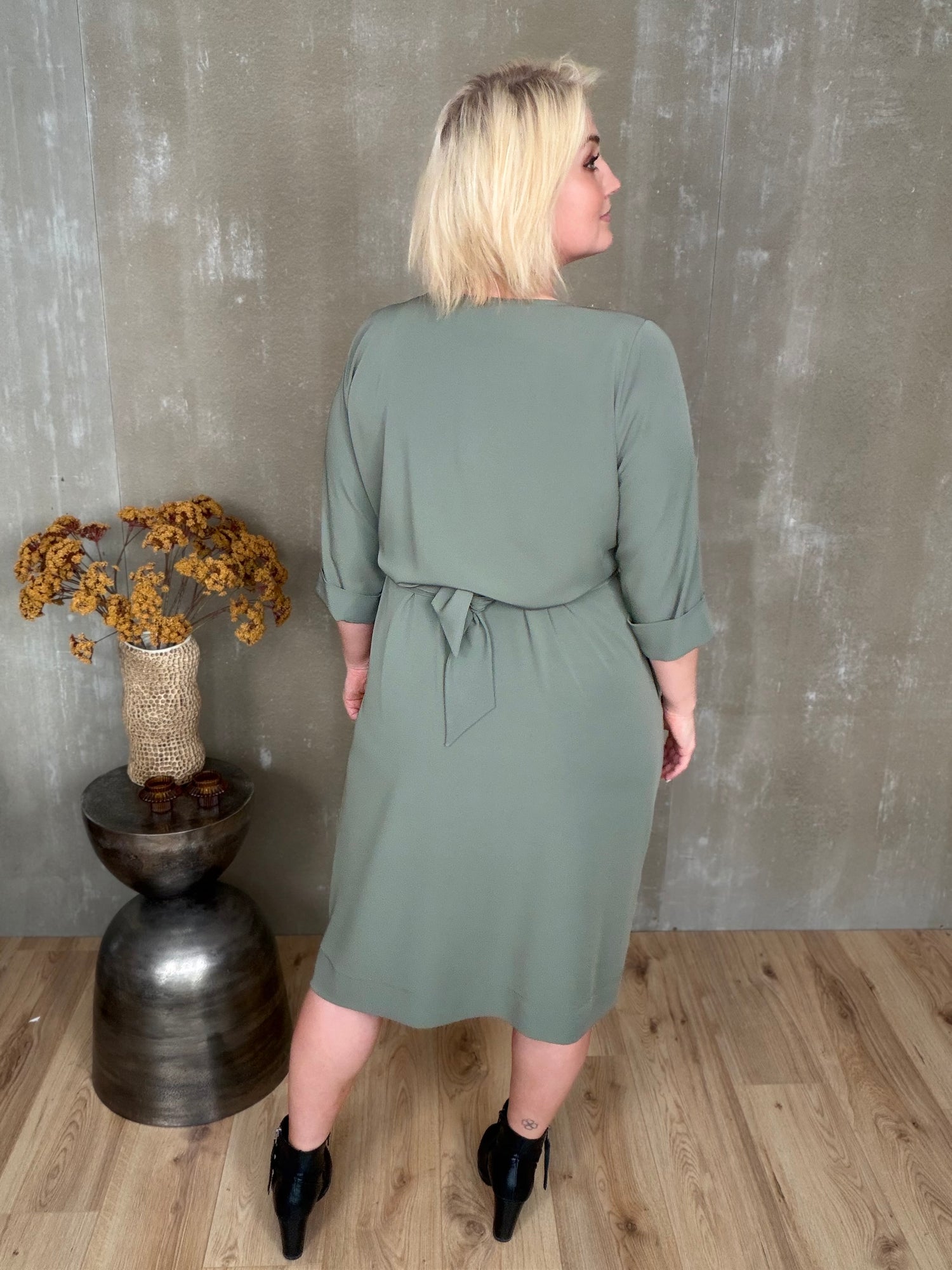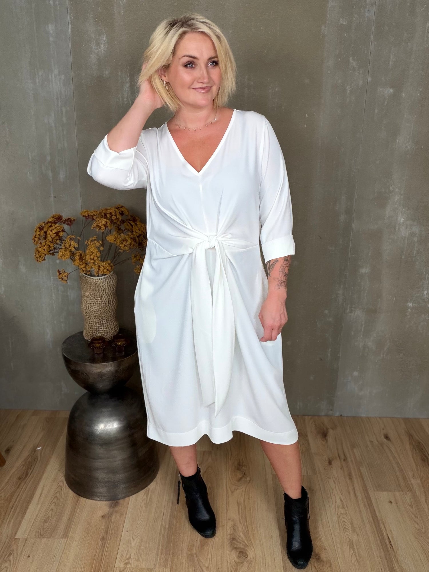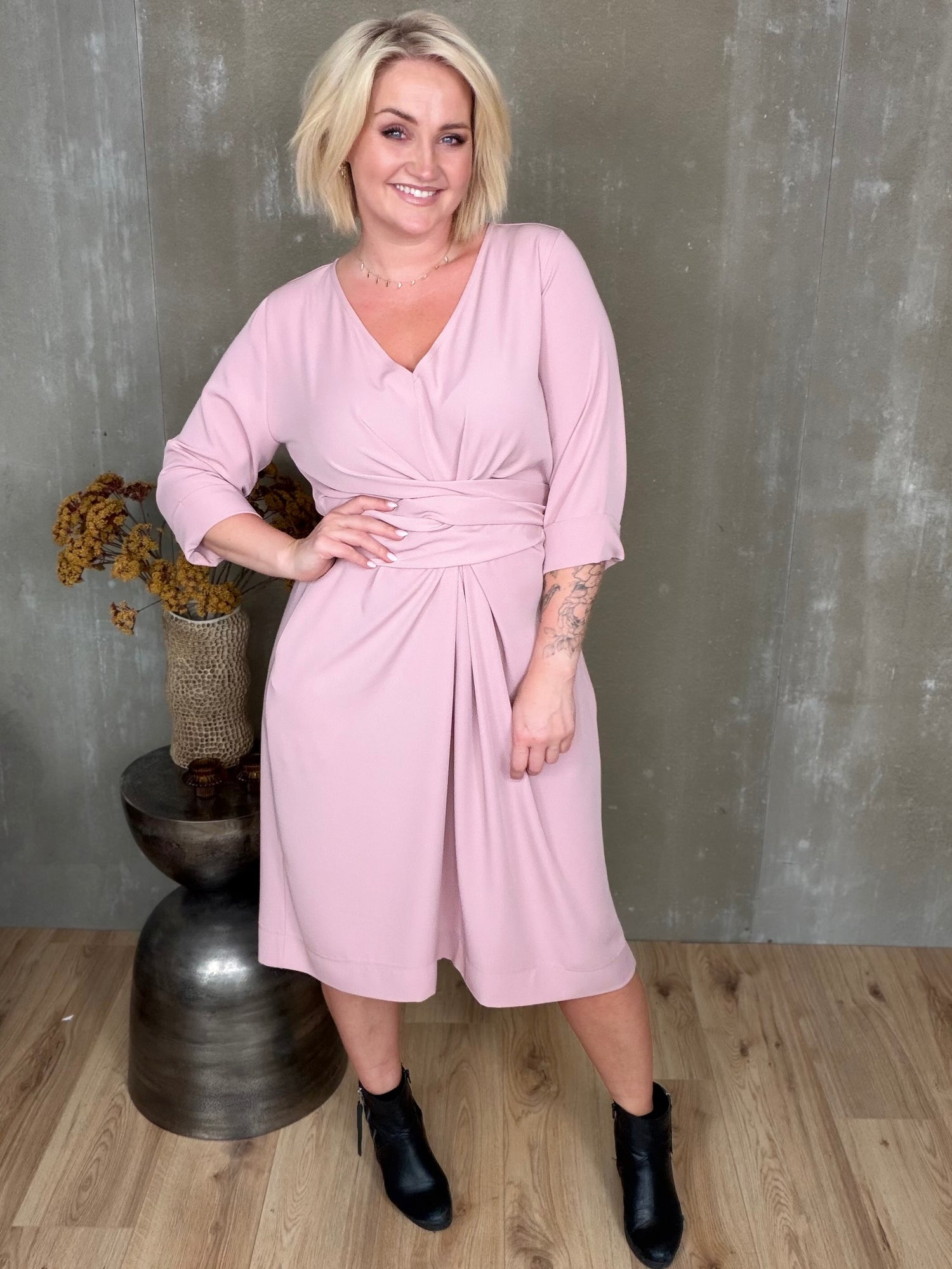 Stólpi er tímalaus og sniðugur kjóll með fallegu V-hálsmáli, kvart ermum með uppábroti og vösum í hlið! Hann er bundinn saman með hnút í mittið sem gefur fallegt form.