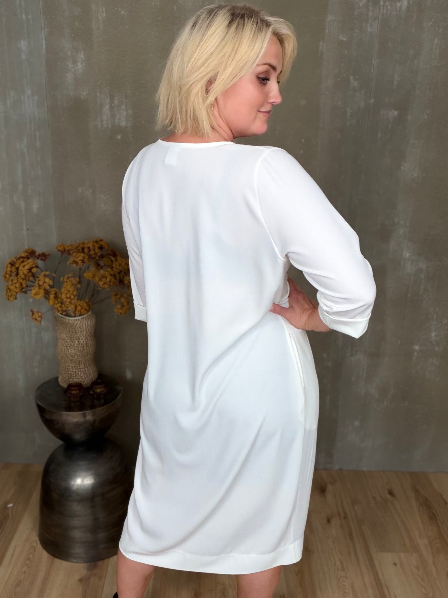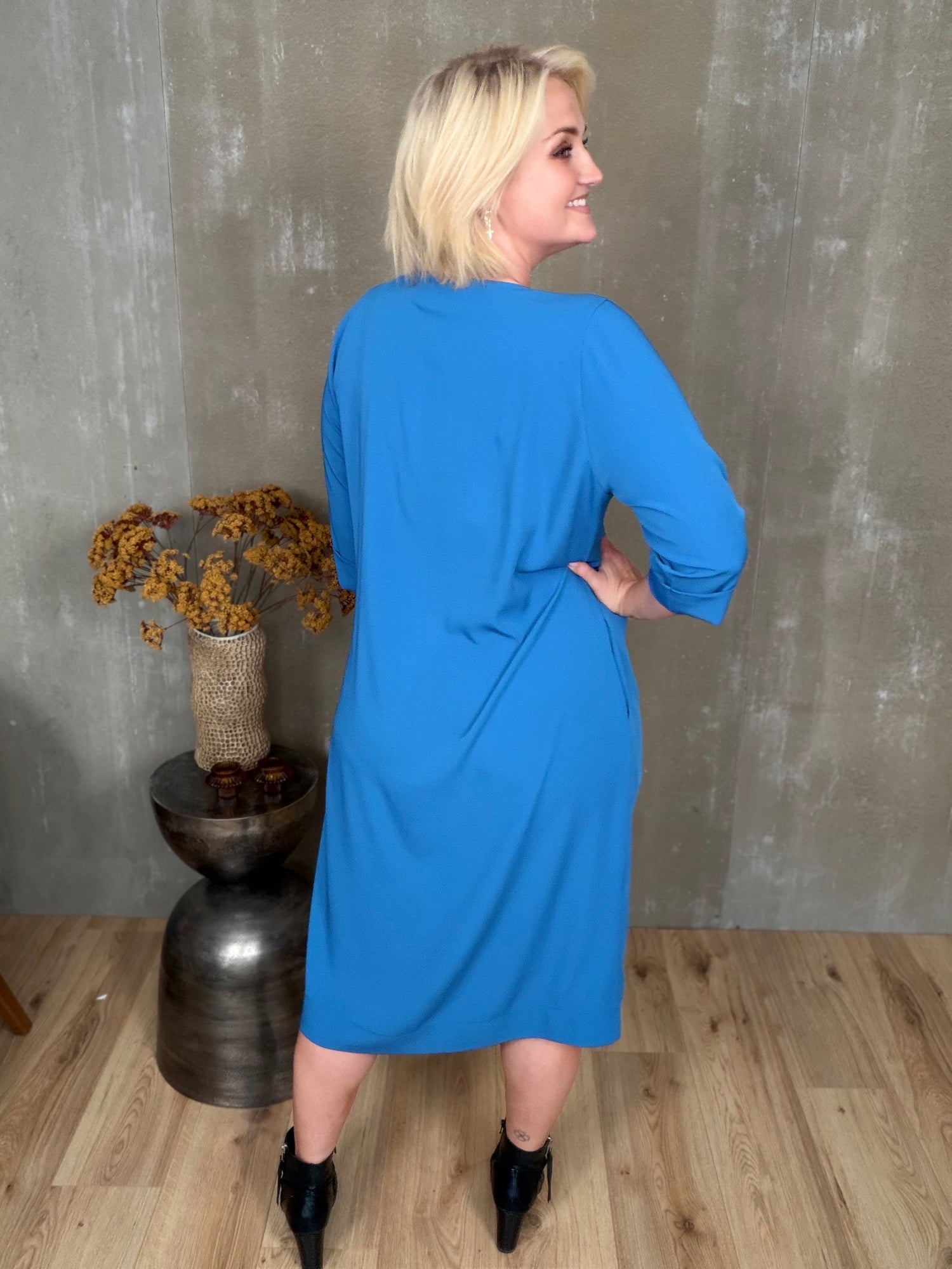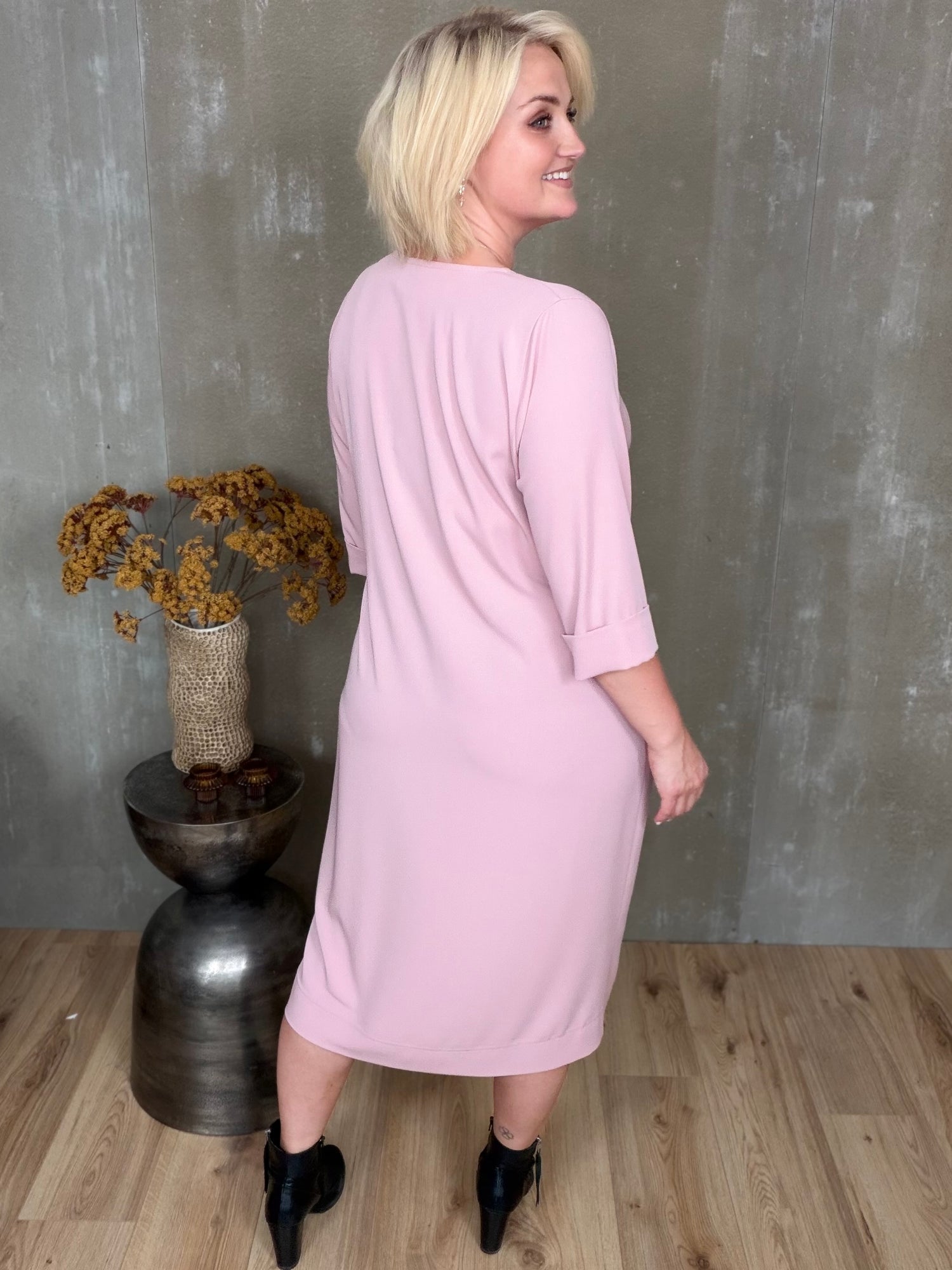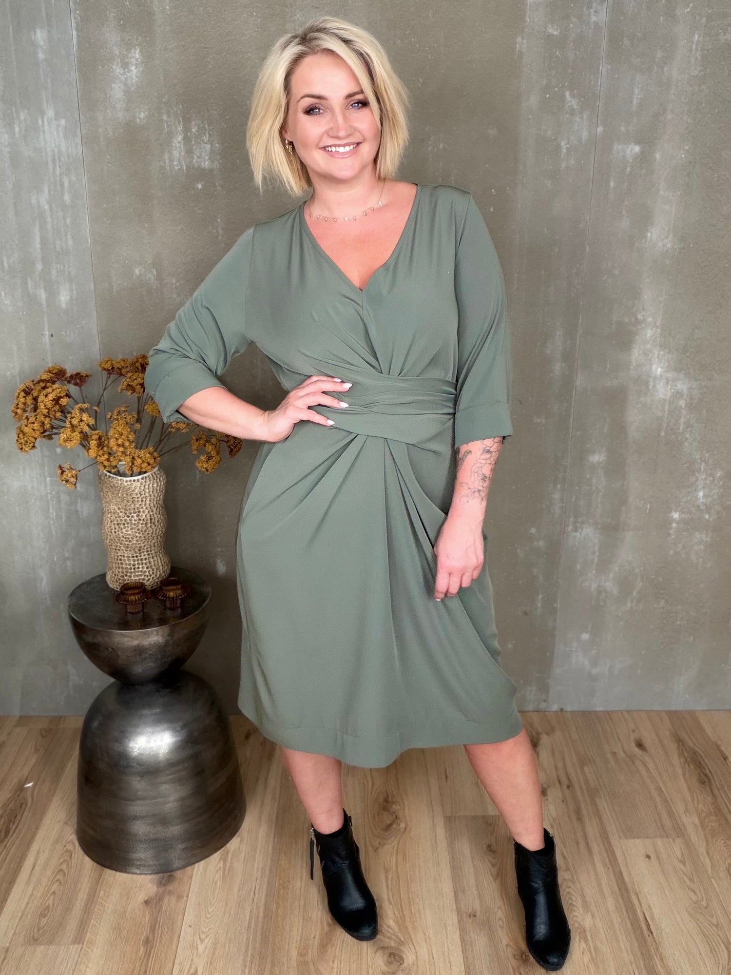 Stólpi er tímalaus og sniðugur kjóll með fallegu V-hálsmáli, kvart ermum með uppábroti og vösum í hlið! Hann er bundinn saman með hnút í mittið sem gefur fallegt form.