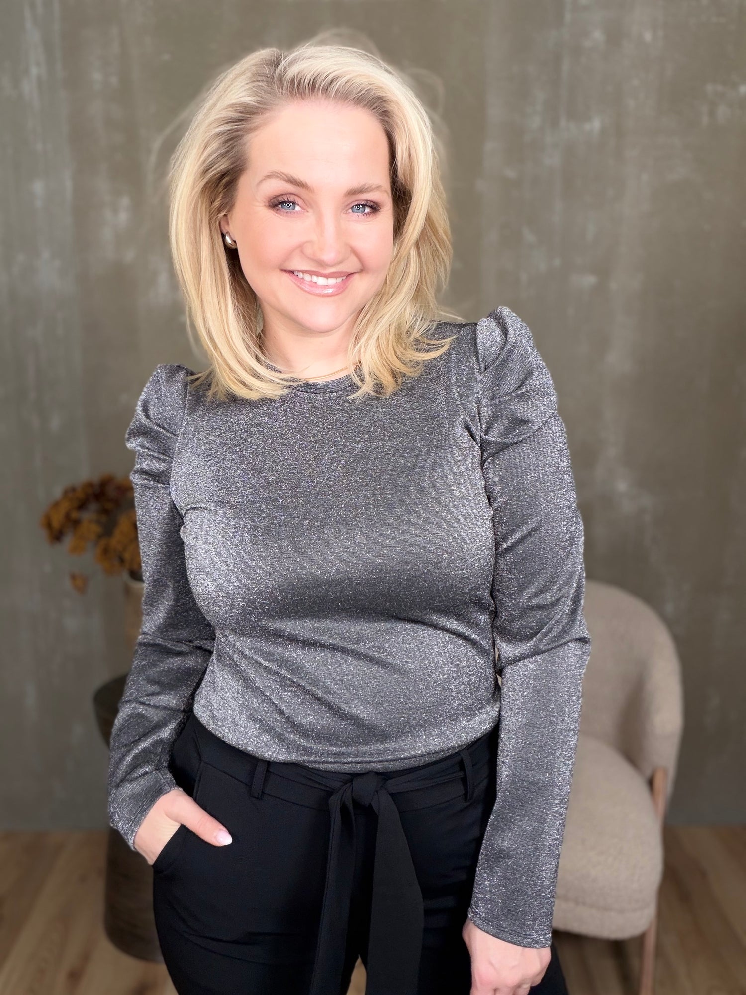 Hann er með púff ermum með meiri vídd yfir upphandleggi og þrengjast svo ermarnar niður að úlnlið. Hann liggur vel við kroppinn og sýnir fallegar kvenlegar línur, en hann er samt alls ekki níðþröngur. Sniðugur og klassískur toppur sem bæði er fallegt að girða ofan í buxur/pils eða hafa yfir.