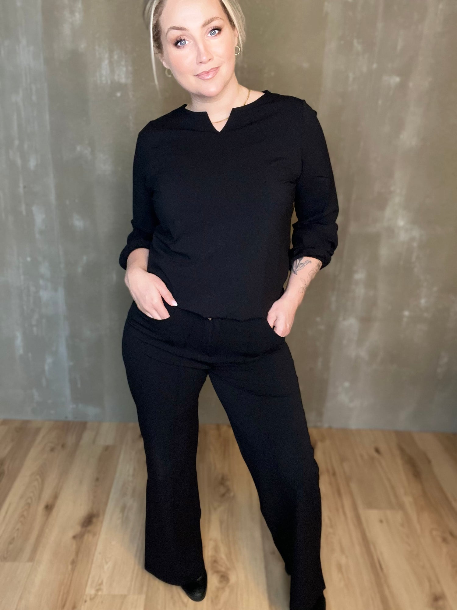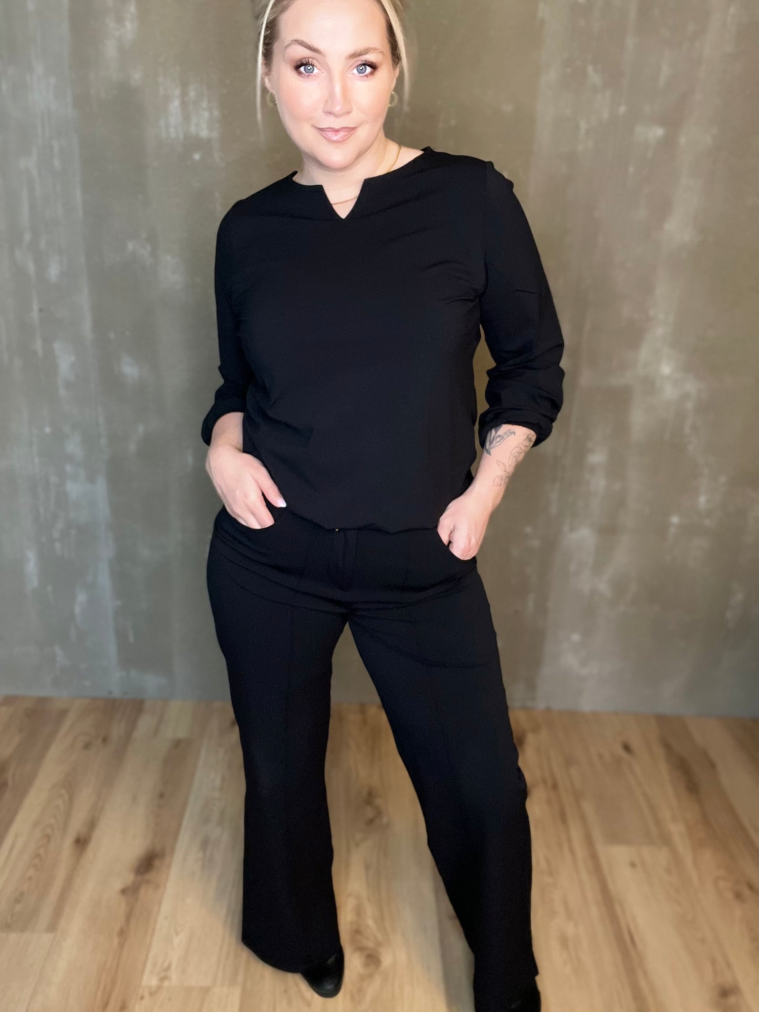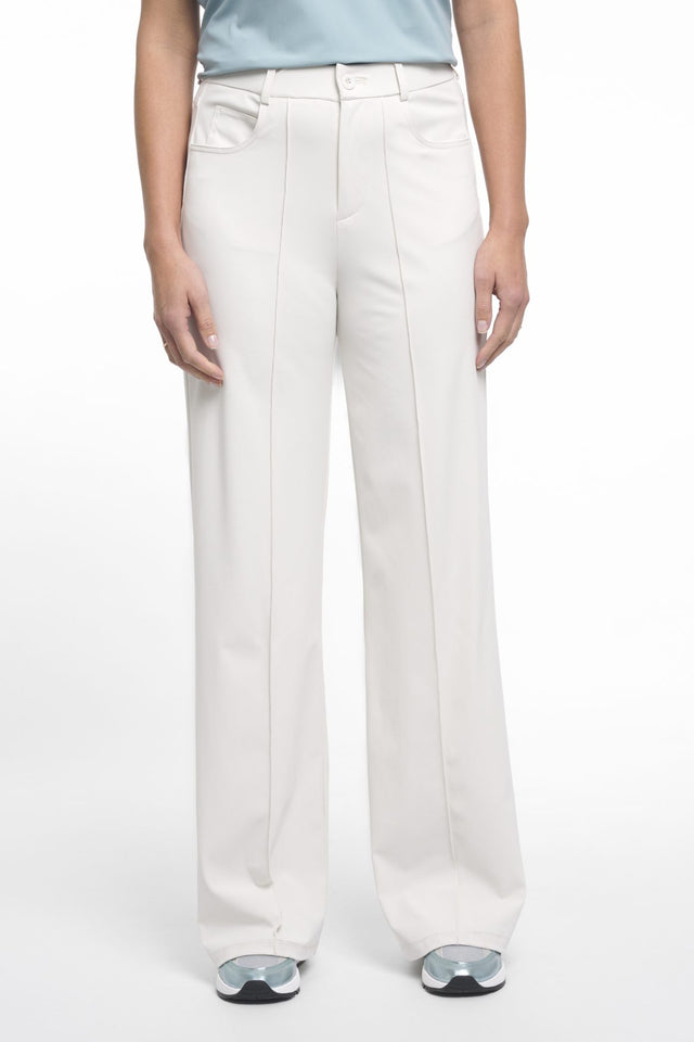 Beau eru víðar og sparilegar buxur úr travel efni með saumi niður framanverðar skálmar. Þær eru með rennilás í mitti og hliðarvösum. Á strengnum eru lykkjur fyrir belti.