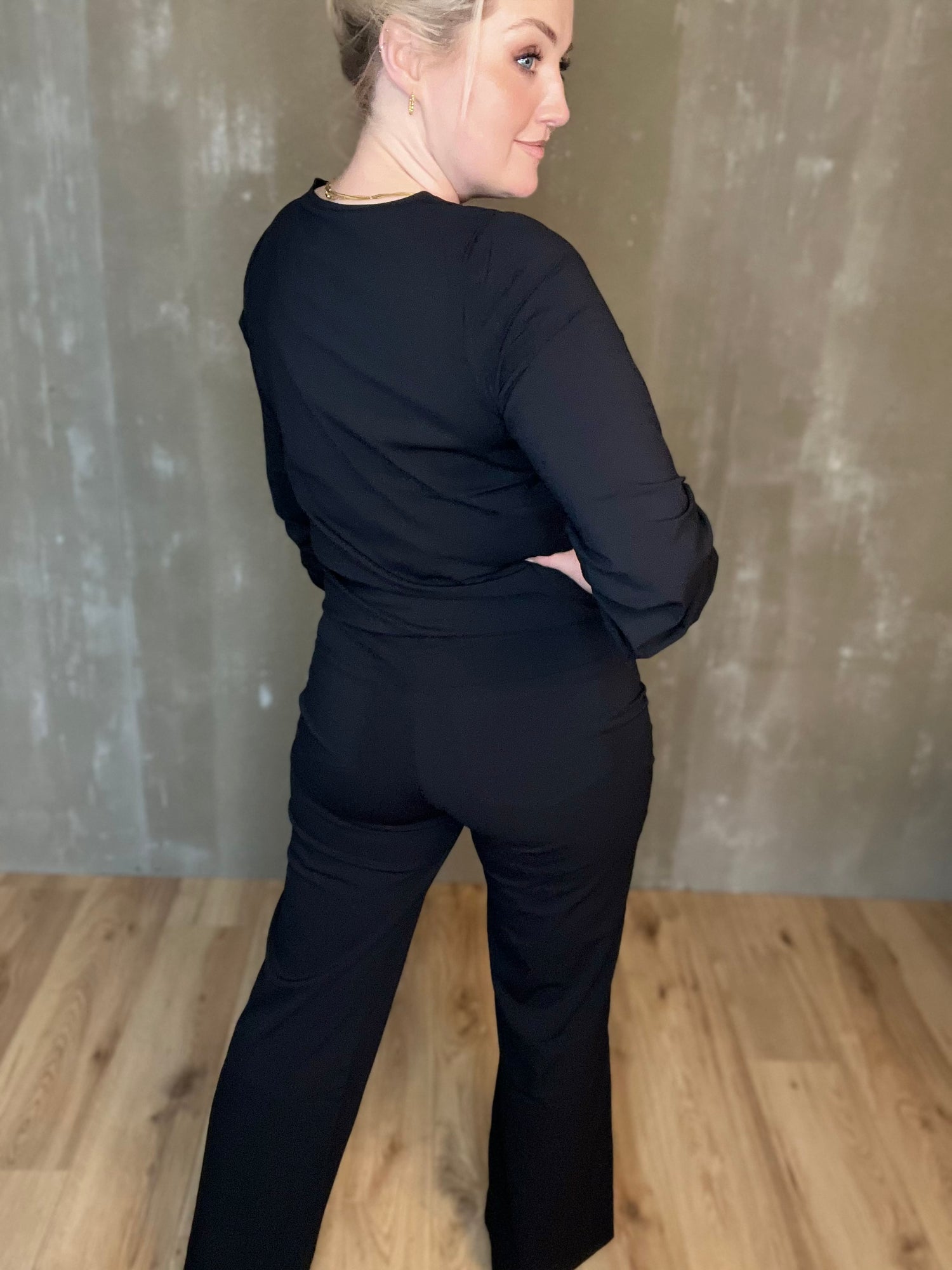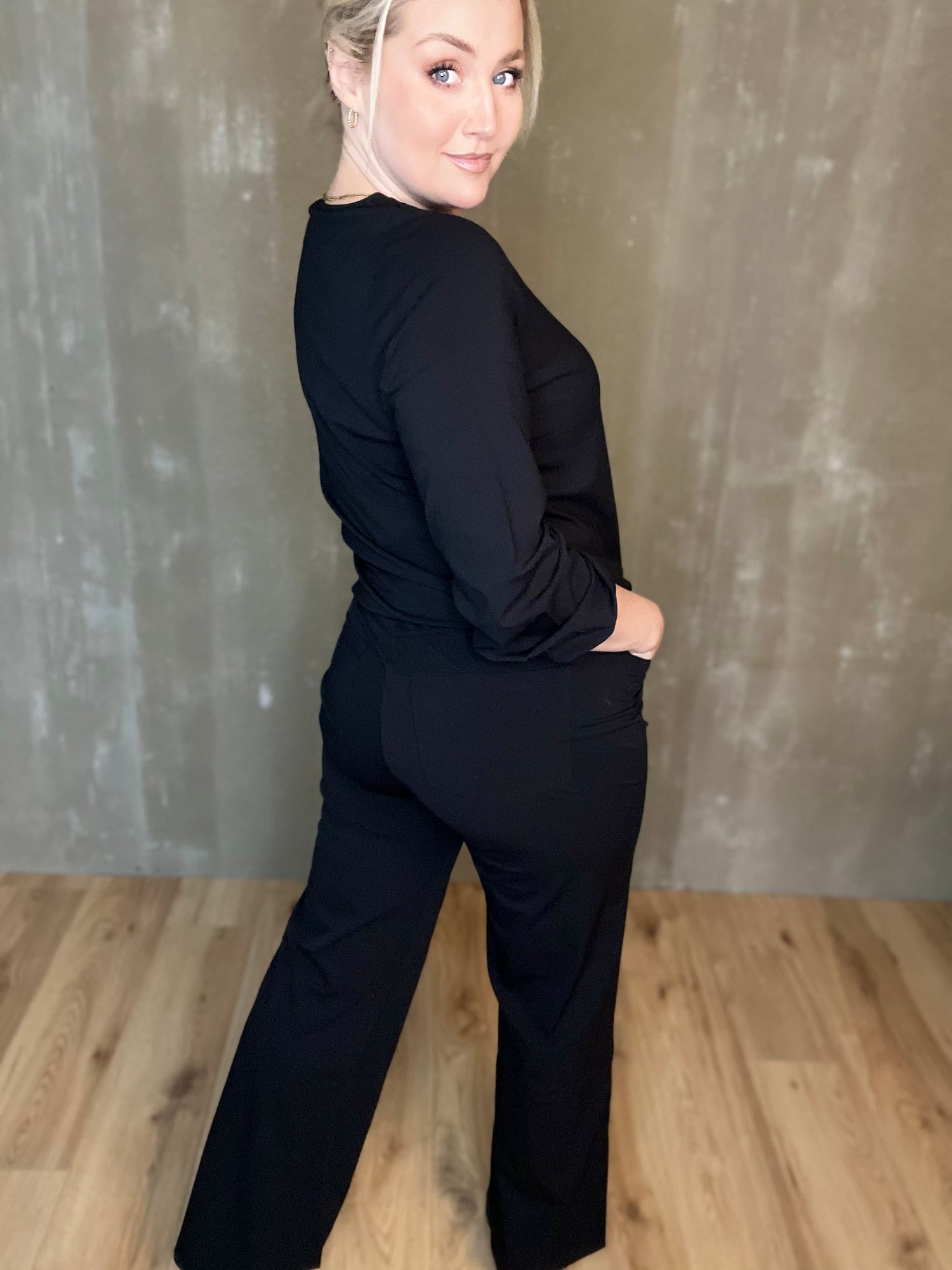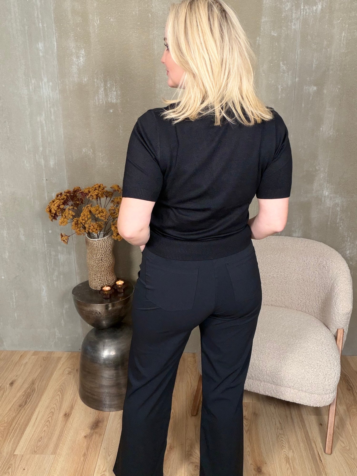Beau eru víðar og sparilegar buxur úr travel efni með saumi niður framanverðar skálmar. Þær eru með rennilás í mitti og hliðarvösum. Á strengnum eru lykkjur fyrir belti.