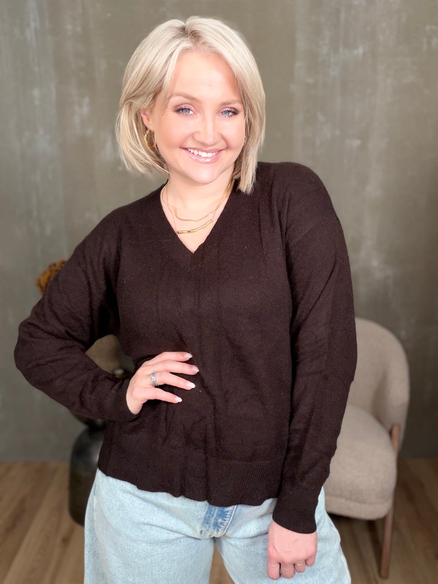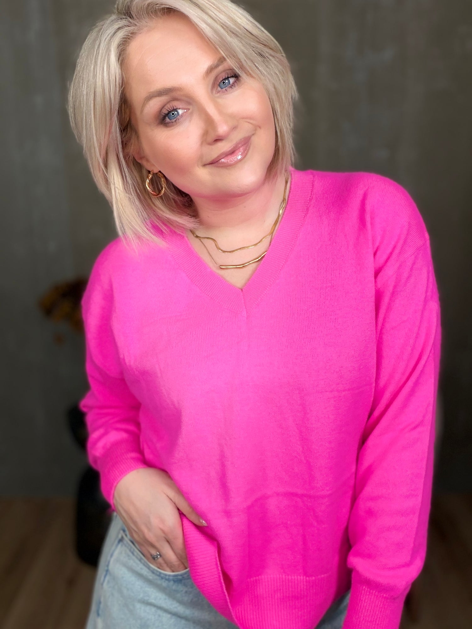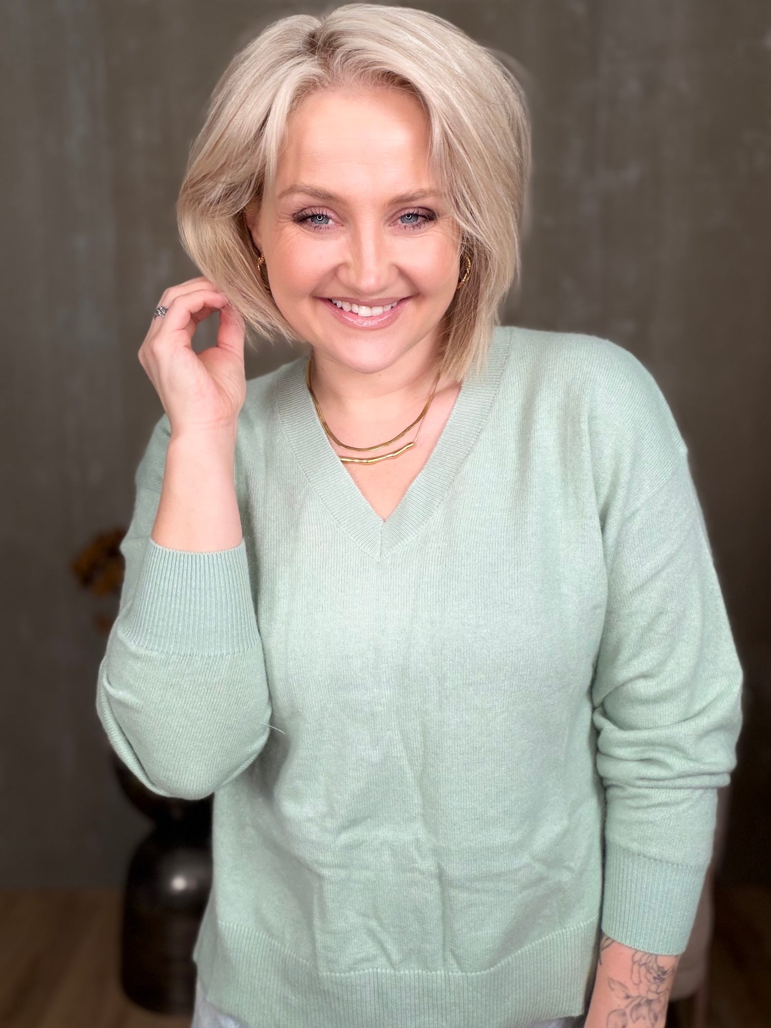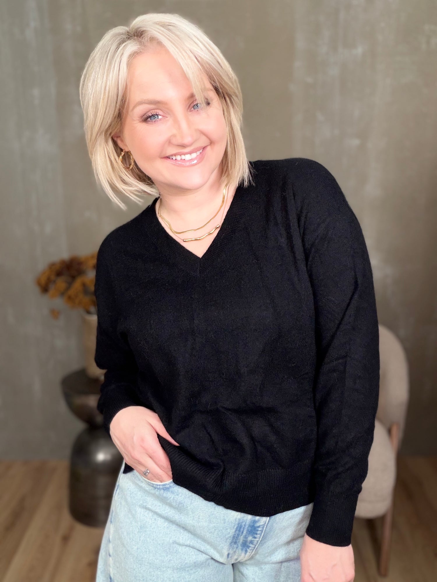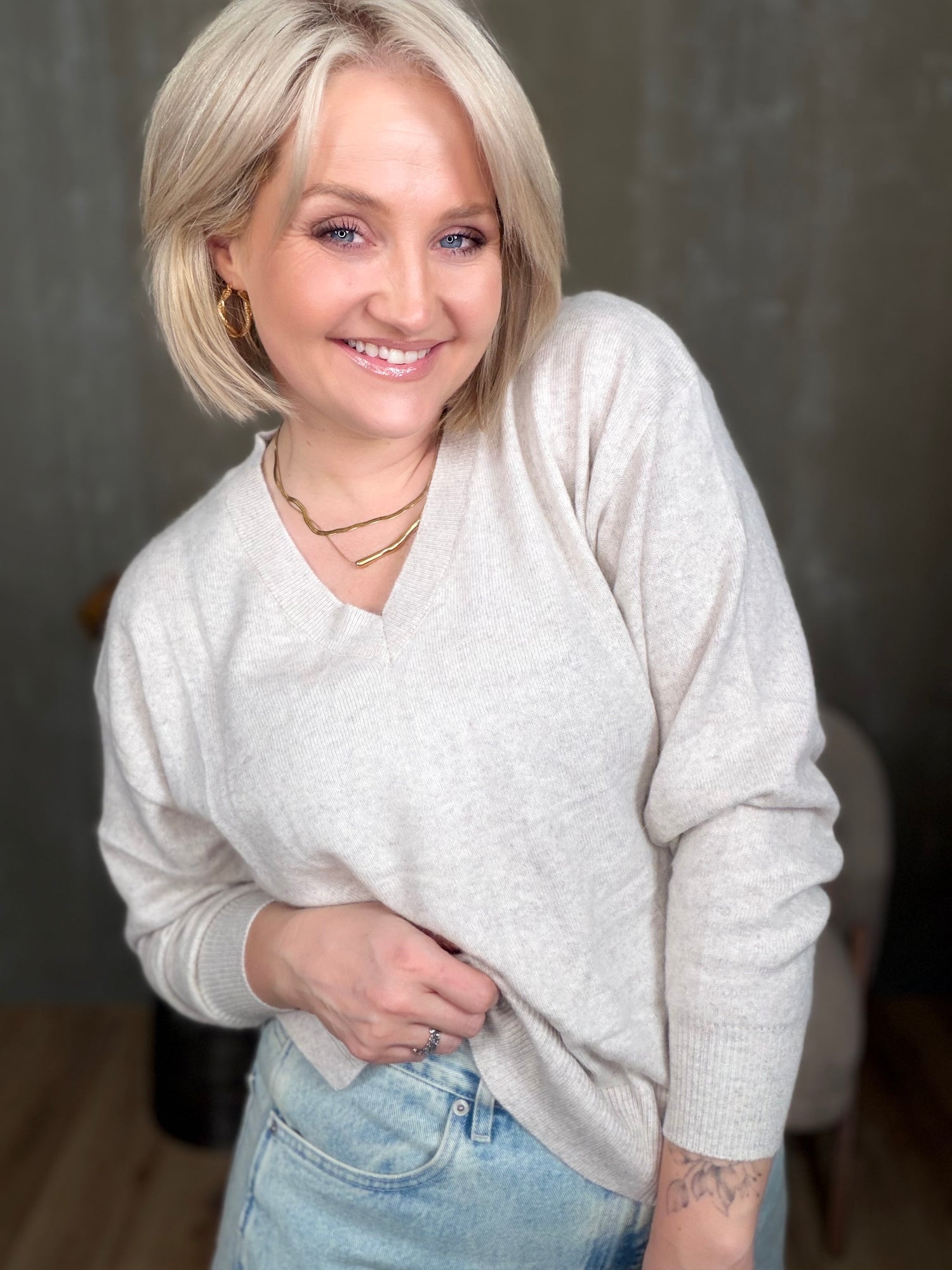 Boulder peysan kemur í 4 stærðum. Hún er með V hálsmáli og klaufum í hlið, með stroffi á ermum og prjónið er mjúkt og gott.