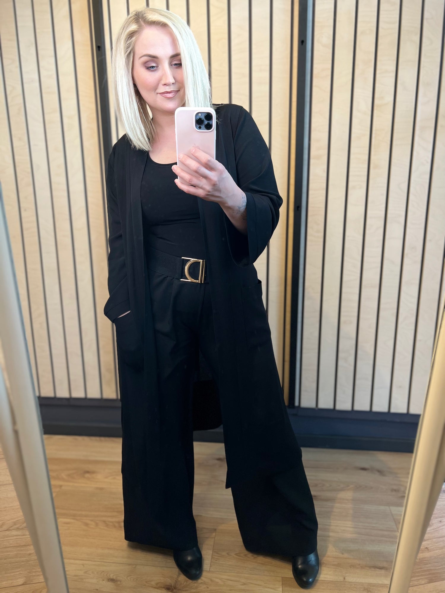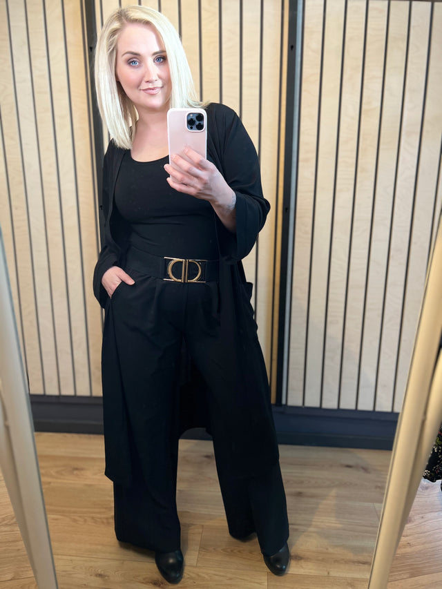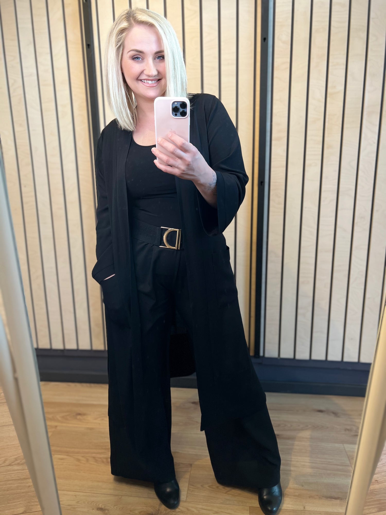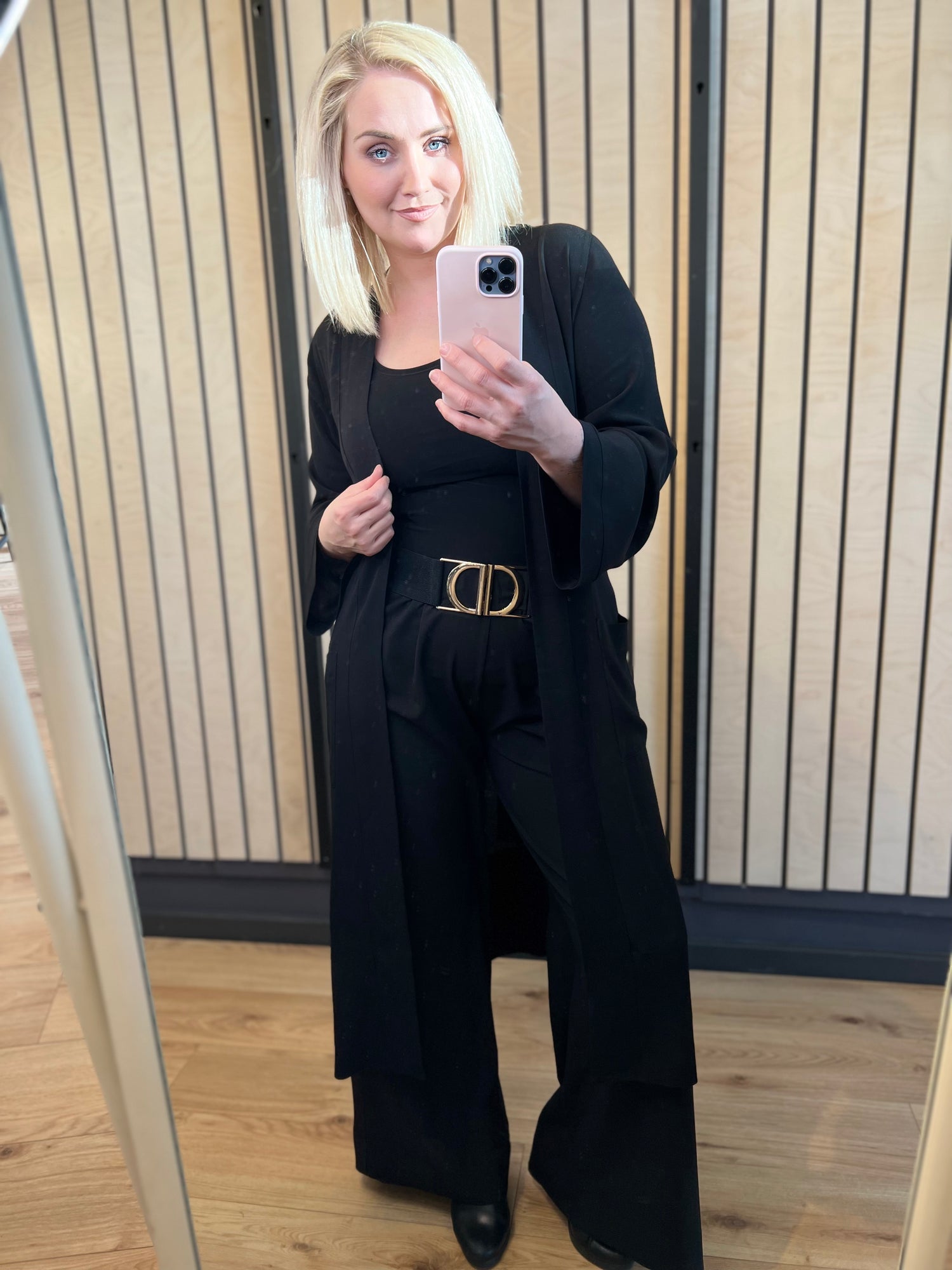 Efnið er þungt viscose sem fellur mjög vel. Að aftan er smá band sem hugsað er til að hafa bundið að aftan en einnig er hægt að skipta því út fyrir belti og festa hann þá niður við kroppinn. Tímalaus flík sem getur poppað upp hvaða átfitt sem er, hvort sem hún sé pöruð við gallabuxur og topp eða sparilegan kjól!