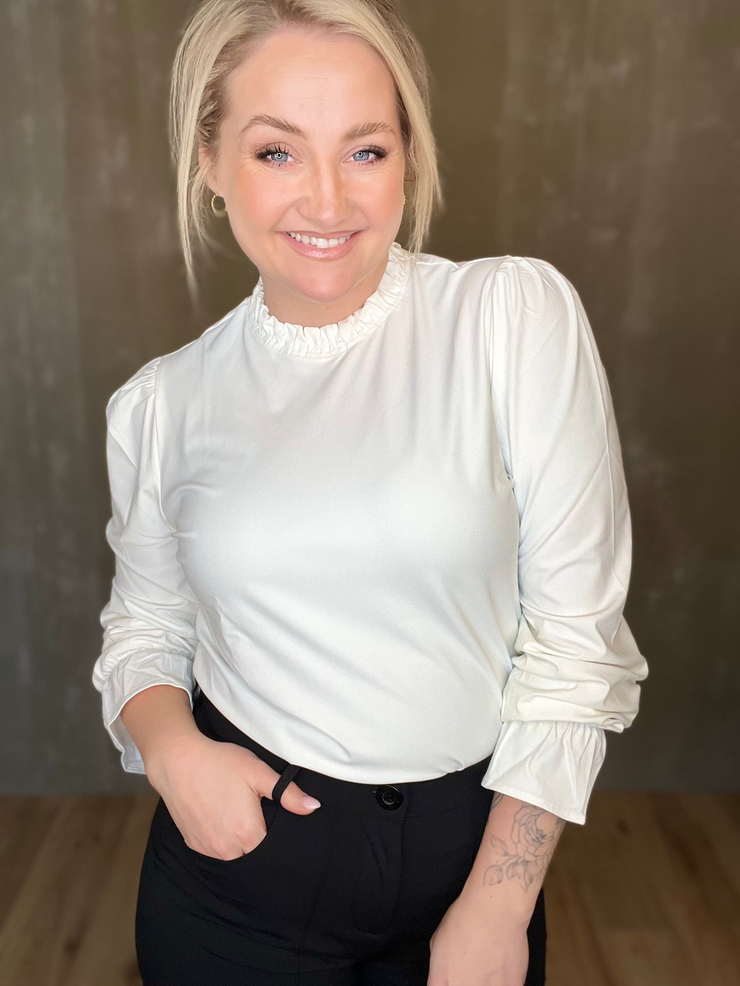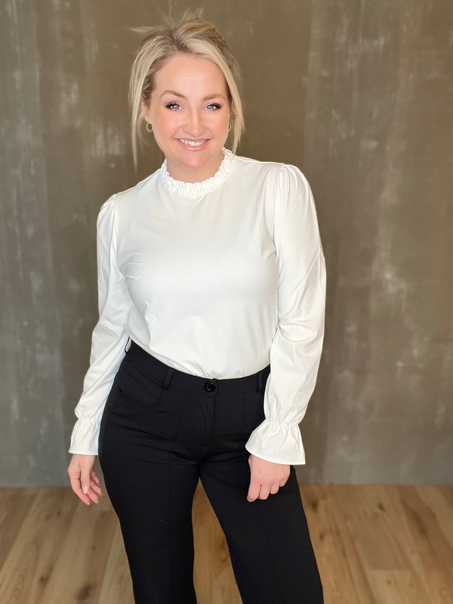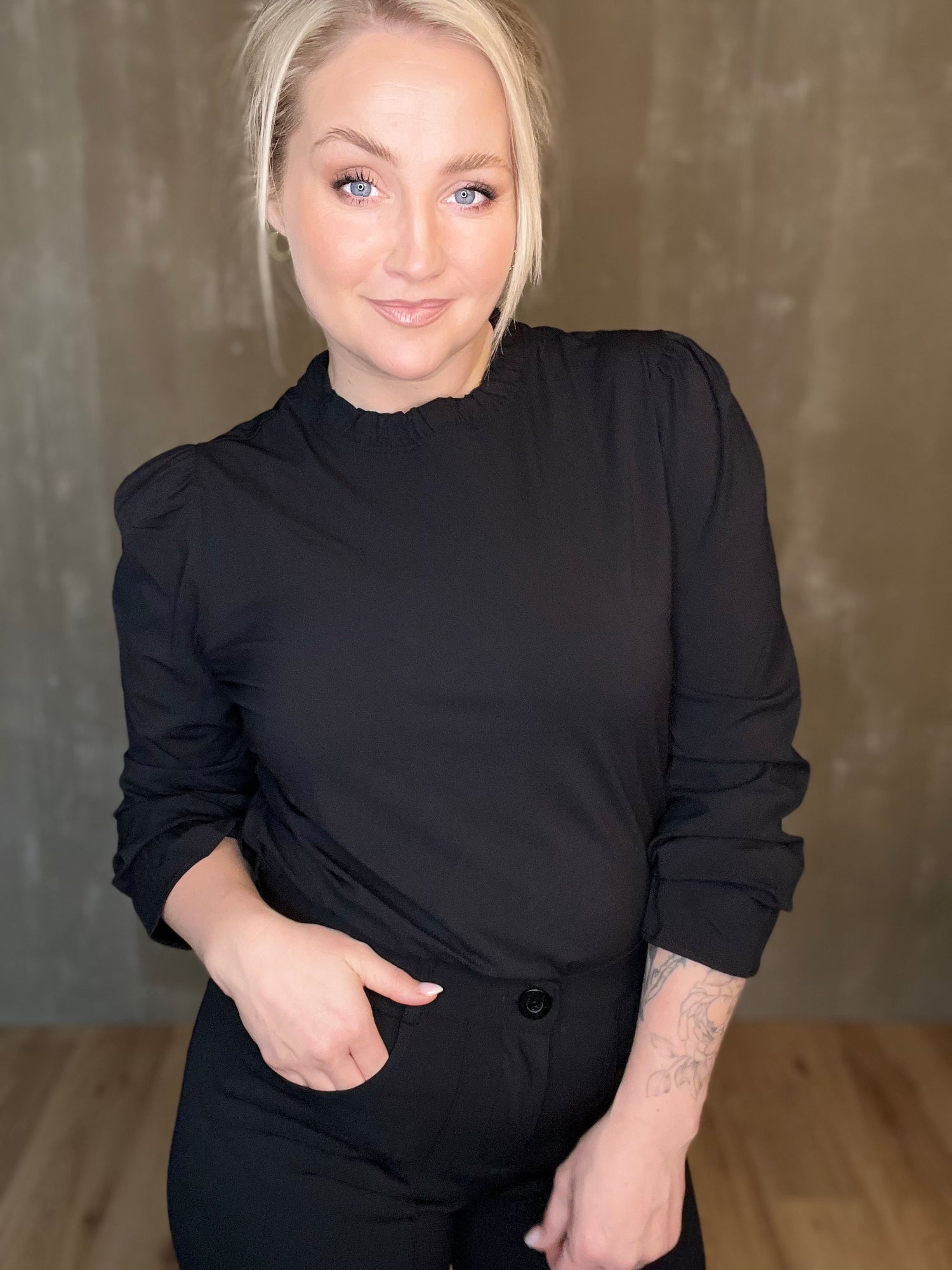 Glæsileg blússa frá Zoso úr hágæða travel-efni! Jeyda Fancy Travel blússan er með fallegum smáatriðum eins og rykktum kraga og ermum en teygjan fremst á ermunum er þægileg og mjúk sem gerir það auðvelt að draga hana upp í kvart ef vill. Púffermar, falleg vídd sem einnig er smart að girða ofan í mitta, við erum að elska þessa!
