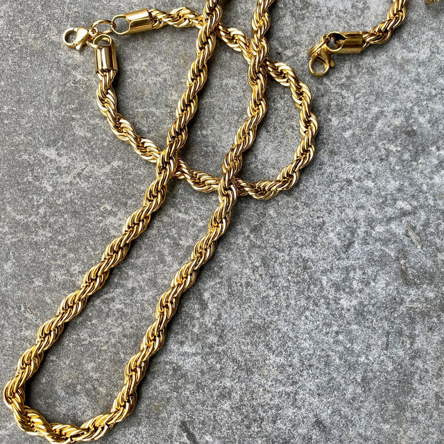 Hér er nýtt herrasett á ferðinni en það samanstendur af armbandi og hálsmeni sem hentar vel á töffarana eða þá sem vilja gróft skart. Armbandið er 23 cm langt og hálsmen 66 cm langt. Ryðfrítt gullhúðað stál og mjög vegleg keðja með smá kaðlamynstri.
