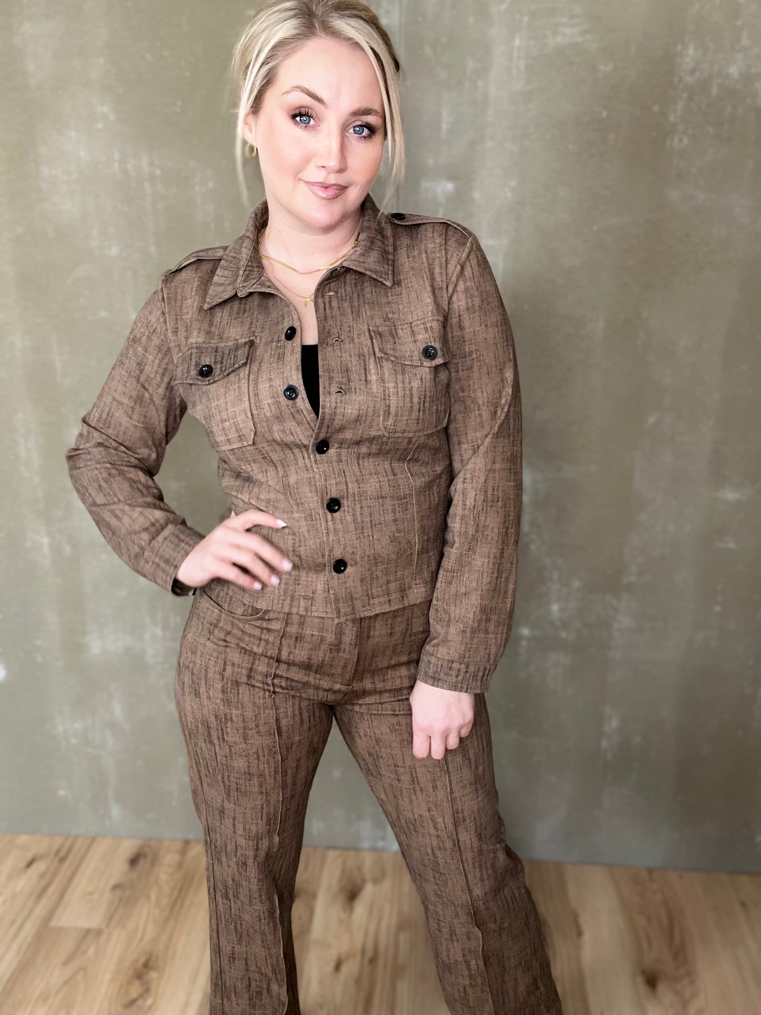 Milou jakkinn er úr sterku efni, með svörtum tölum og tveimur brjóstvösum. Hann passar einstaklega vel við Megan buxurnar fyrir fullkomið “complete outfit”! Töffaralegur efri partur sem eiginlega mitt á milli þess að vera skyrta og buxur. Bæði smart hafður opinn sem og lokaður.