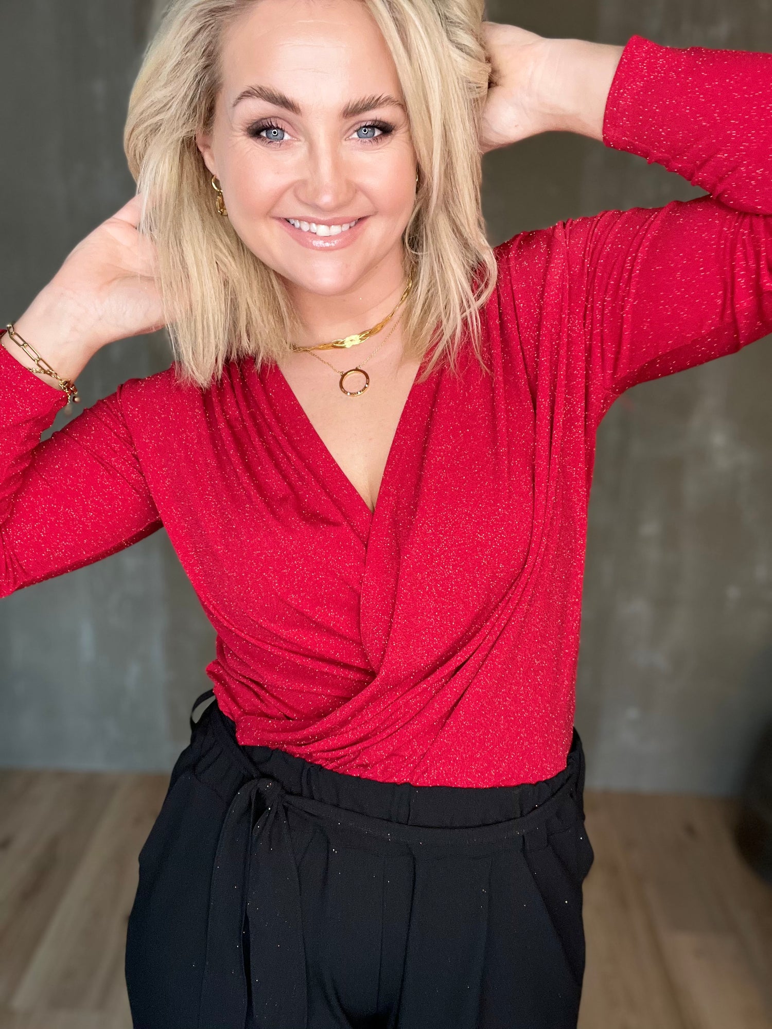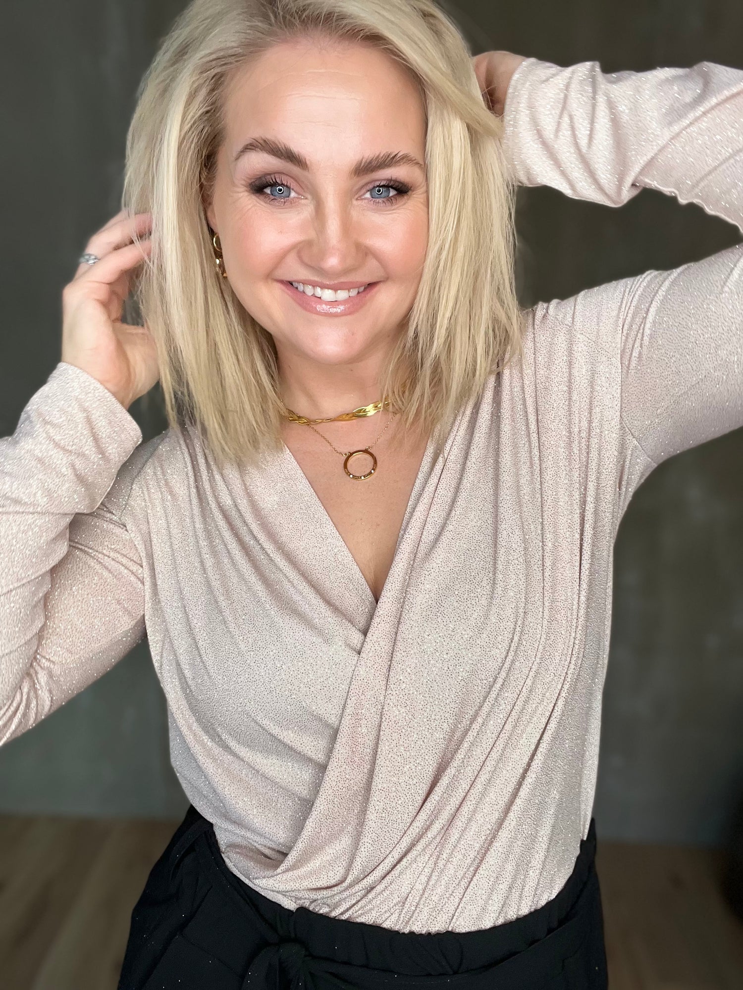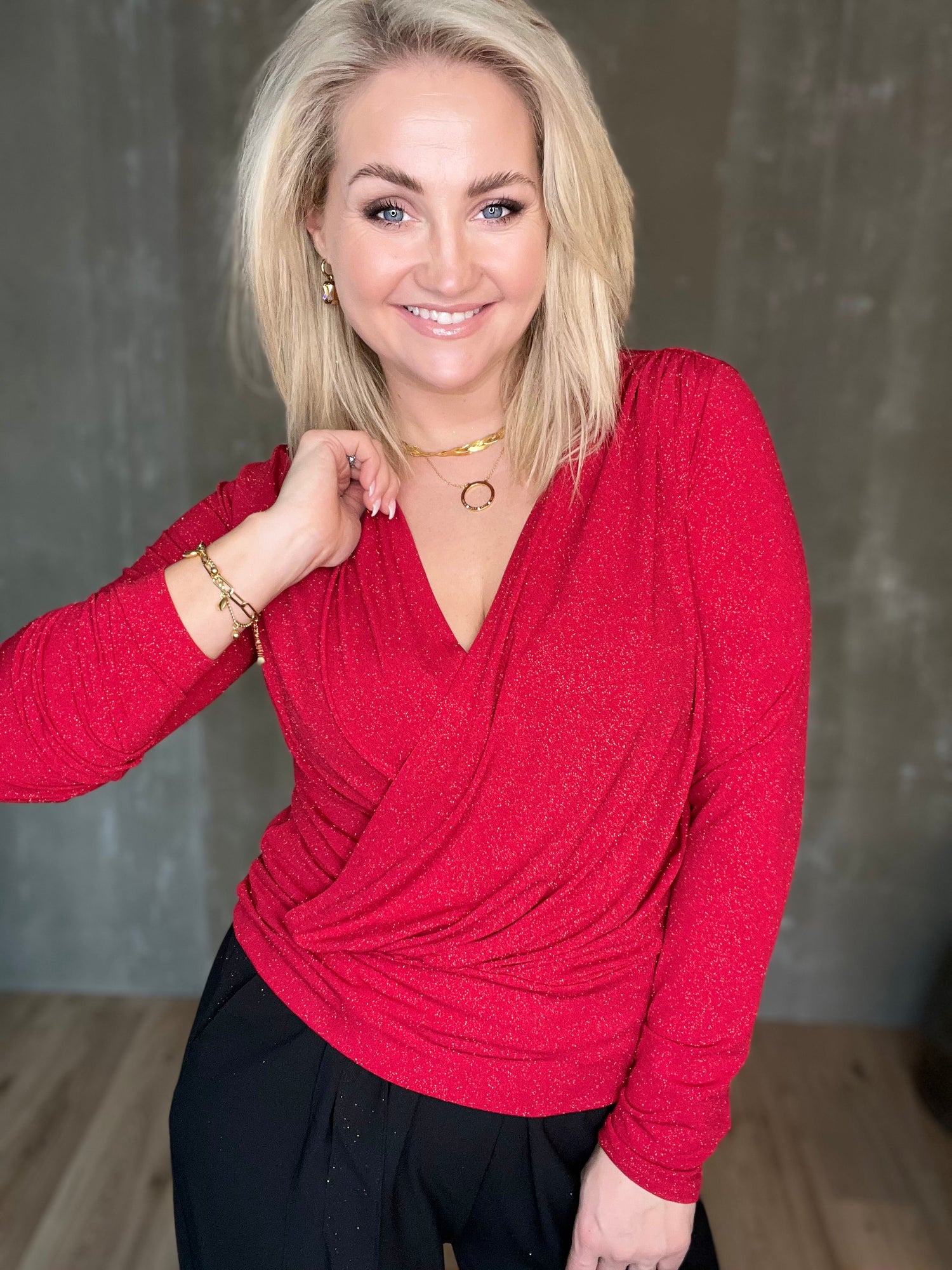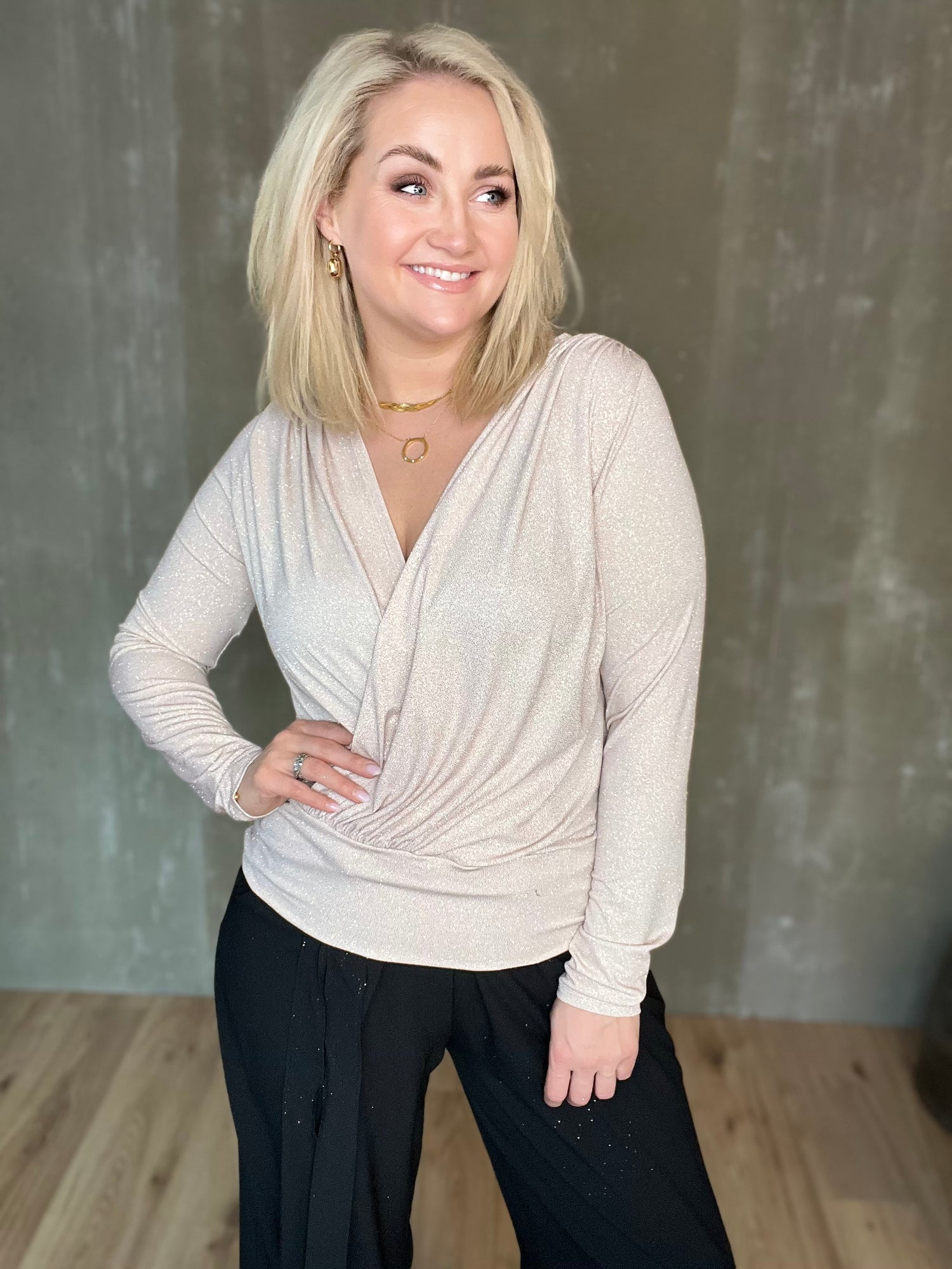 Vöndur topparnir eru dásamlega þægilegir og sparilegir efri partar. Þeir eru úr mjúku og teygjanlegu efni og framstykkin liggja í víxl að framan, neðan svo hægt er að girða þá í buxur eða pils. Bakið er með aukinni vídd og eru þeir með þröngum ermum.