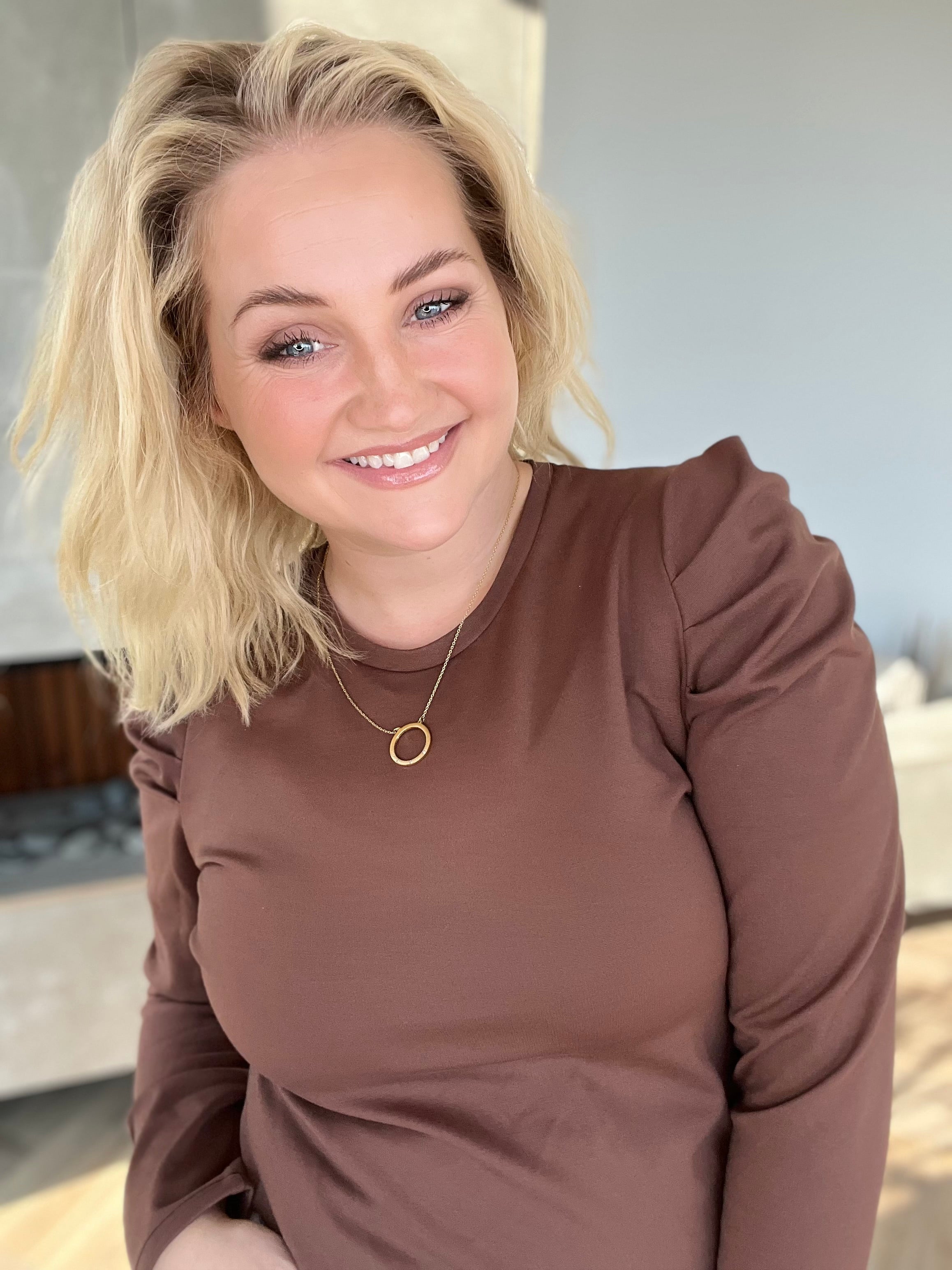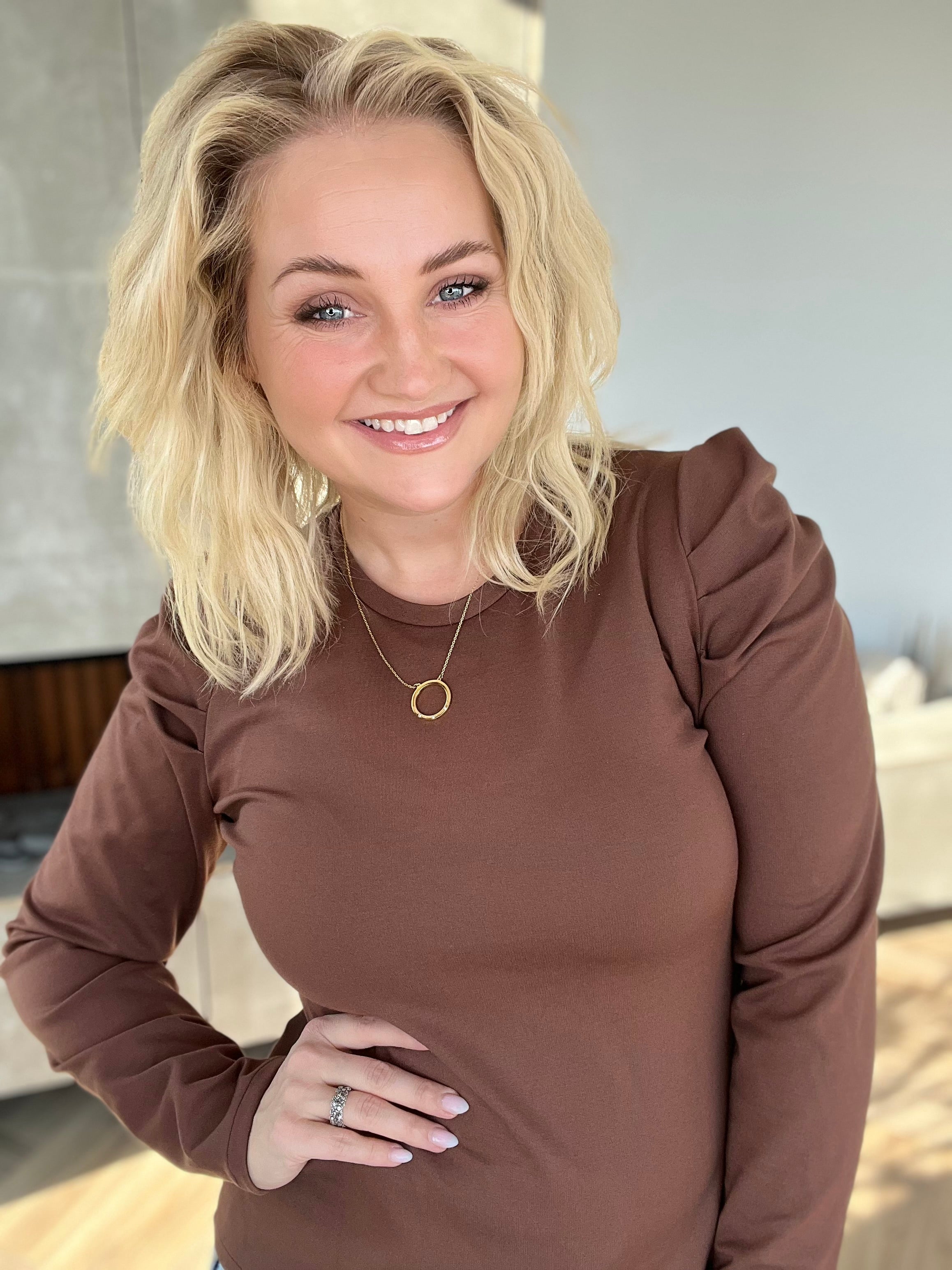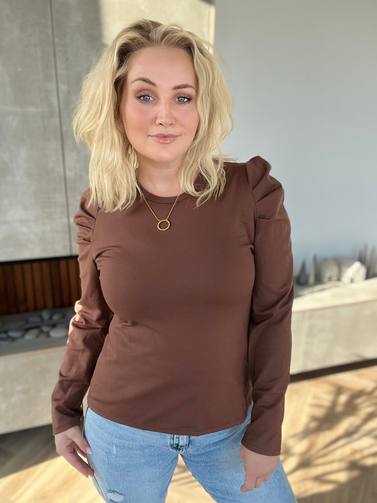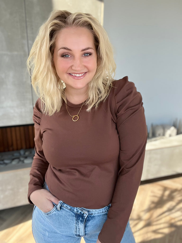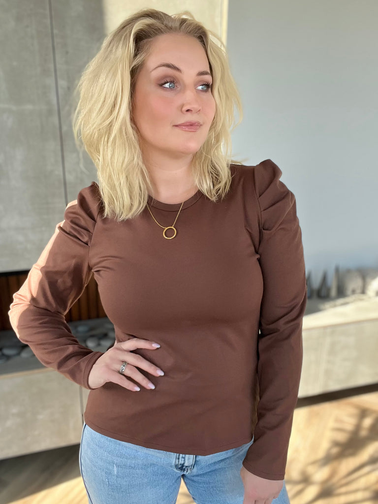 Hann er með púff ermum með meiri vídd yfir upphandleggi og þrengjast svo ermarnar niður að úlnlið. Hann liggur vel við kroppinn og sýnir fallegar kvenlegar línur, en hann er samt alls ekki níðþröngur. Sniðugur og klassískur toppur sem bæði er fallegt að girða ofan í buxur/pils eða hafa yfir.