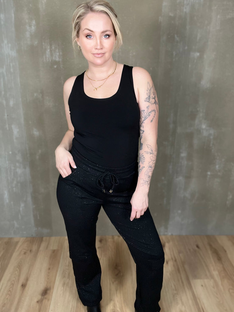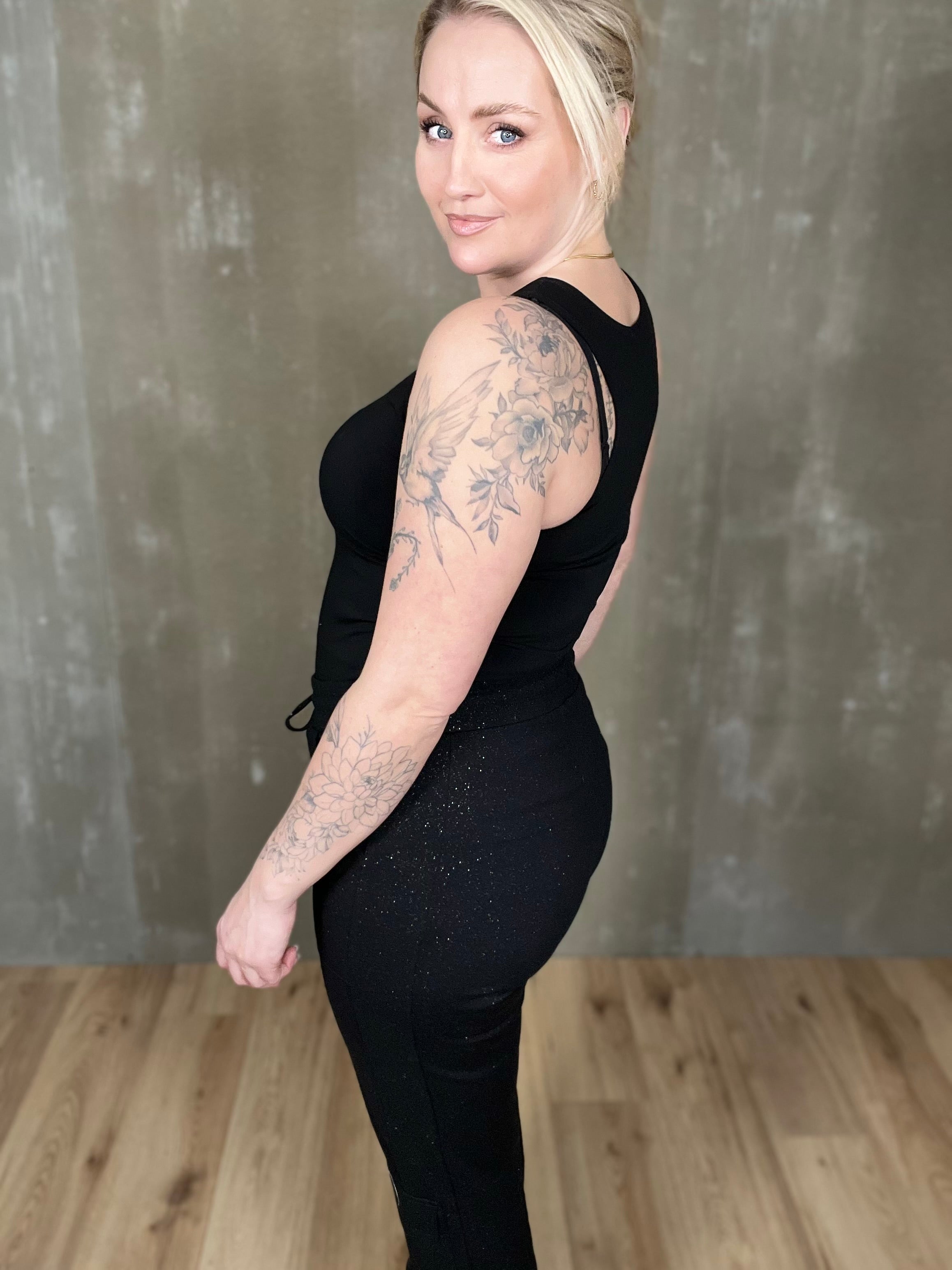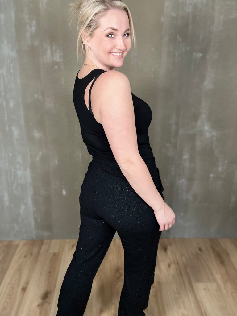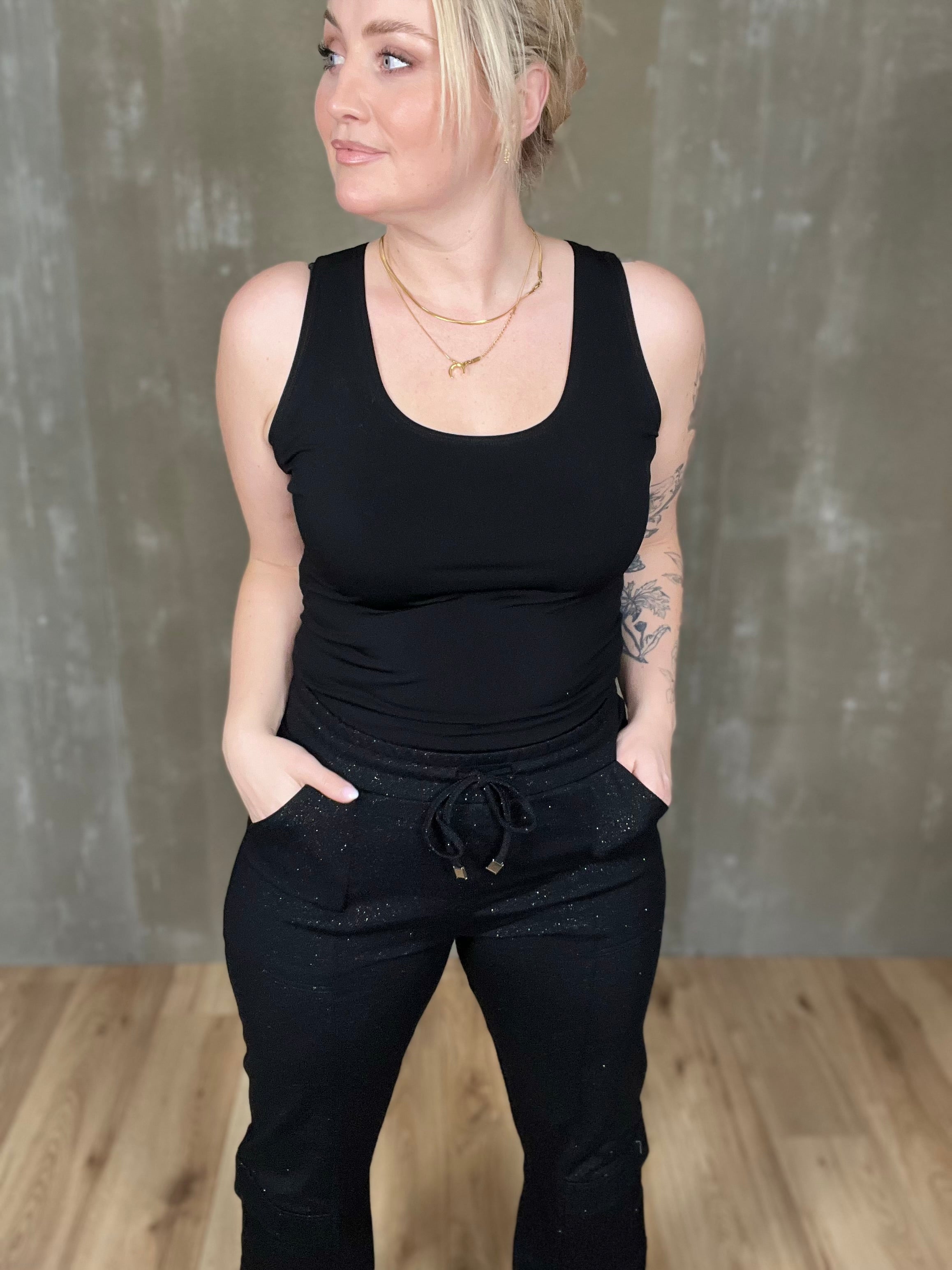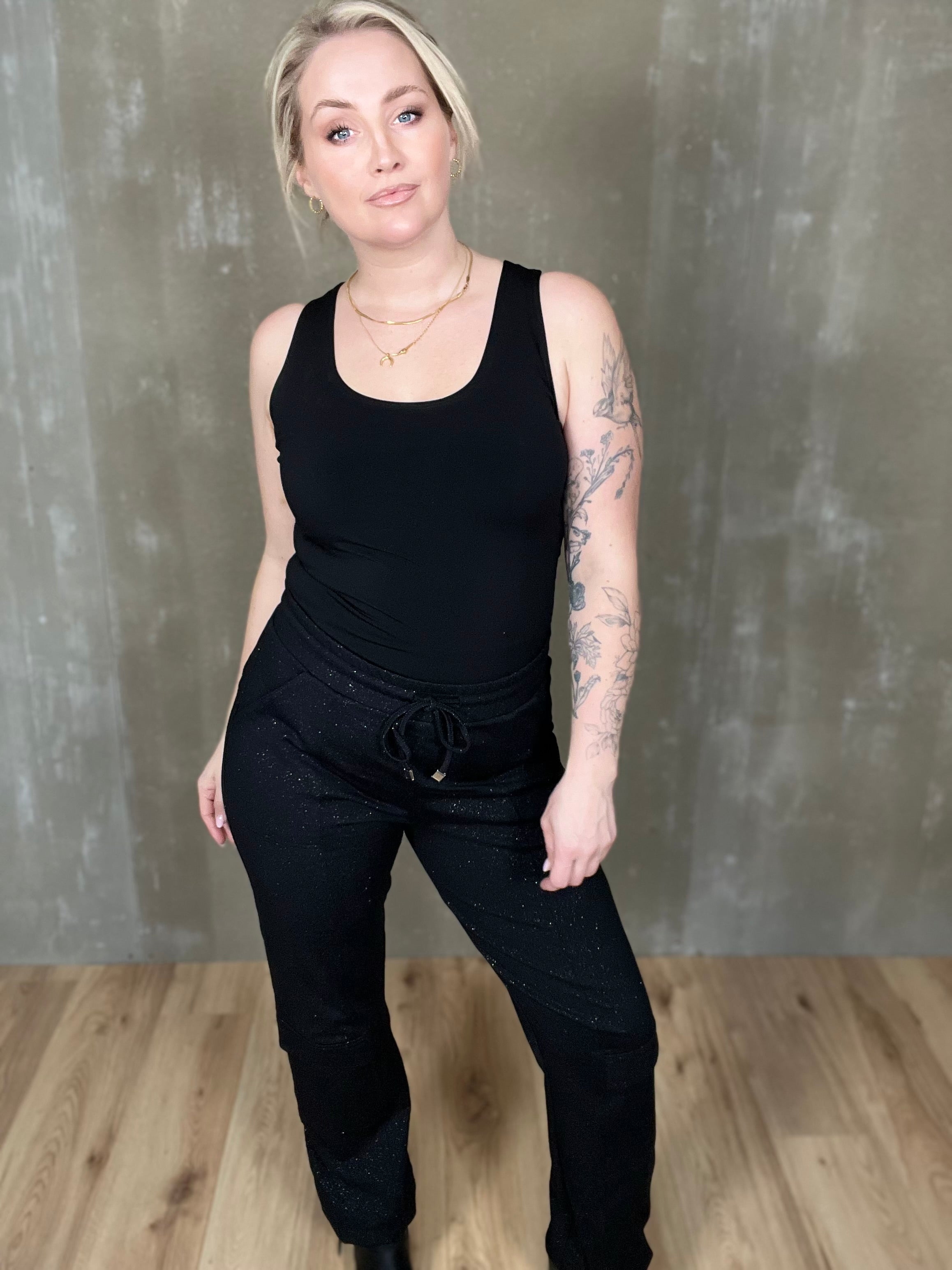 Maya buxurnar eru töffaralegar cargo buxur með glitri með góðum vösum og streng með teygju sem og stillanlegri snúru. Þær eru partur af setti en standa svo sannarlega líka einar og sér. Þær eru úr mjúku ponte efni með góðri teygju, efnið er þó líka með hellings burði og heldur sér vel. Þessar eru með teygju að neðan, eru vel síðar og vösum á hliðinni á skálmunum frekar neðarlega, hrikalega töff!
