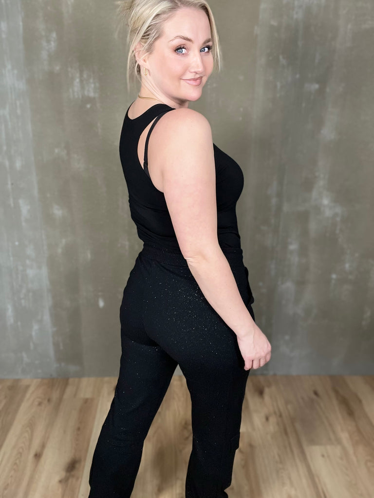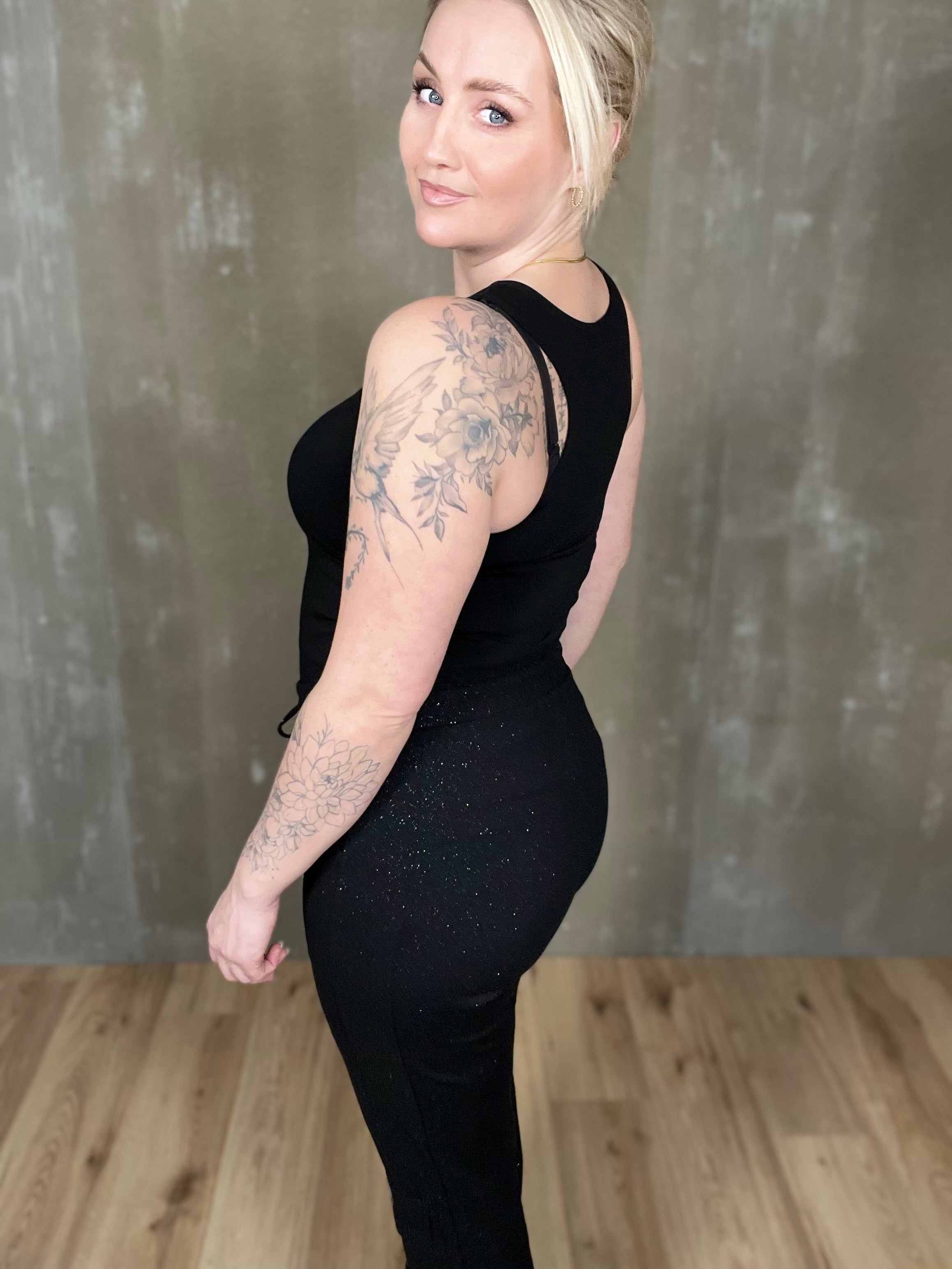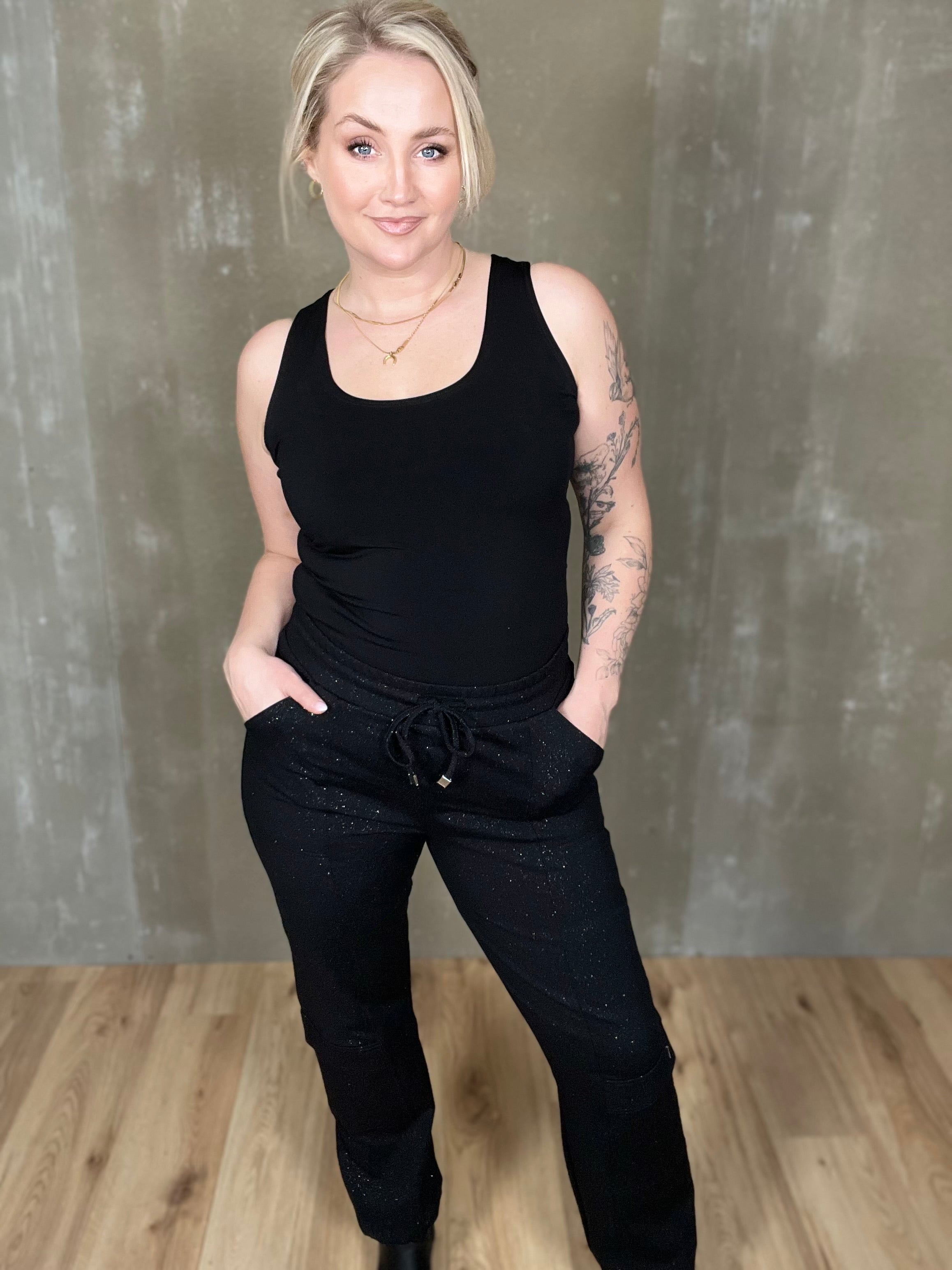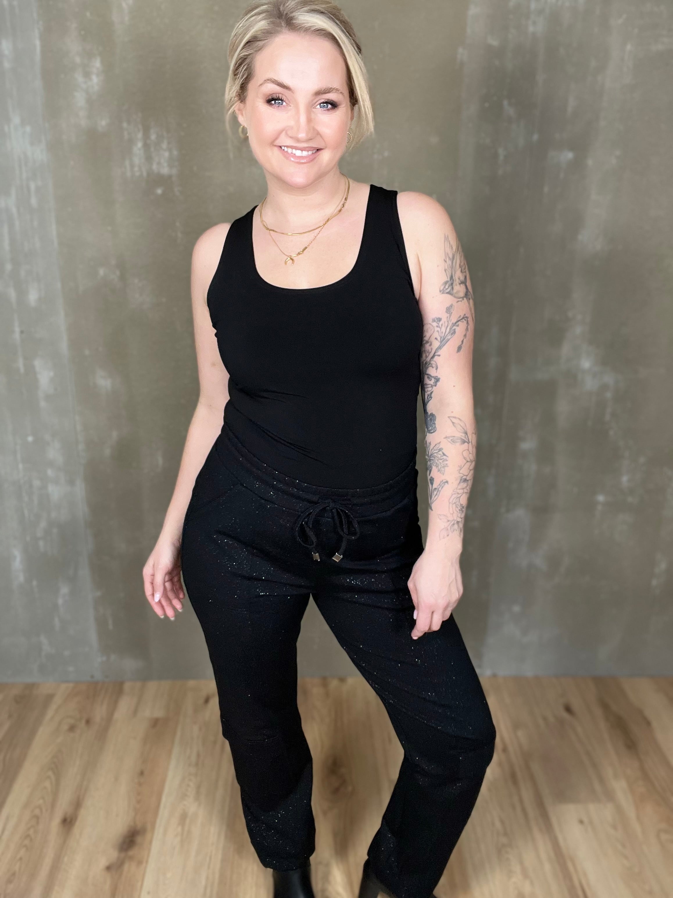 Maya buxurnar eru töffaralegar cargo buxur með glitri með góðum vösum og streng með teygju sem og stillanlegri snúru. Þær eru partur af setti en standa svo sannarlega líka einar og sér. Þær eru úr mjúku ponte efni með góðri teygju, efnið er þó líka með hellings burði og heldur sér vel. Þessar eru með teygju að neðan, eru vel síðar og vösum á hliðinni á skálmunum frekar neðarlega, hrikalega töff!