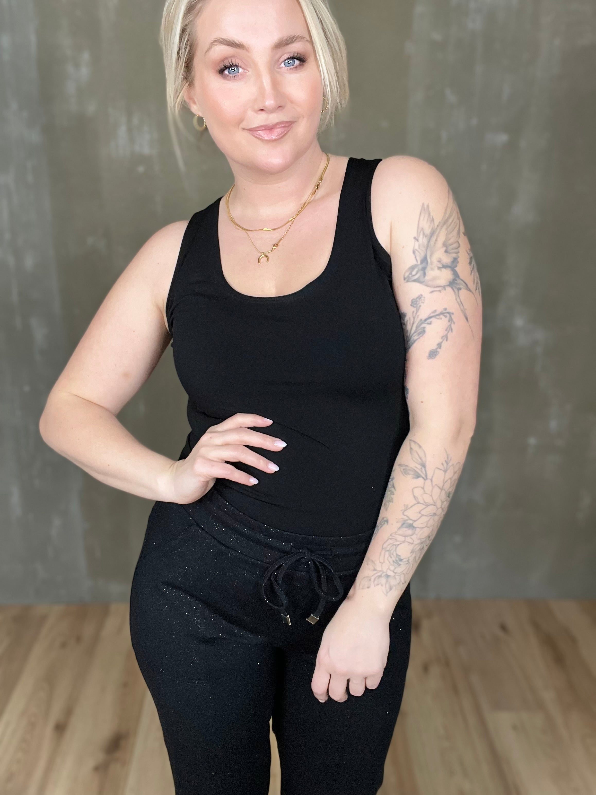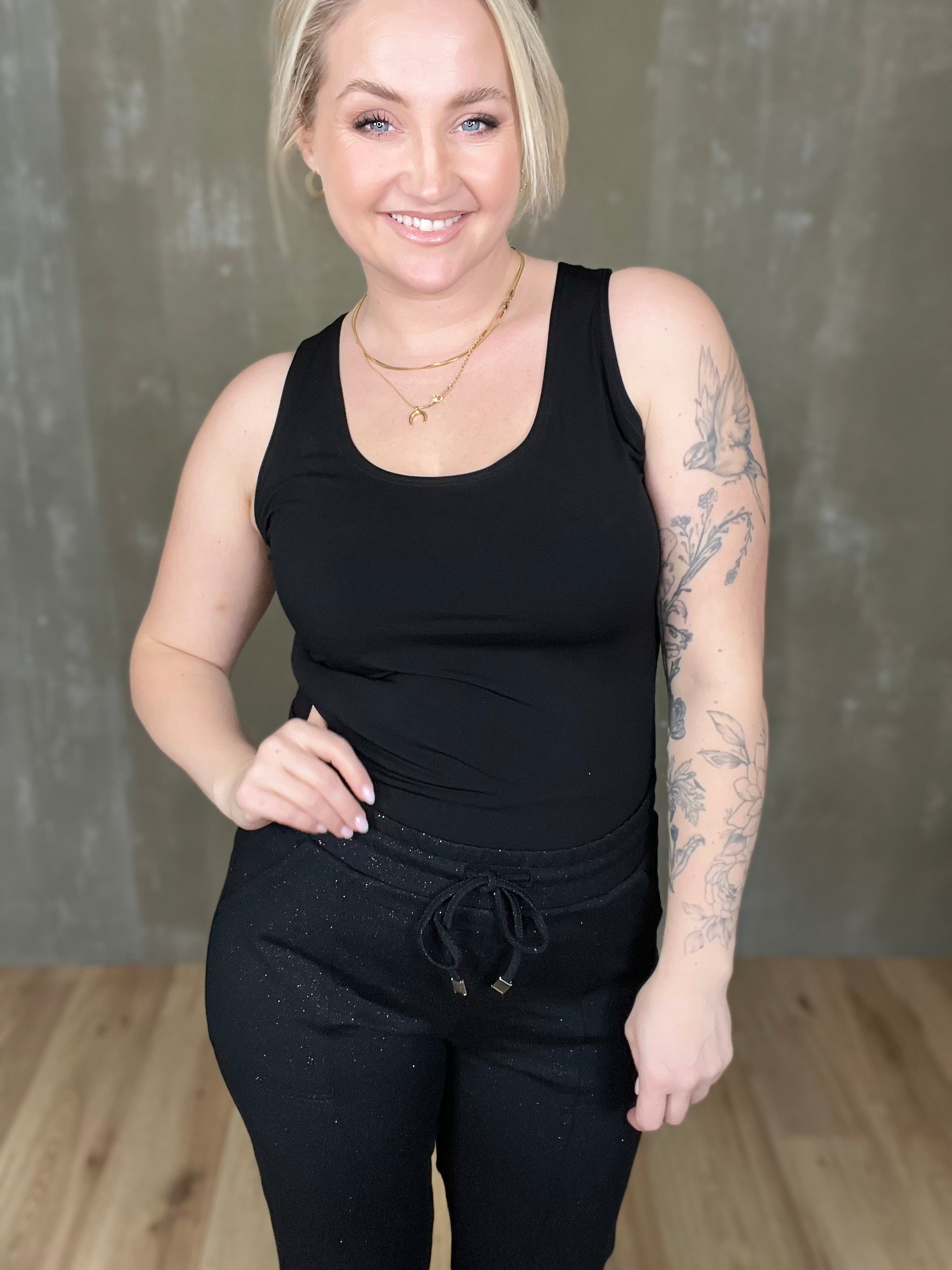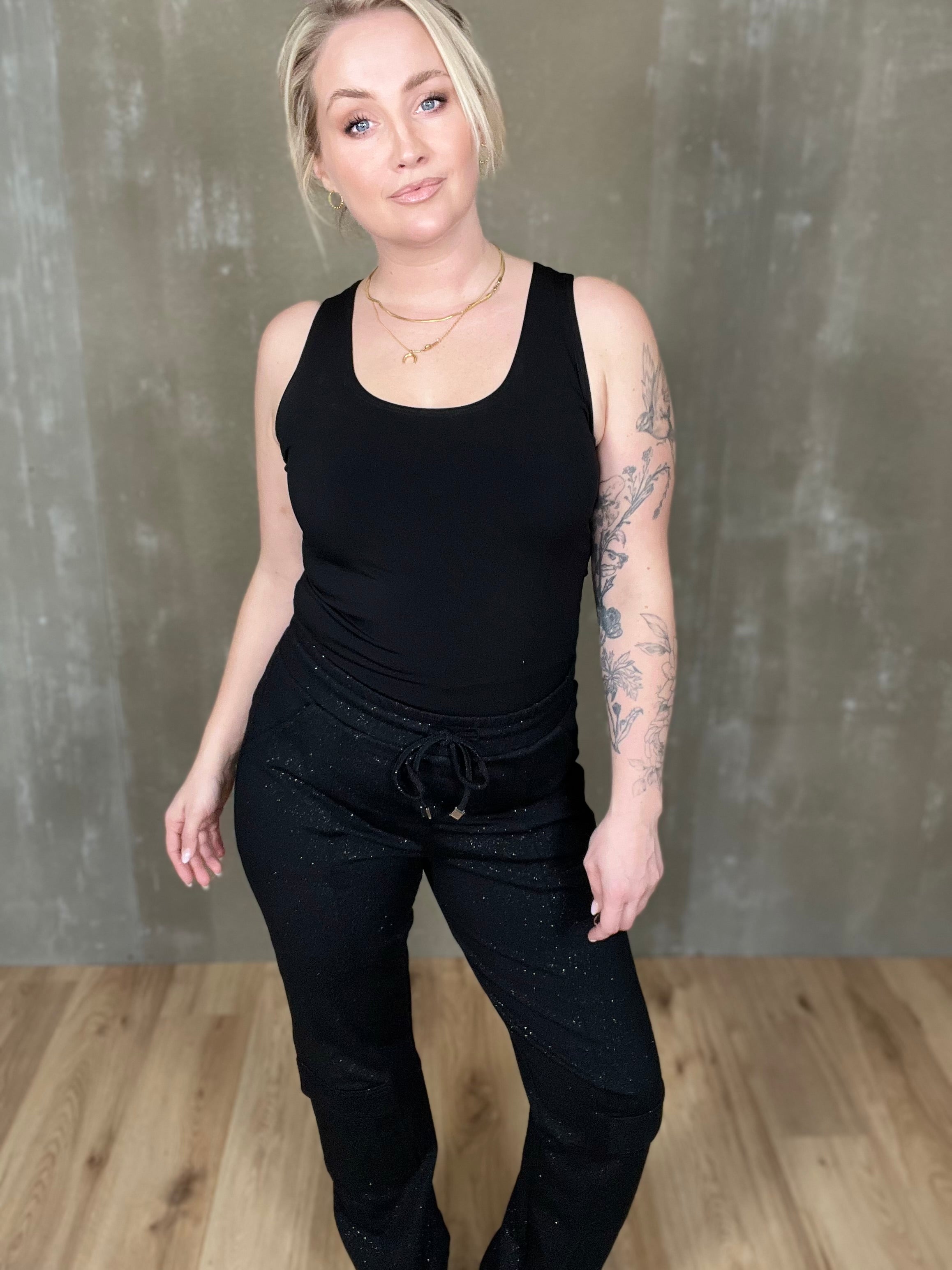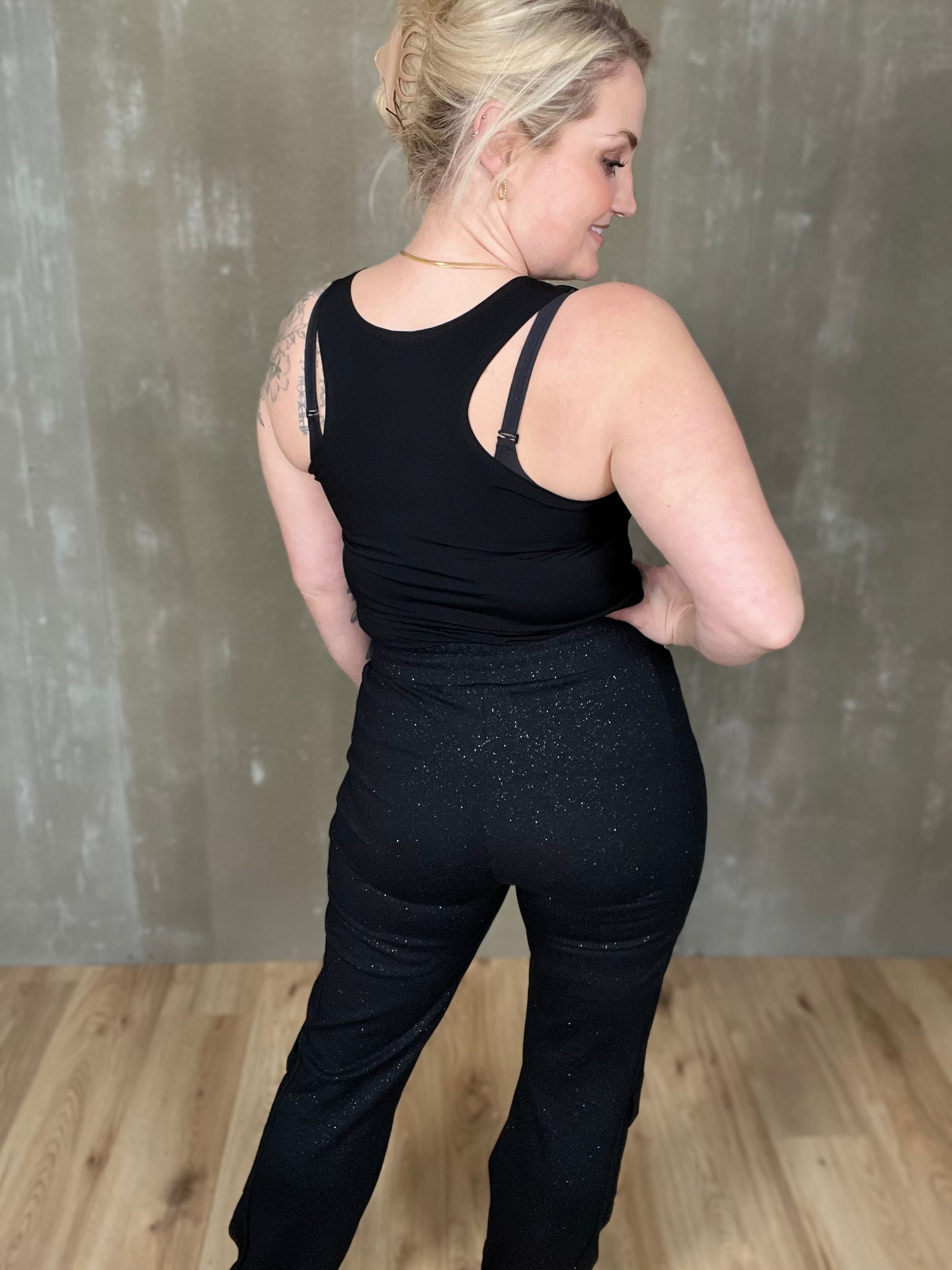 Maya buxurnar eru töffaralegar cargo buxur með glitri með góðum vösum og streng með teygju sem og stillanlegri snúru. Þær eru partur af setti en standa svo sannarlega líka einar og sér. Þær eru úr mjúku ponte efni með góðri teygju, efnið er þó líka með hellings burði og heldur sér vel. Þessar eru með teygju að neðan, eru vel síðar og vösum á hliðinni á skálmunum frekar neðarlega, hrikalega töff!