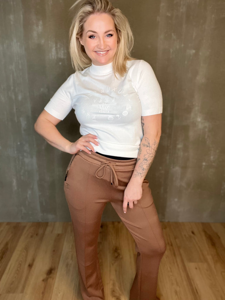 Bonny eru einstaklega léttar og þægilegar sport buxur með teygju og reim í mittinu. Þær eru með renndum hliðarvösum og saum niður miðja skálm að framan. Örlítið útvíðar skálmar, sportlegar og um leið stílhreinar. Efnið er einstaklega mjúkt og notalegt og mun mýkra en hefðbundið viscose.