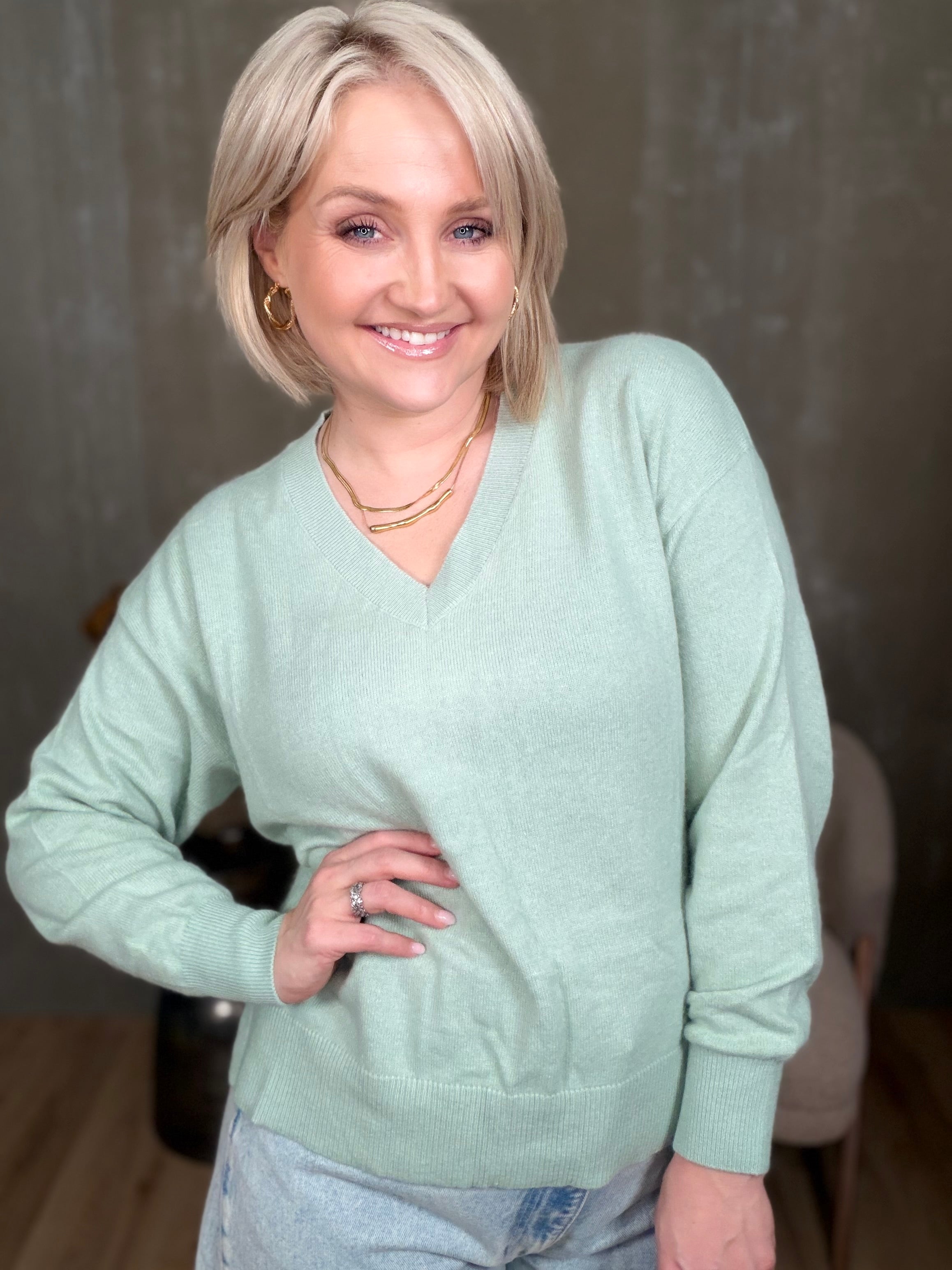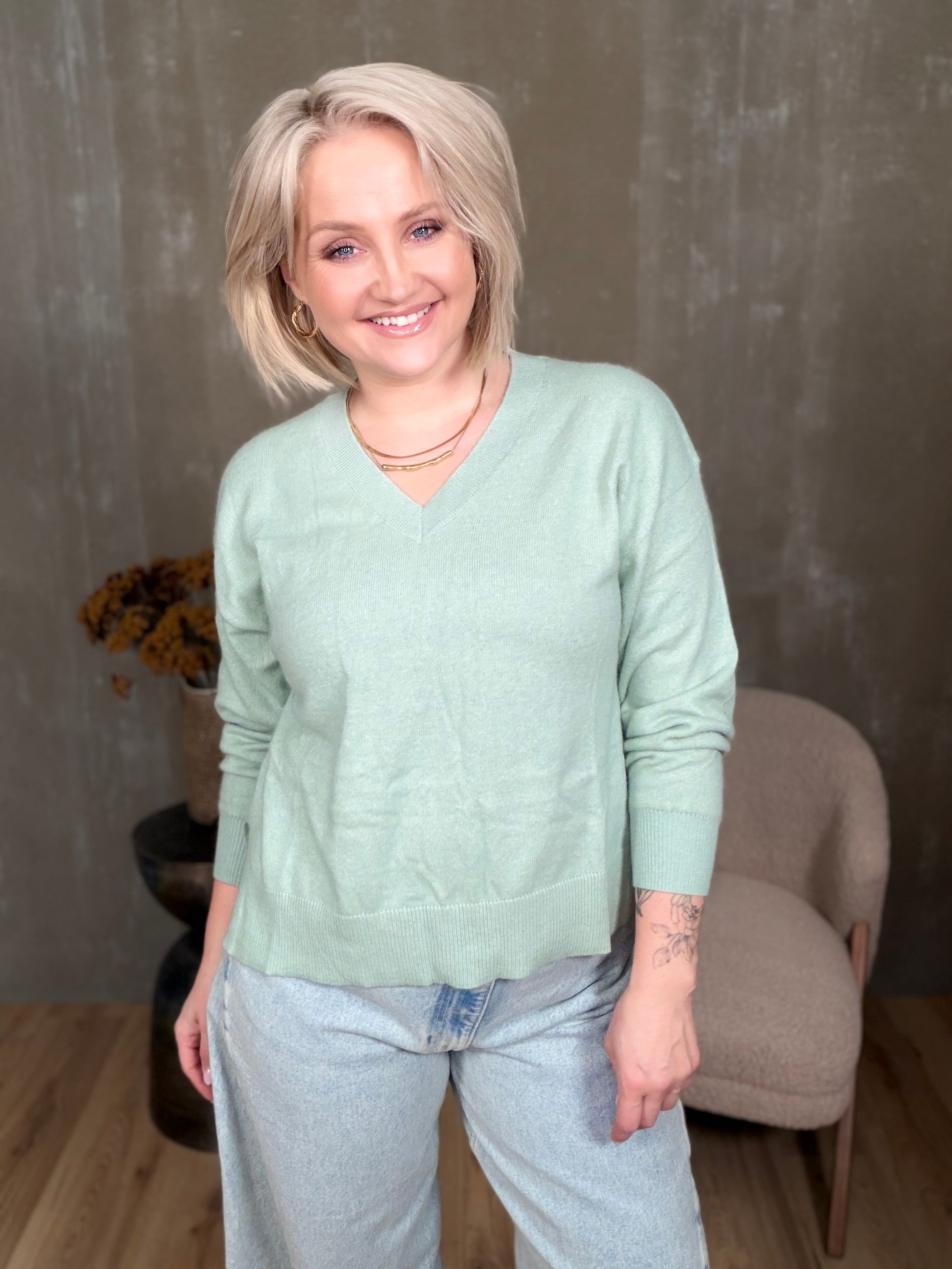 Boulder peysan kemur í 4 stærðum. Hún er með V hálsmáli og klaufum í hlið, með stroffi á ermum og prjónið er mjúkt og gott.