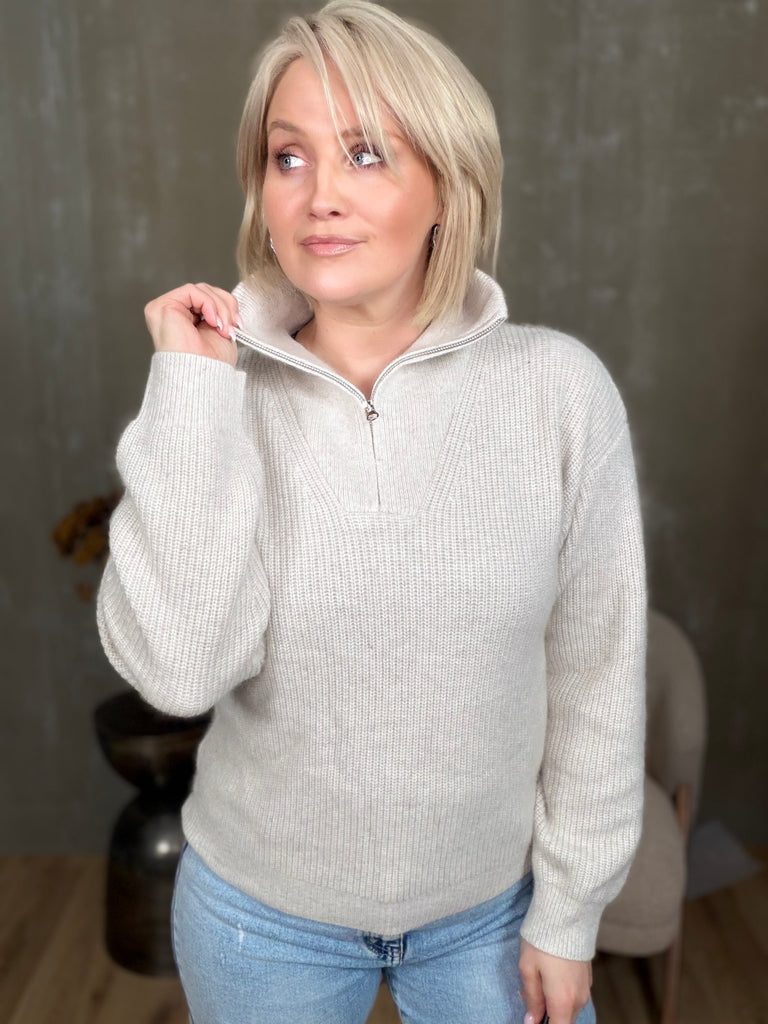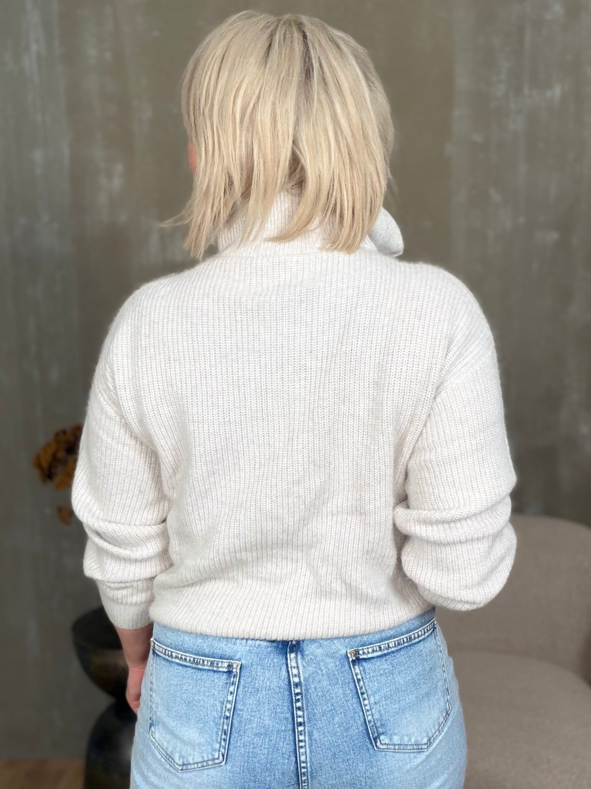 Breckenridge peysan kemur í 4 stærðum. Hún er háum rúllukraga og rennilás. Prjónið er einstaklega fallegt, stroff að neðan og við erumar.