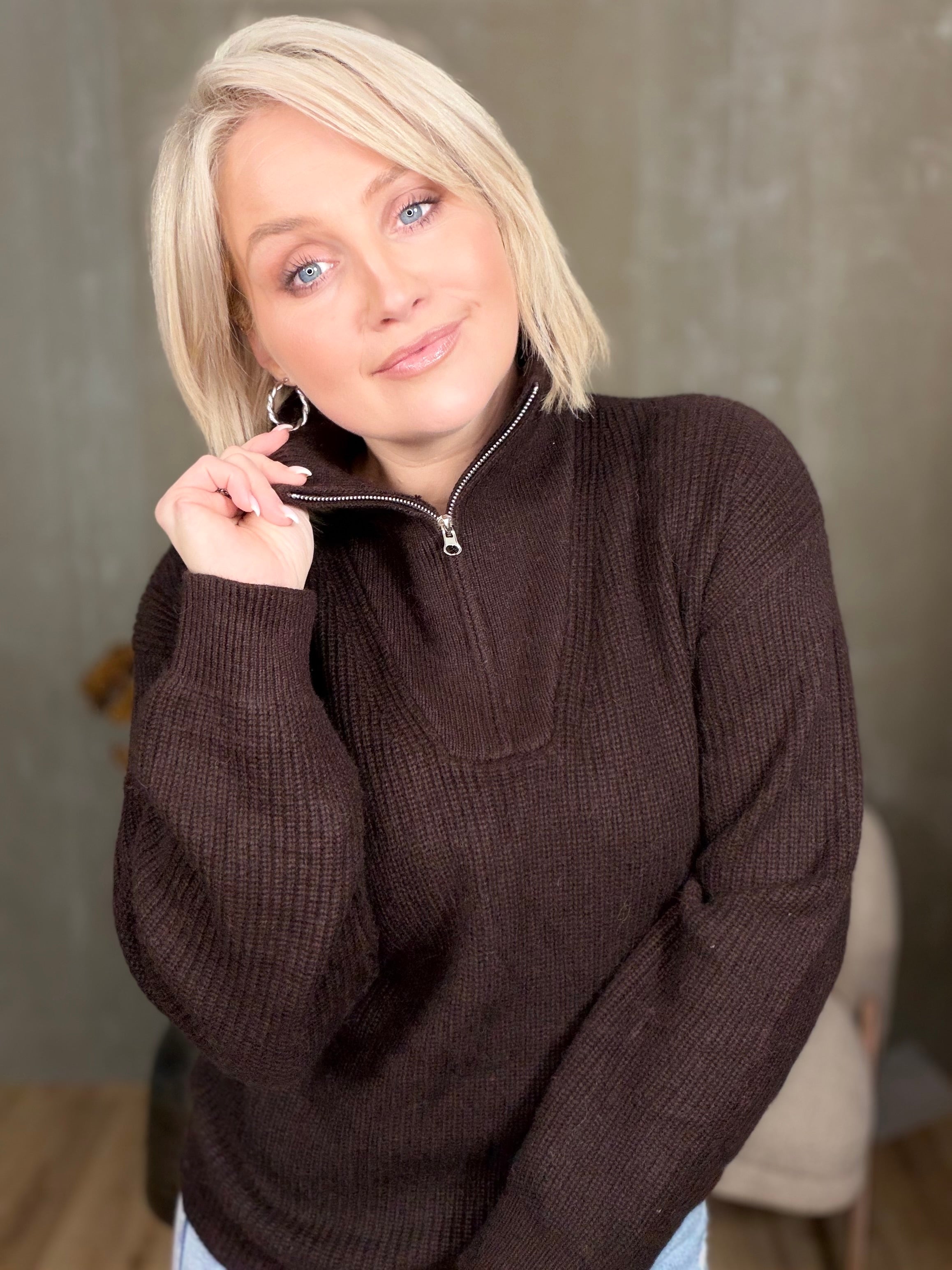 Breckenridge peysan kemur í 4 stærðum. Hún er háum rúllukraga og rennilás. Prjónið er einstaklega fallegt, stroff að neðan og við erumar.