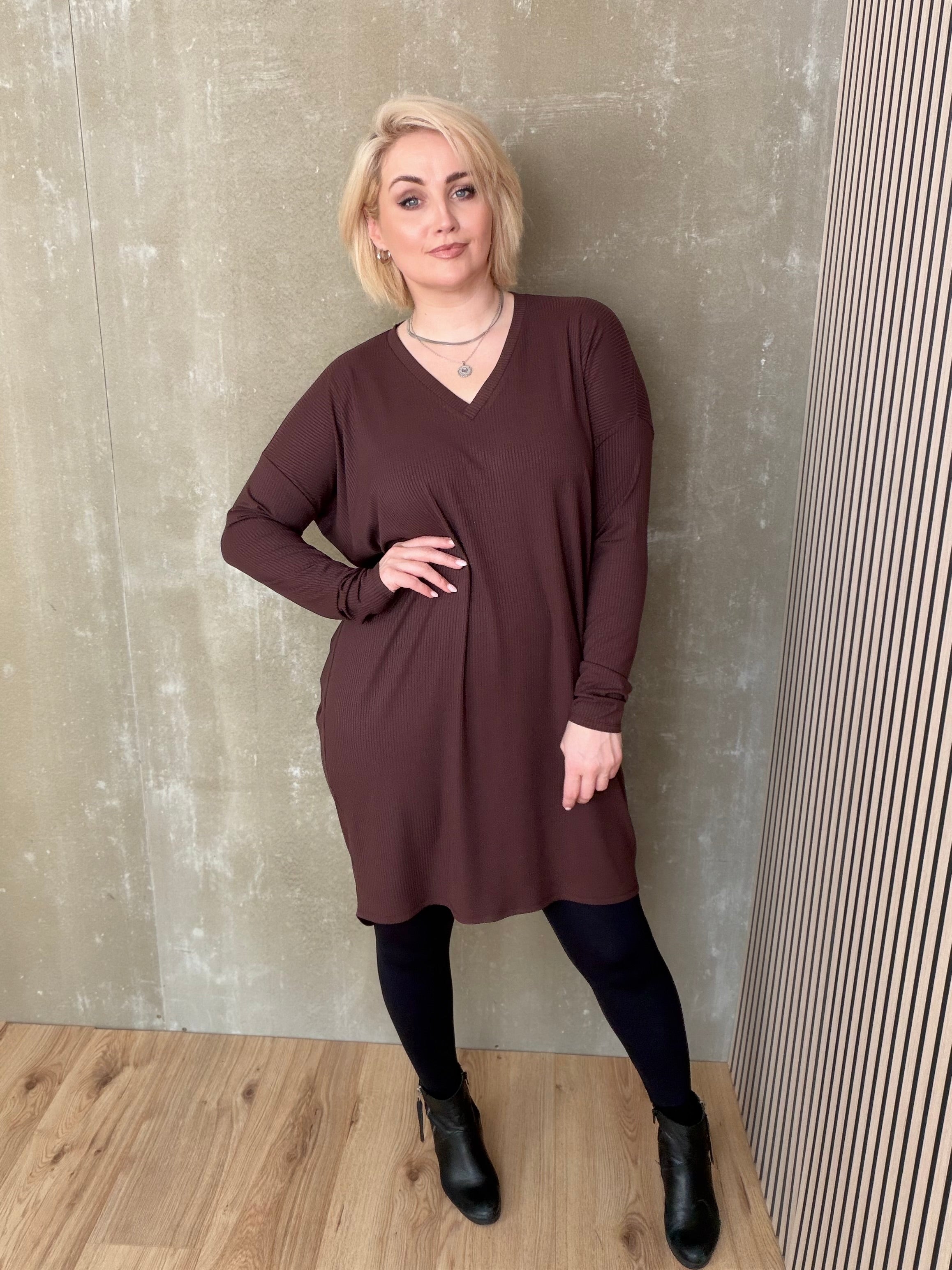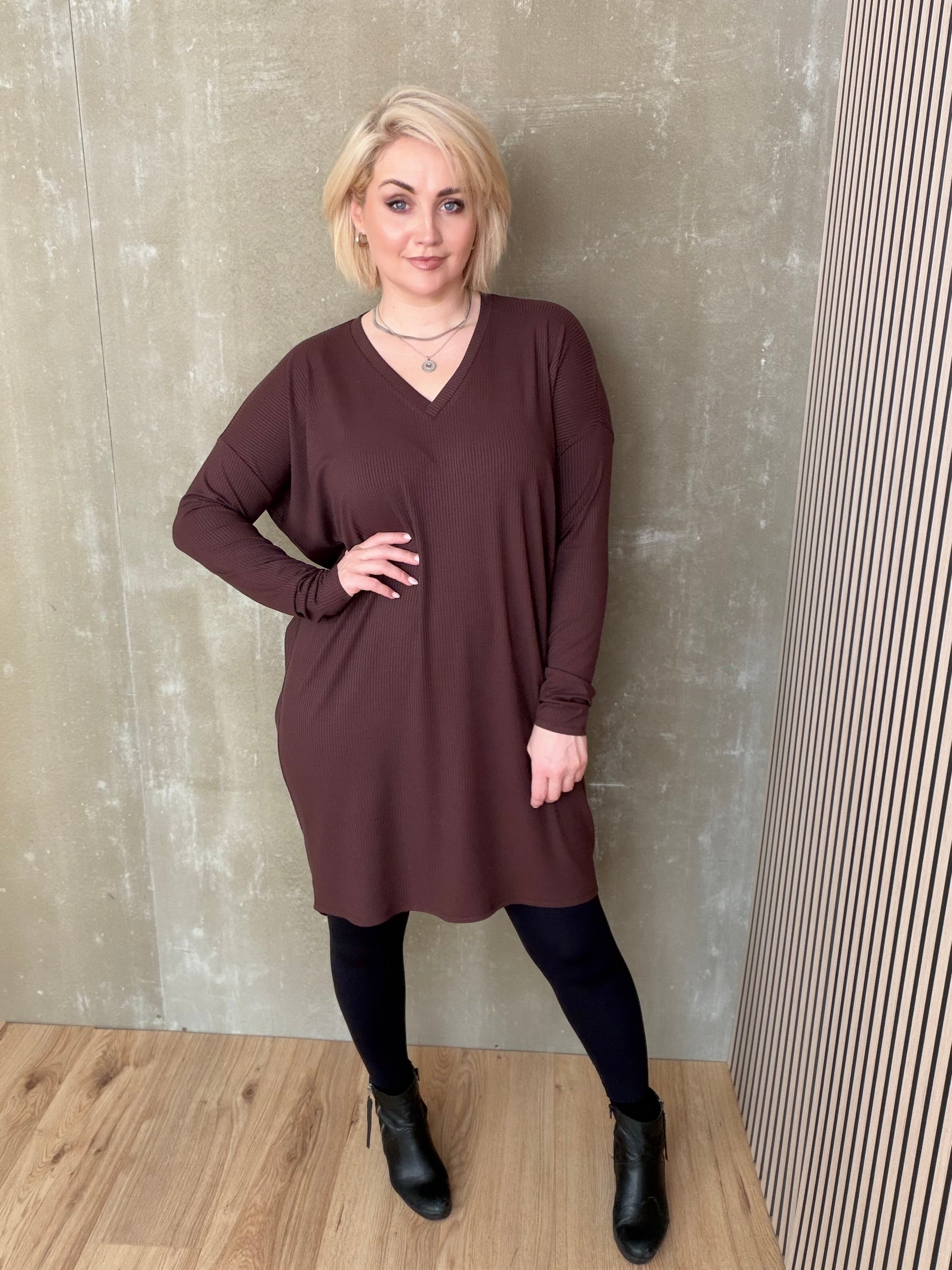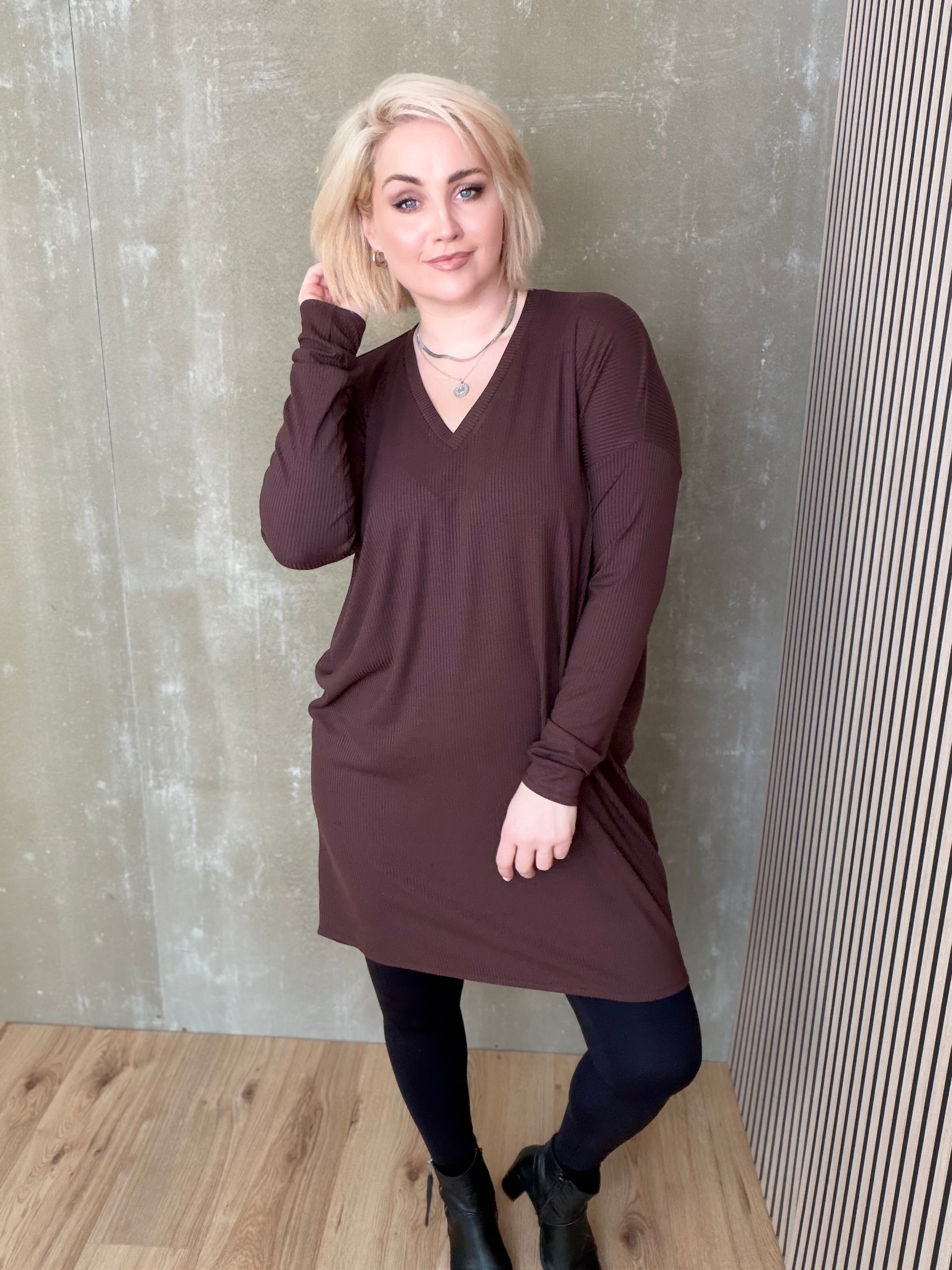 Brim kjóll með V hálsmáli er dásamlega mjúkur og þægilegur kjóll sem er örlítið síðari að aftan en framan. Hann er einfaldur í sniðinu, vel víður með síðum stroffermum og mikilli teygju.