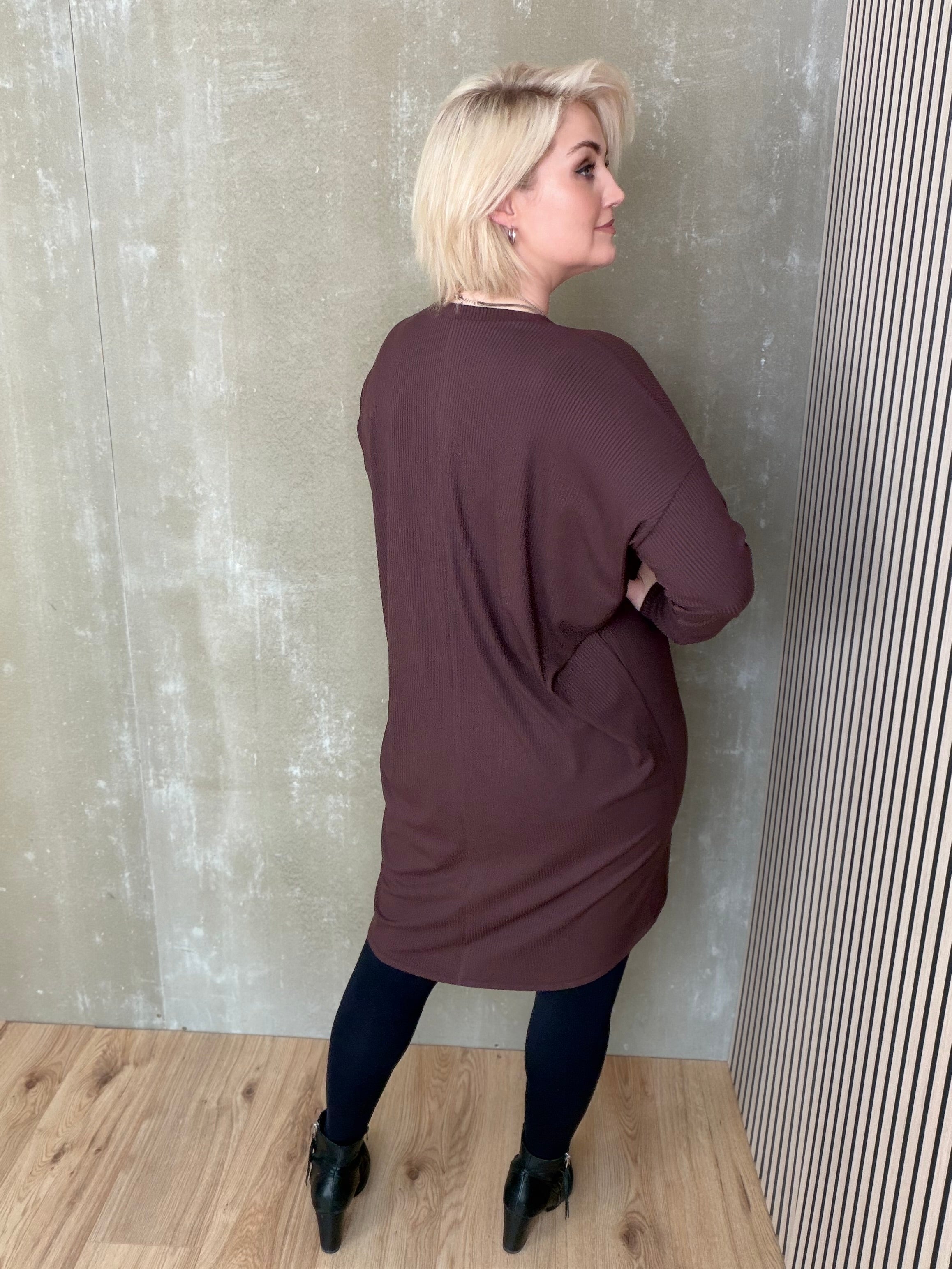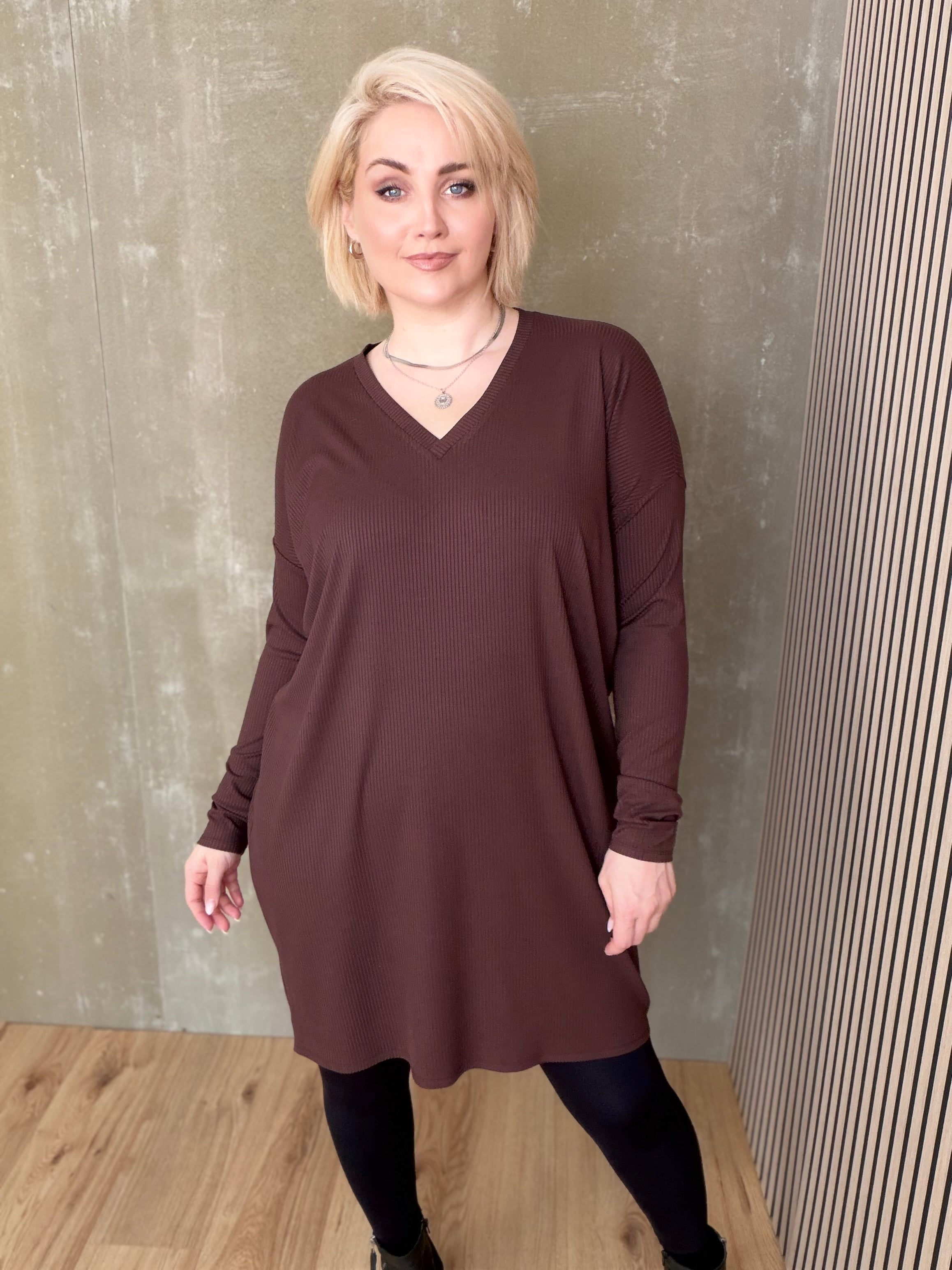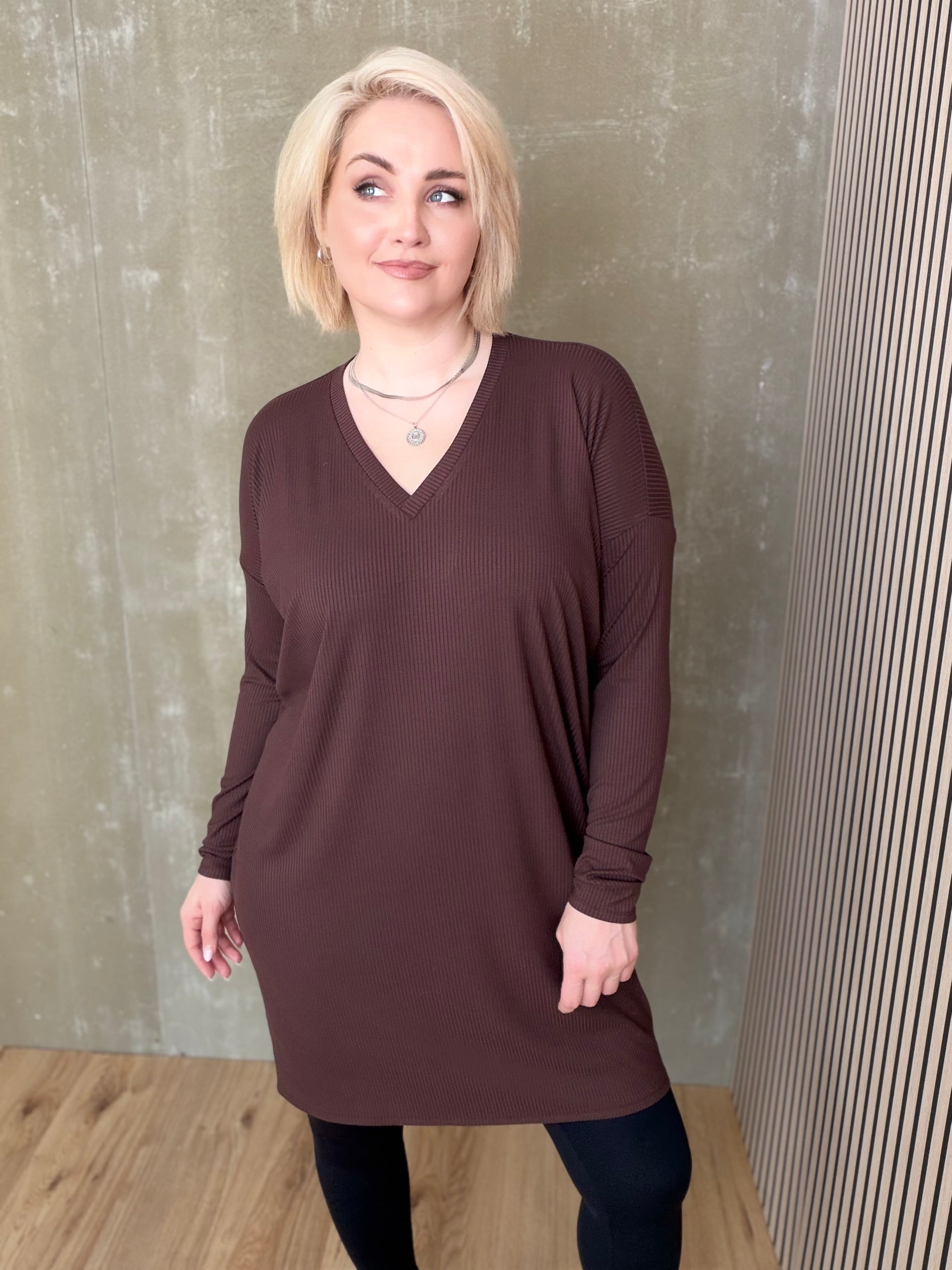 Brim kjóll með V hálsmáli er dásamlega mjúkur og þægilegur kjóll sem er örlítið síðari að aftan en framan. Hann er einfaldur í sniðinu, vel víður með síðum stroffermum og mikilli teygju.