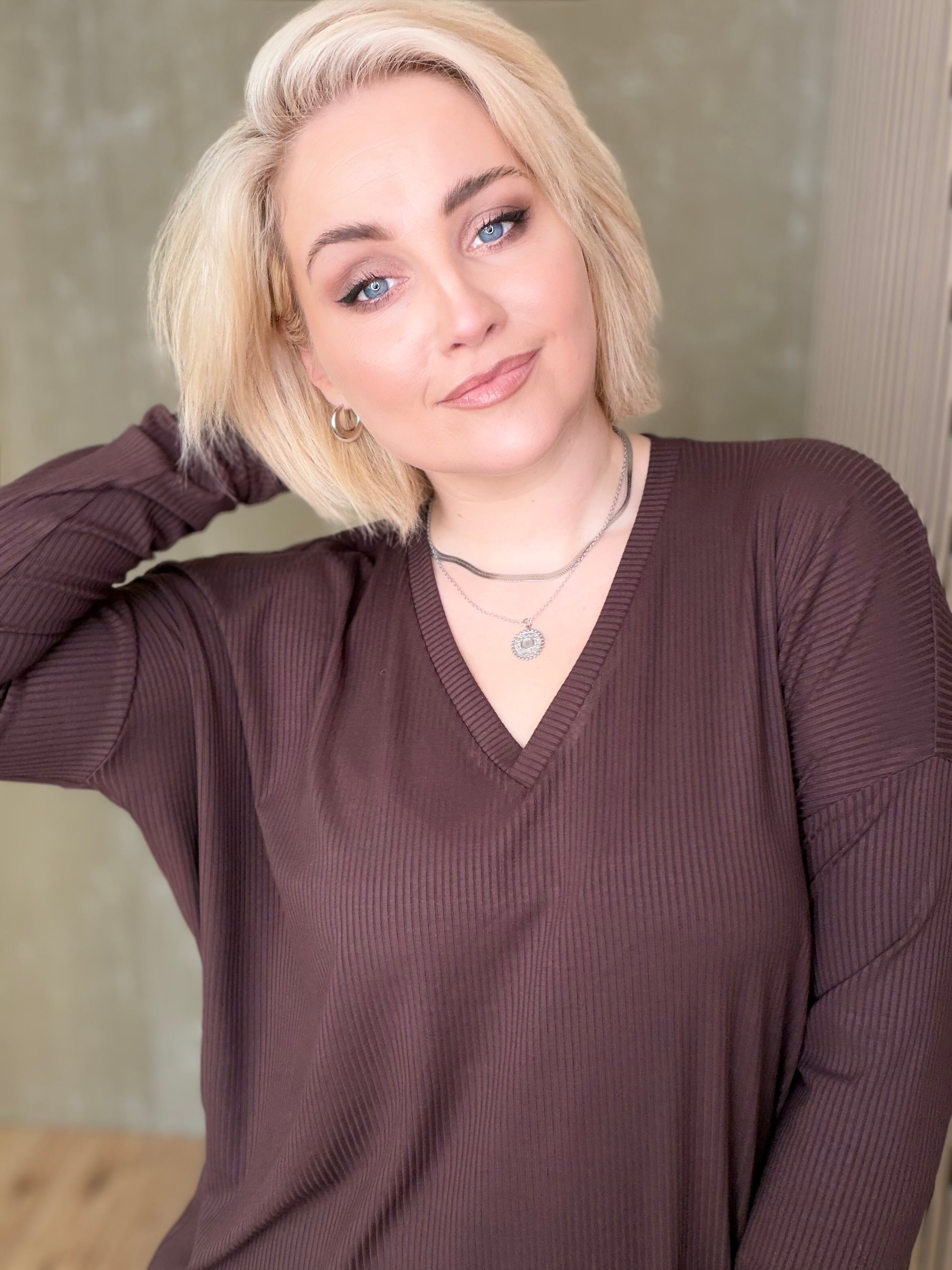 Hálsmálið er fallegt og V-ið nær ekki of neðarlega. Þennan er einstaklega auðvelt að klæða upp og niður, nota við leggings eða þröngar buxur, boots eða flata.