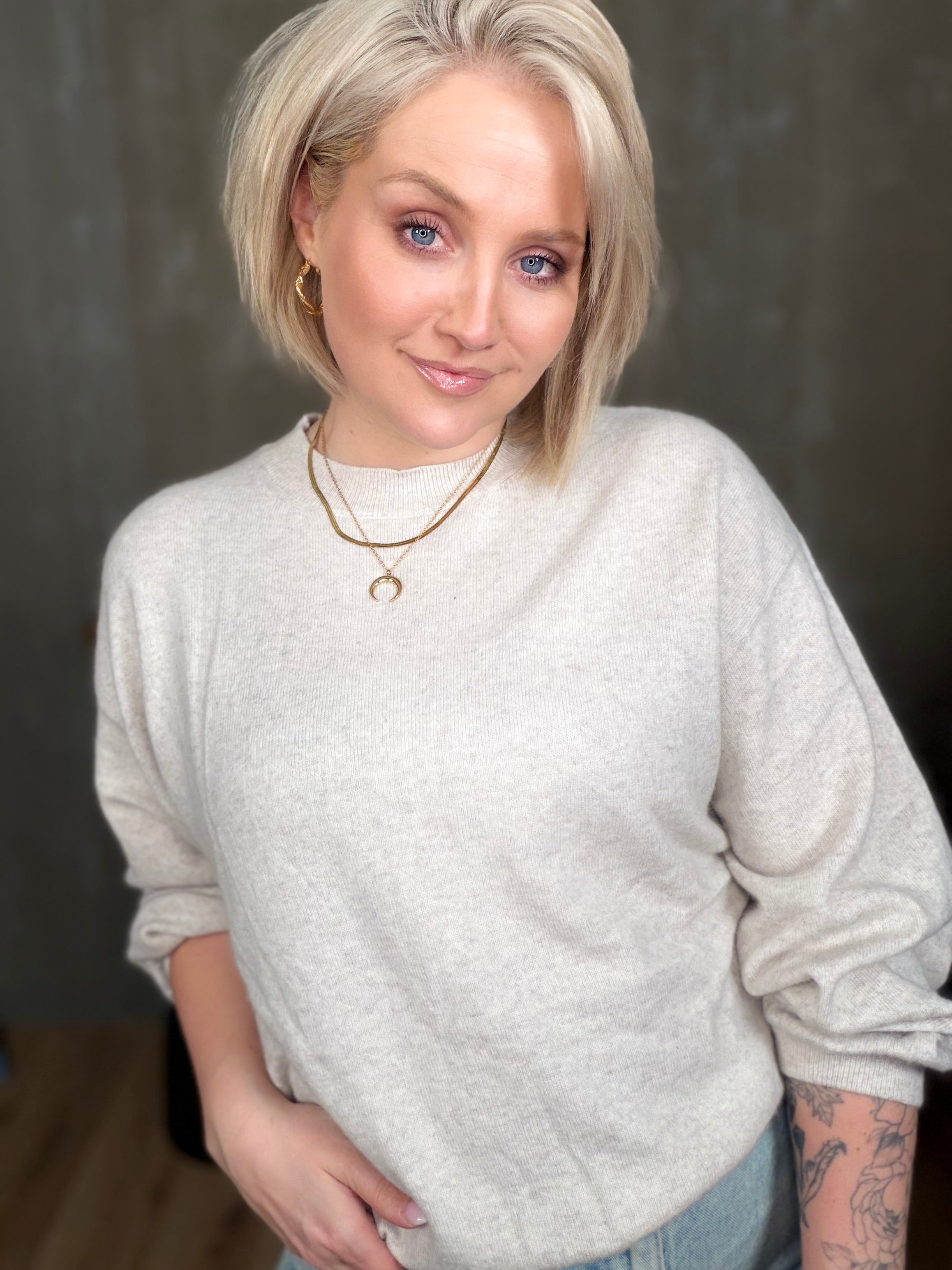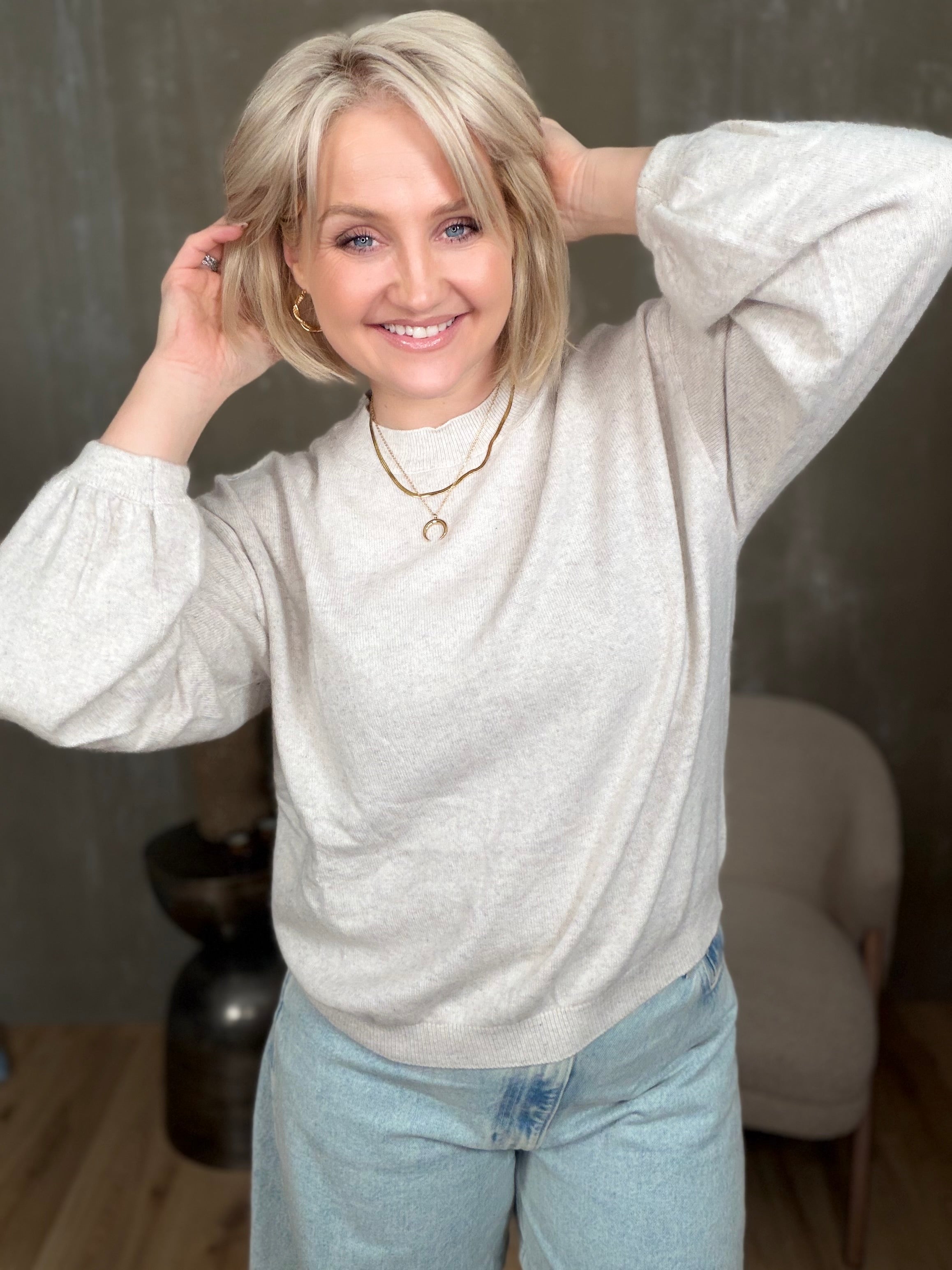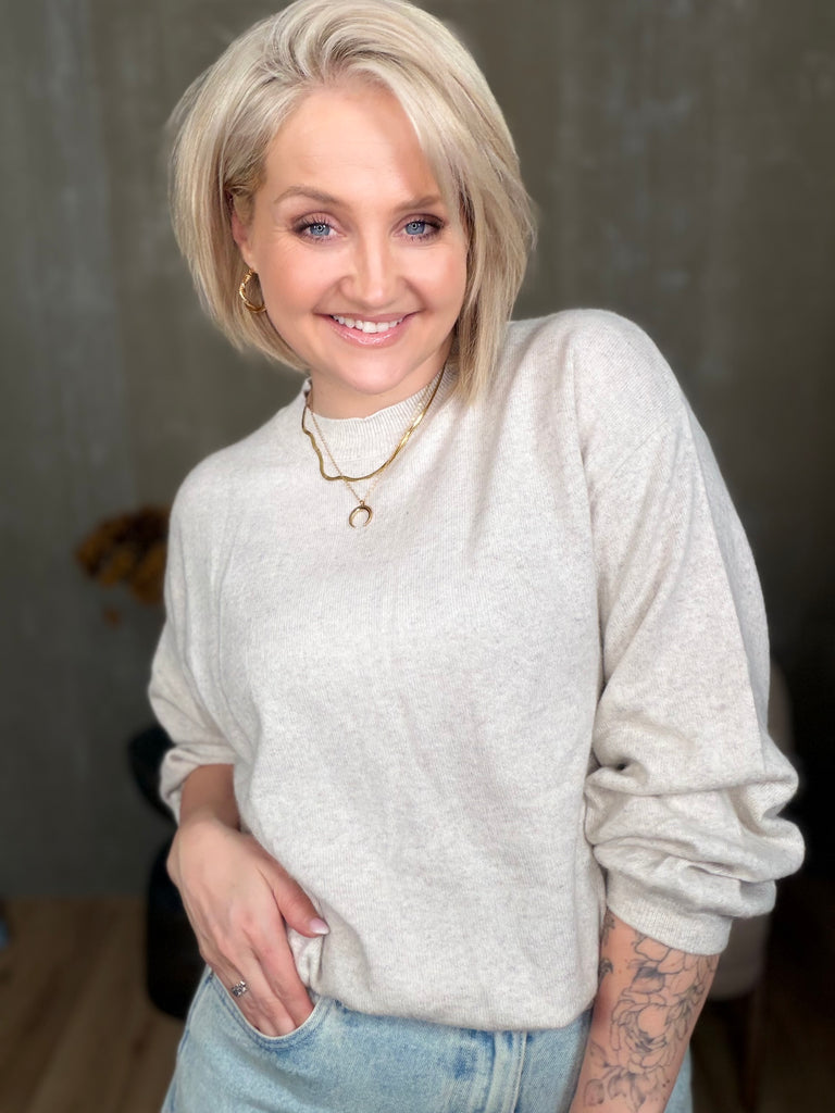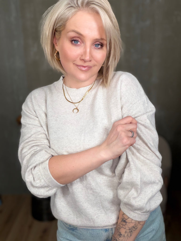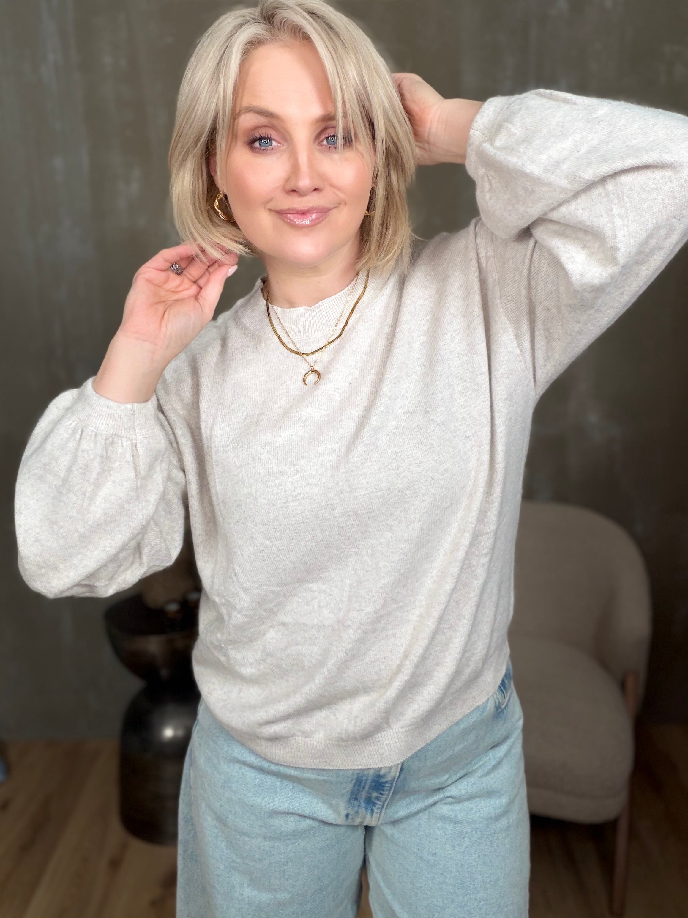 Colorado peysan kemur í 4 stærðum. Hún er með rúnuðu hálsmáli og stroffi að neðan. Ermarnar eru með balloon sniði, þeas það er góð vídd við framhandleggi og tekin saman með teygju stroffi.