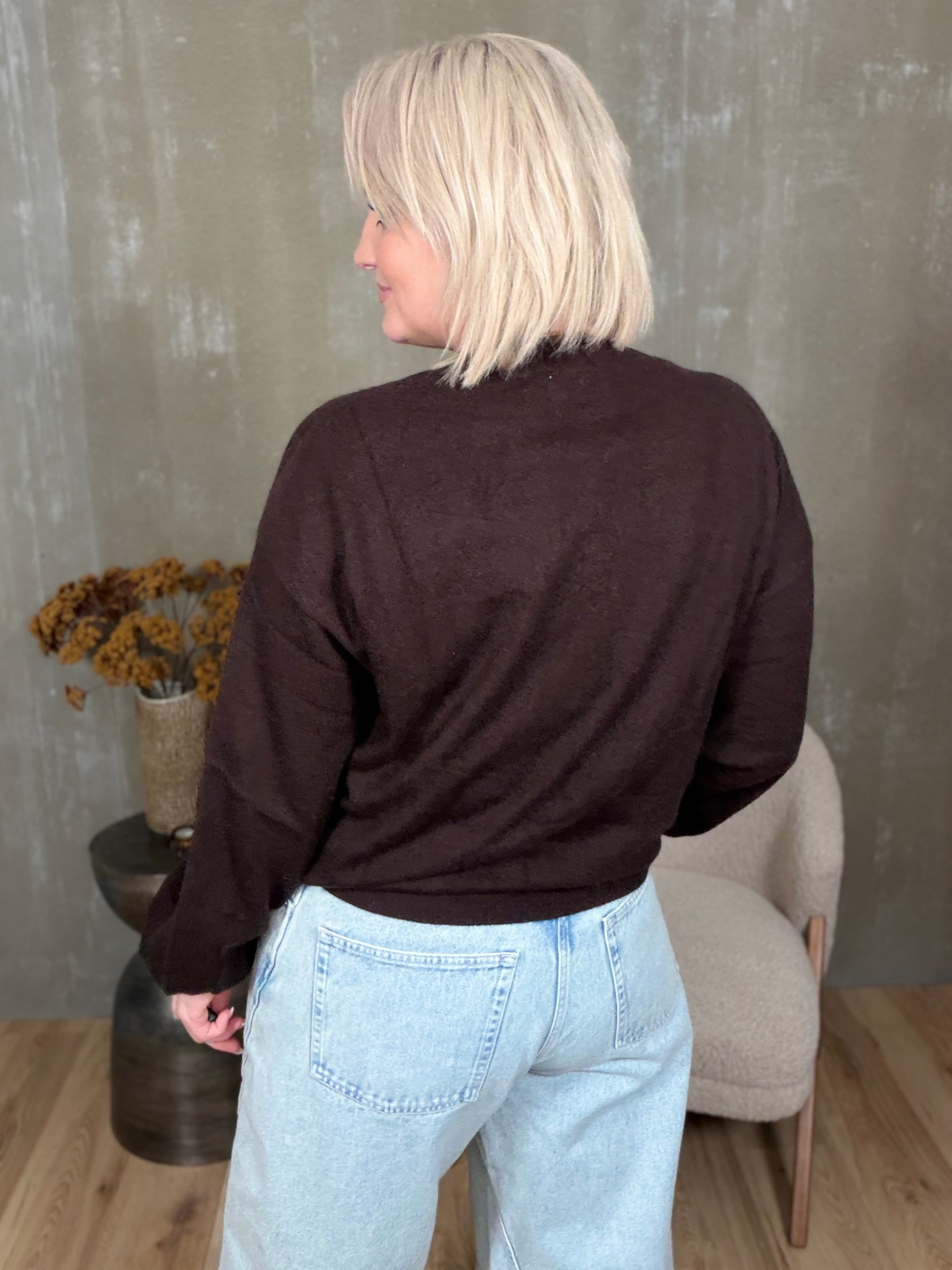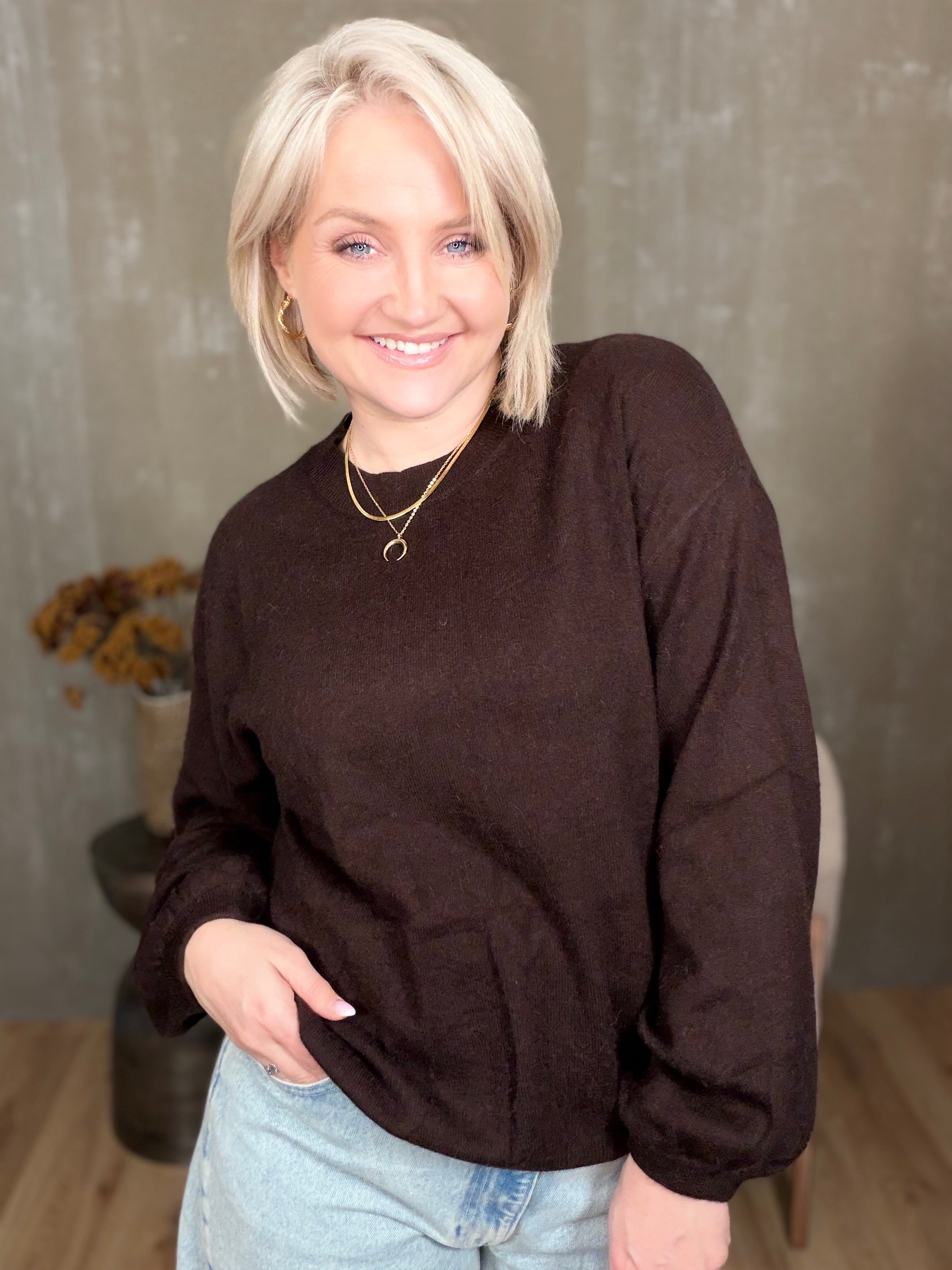 Colorado peysan kemur í 4 stærðum. Hún er með rúnuðu hálsmáli og stroffi að neðan. Ermarnar eru með balloon sniði, þeas það er góð vídd við framhandleggi og tekin saman með teygju stroffi.