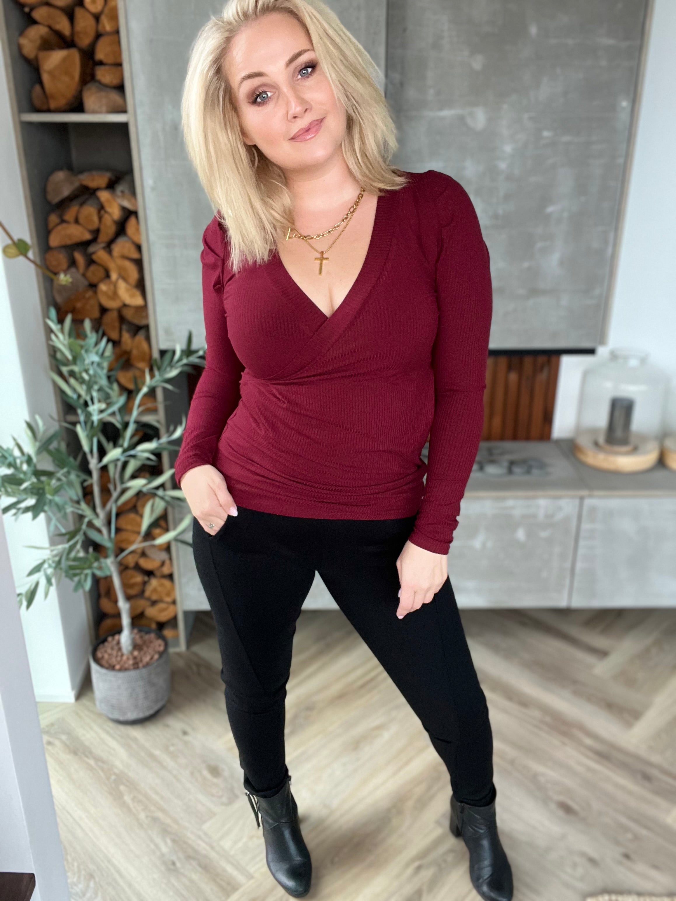 Á framstykkinu eru litlar follur sem mynda aukna vídd yfir magasvæðið en þar sem follurnar festast upp í skásaum, ekki í hlið, hentar bæði að hafa toppinn lausan yfir neðri part eða girða ofan í.