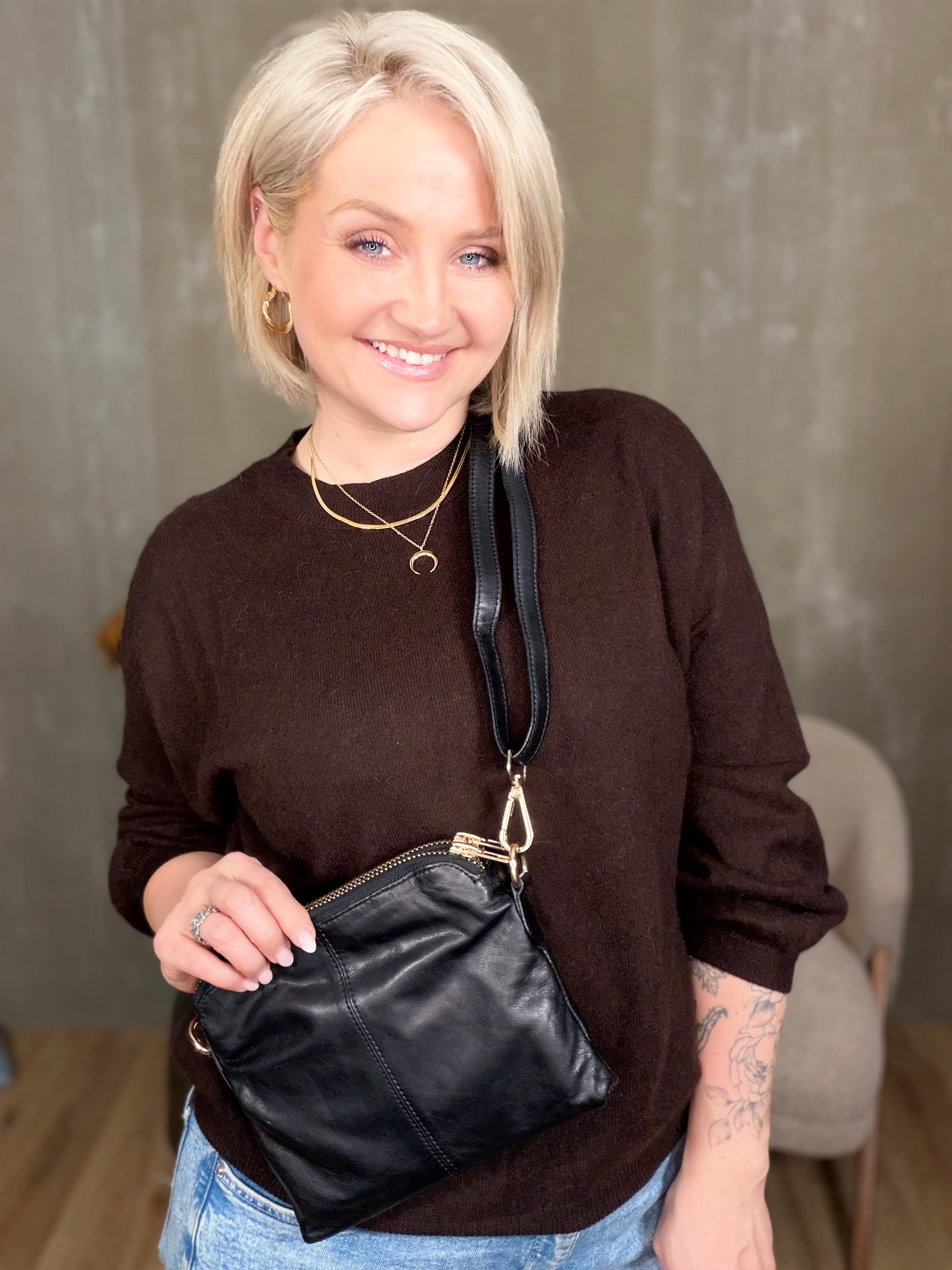 Pen selskapstaska úr 100% geita skinni. Leðrið er einstaklega mjúkt og þægilegt og ólina er hægt að lengja frá 90-160cm Einnig er lítil ól sem hægt er að hafa eina og sér eða sleppa.