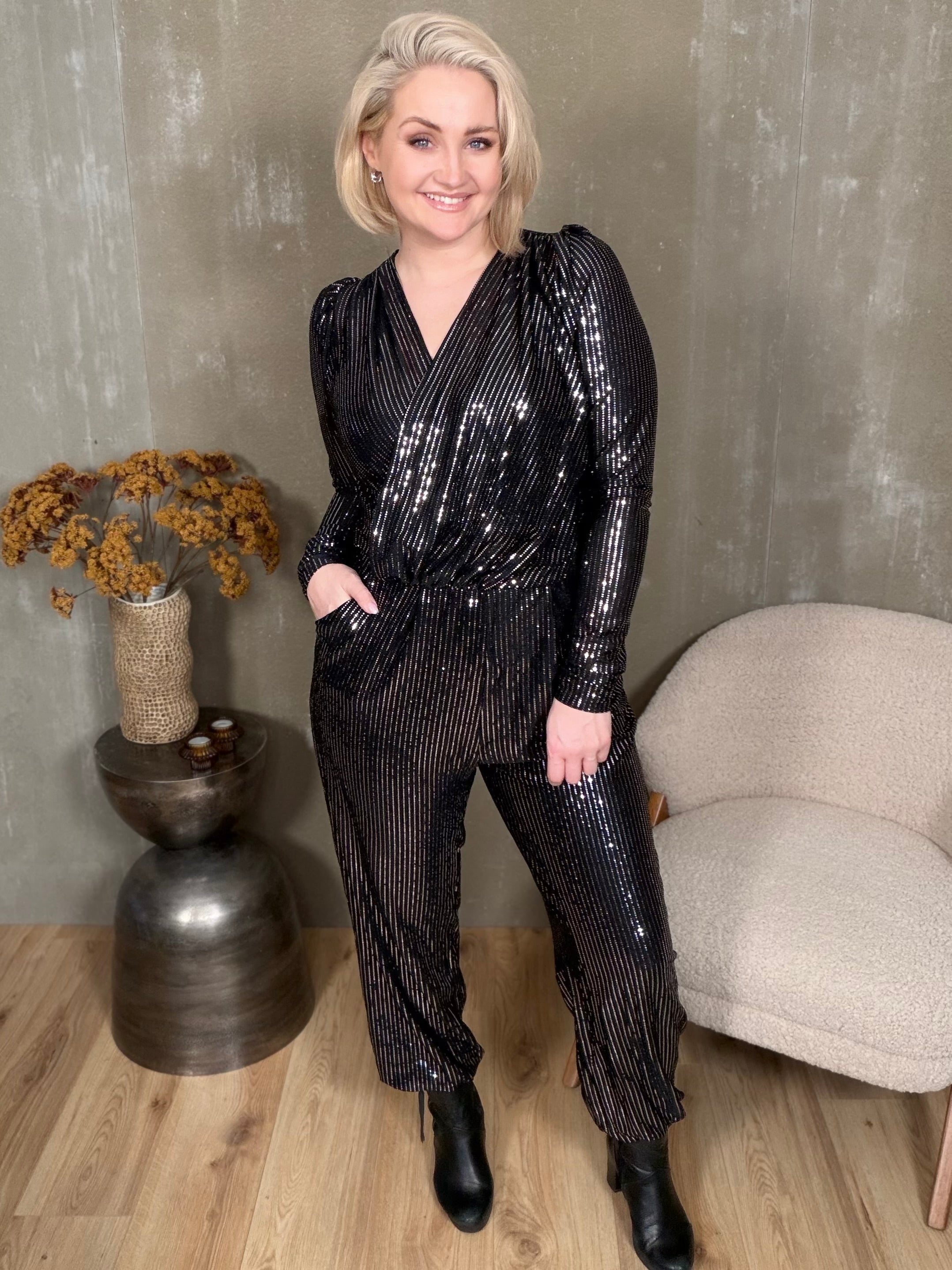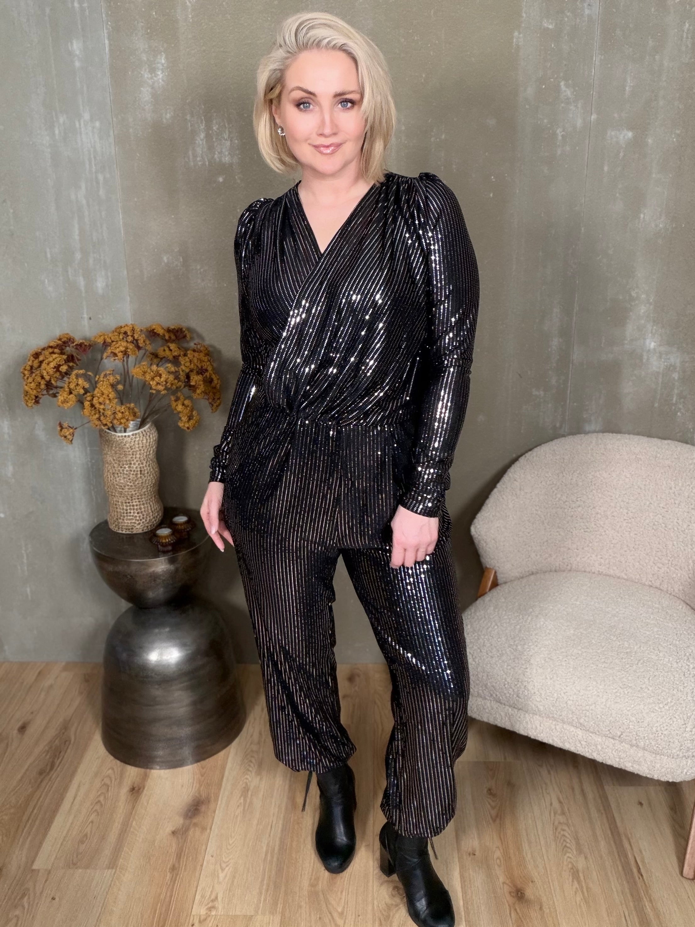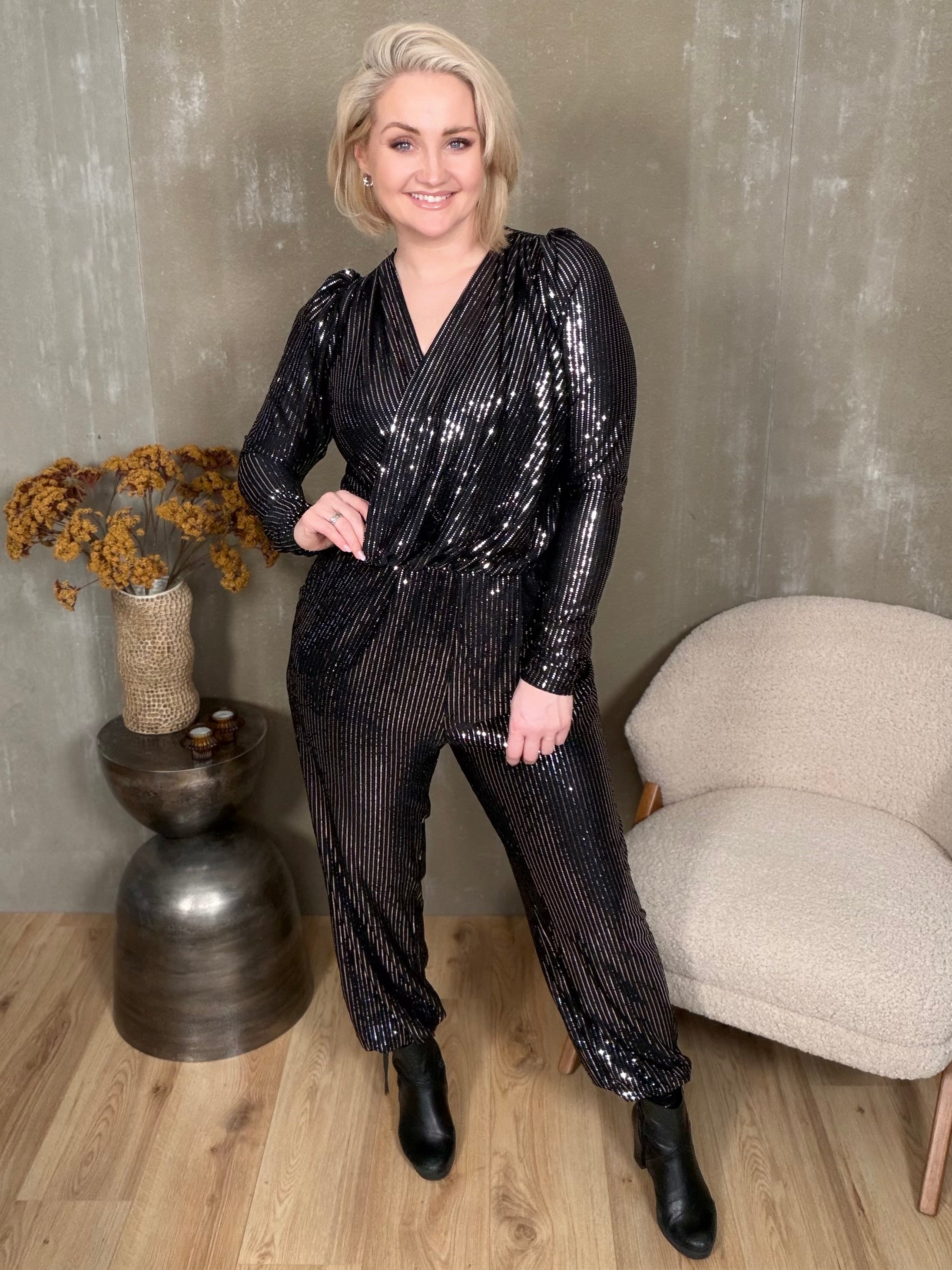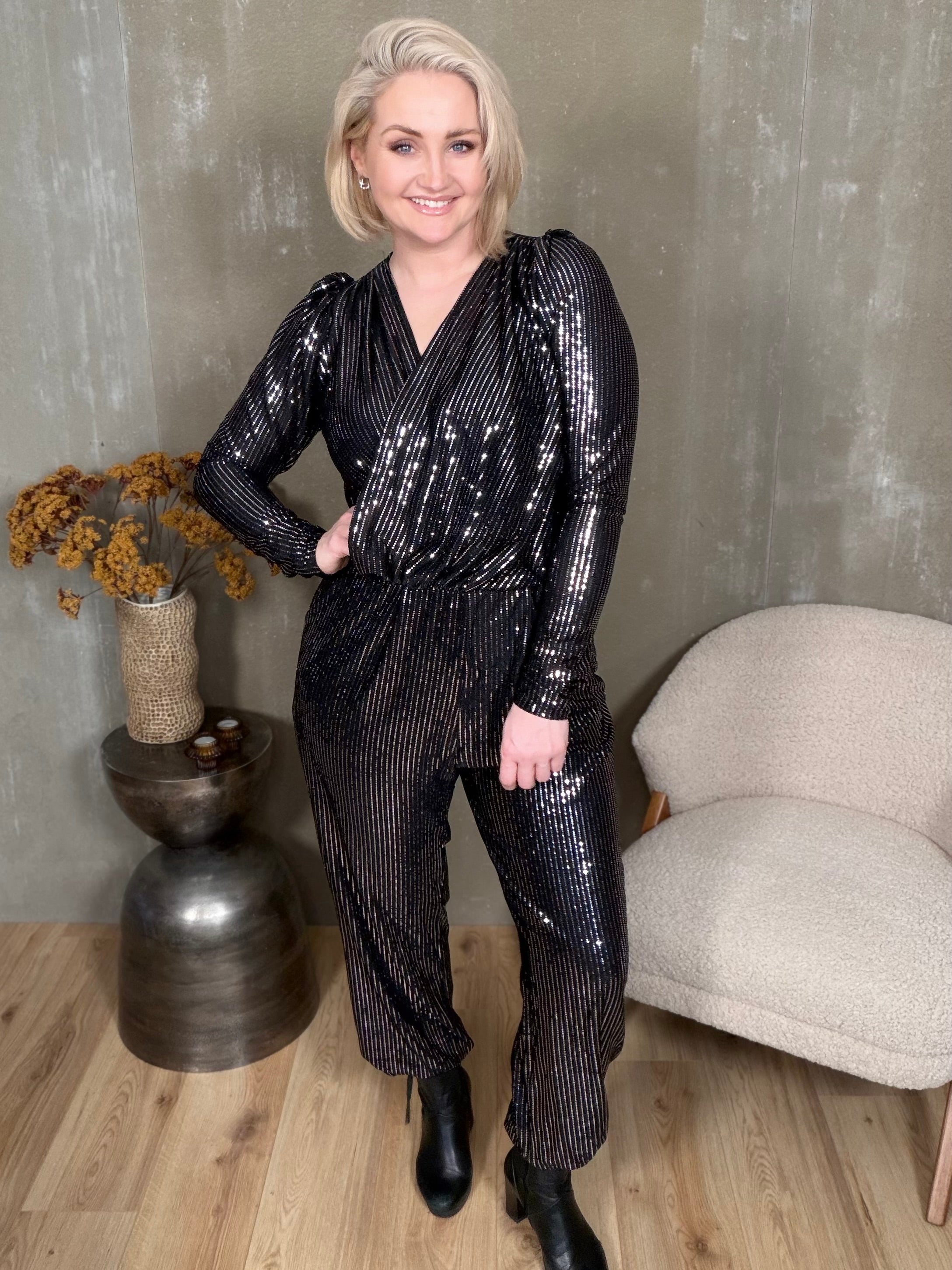Drangur samfestingarnir eru dásamlega klæðilegir með síðum púff ermum, framstykki sem falla hvort yfir annað og myndar fallegt V-hálsmál. Það er rykking á öxl og vasar í hlið.