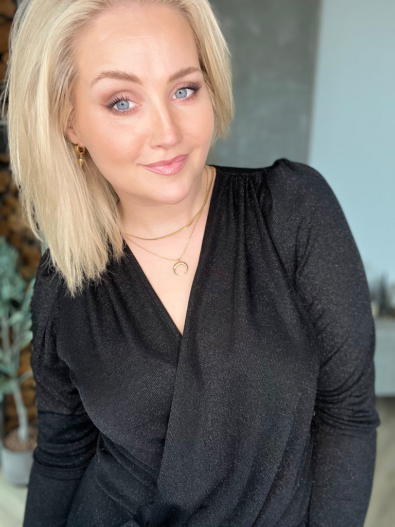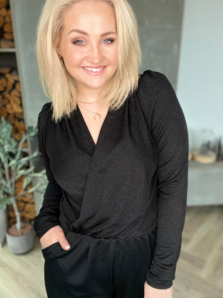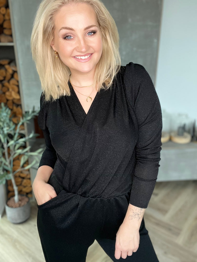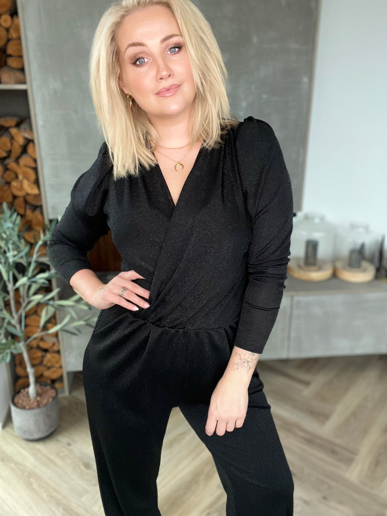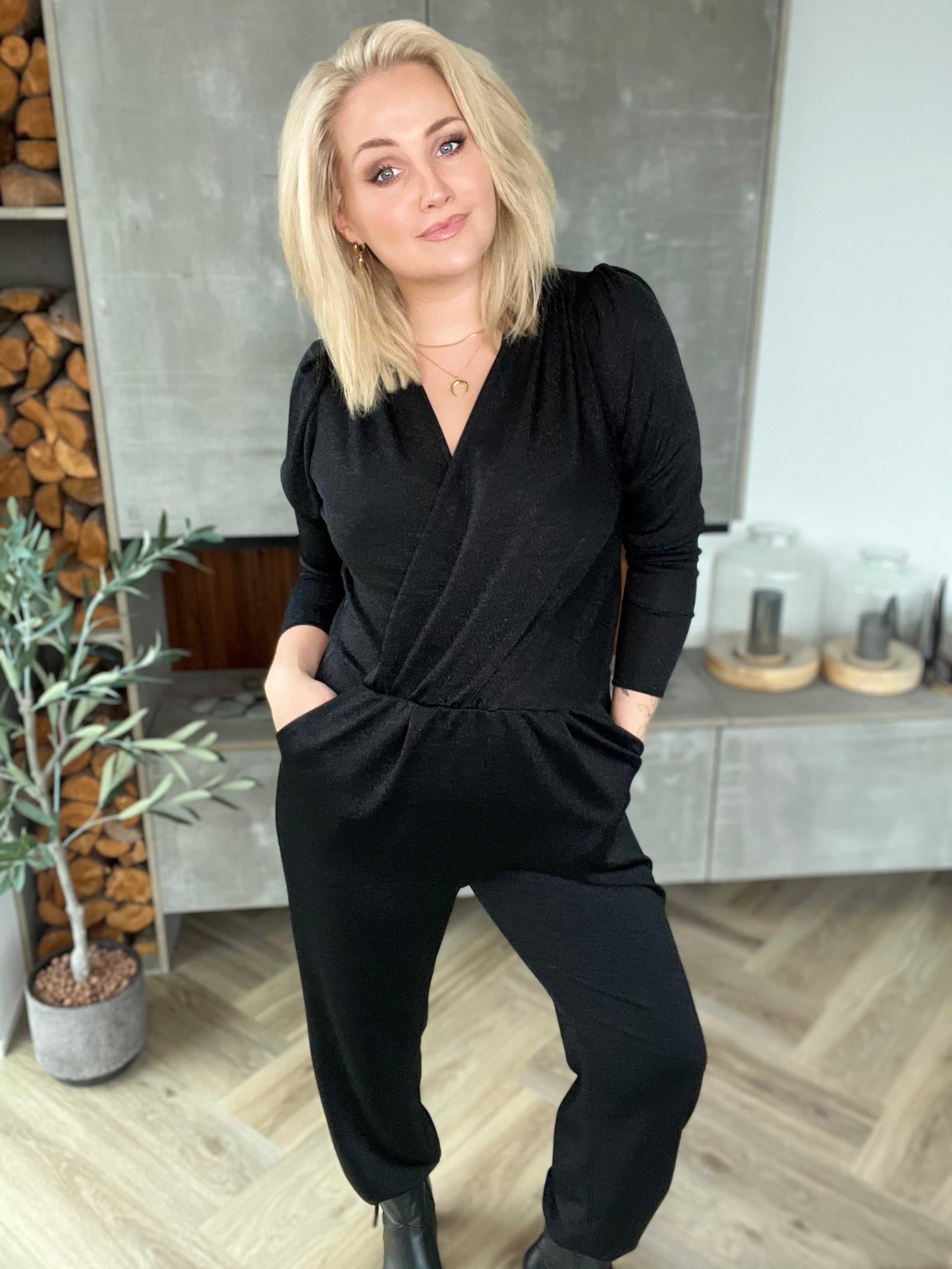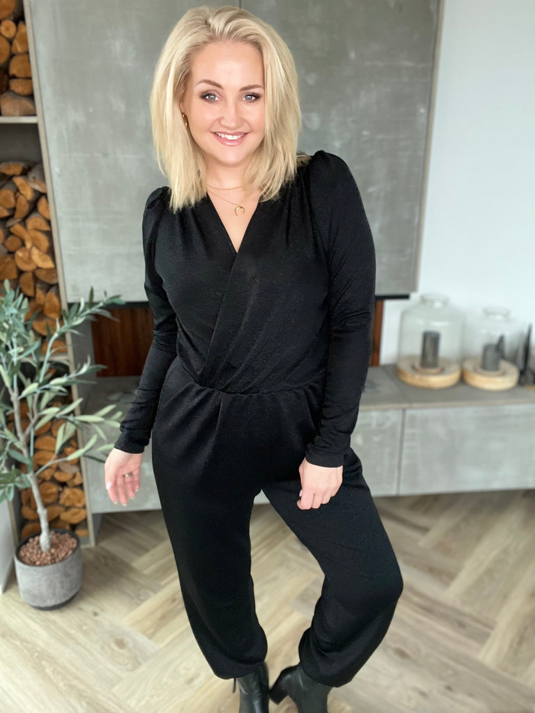 Drangur samfestingarnir eru dásamlega klæðilegir með síðum púff ermum, framstykki sem falla hvort yfir annað og myndar fallegt V-hálsmál. Það er rykking á öxl og vasar í hlið.