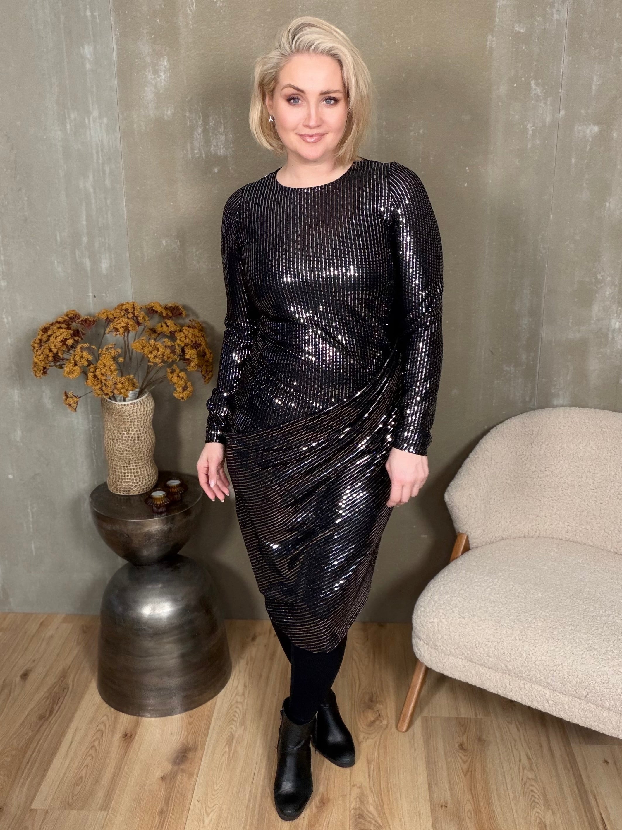Draupnir er dásamlega klæðilegur og fallegur kjóll. Hann er ósymmetrískur sem þýðir að hann er ekki eins í hvorri hlið, hvorki að framan né aftan. Hann er missíður og stoppar fyrir ofan hné öðru megin en fyrir neðan það hinu megin. Síðerma og með háu hálsmáli en samt er hann ótrúlega kynþokkafullur og elegant.