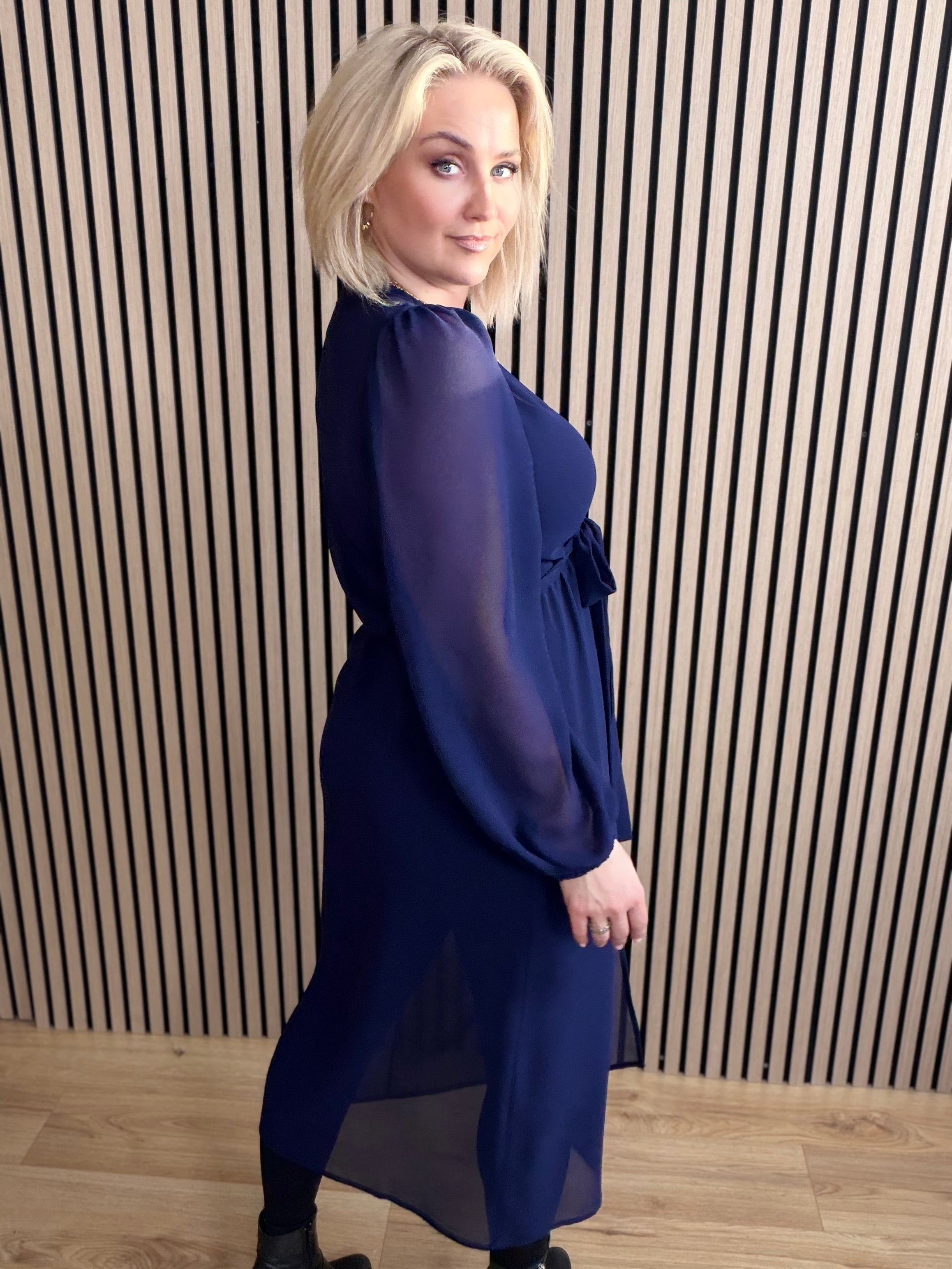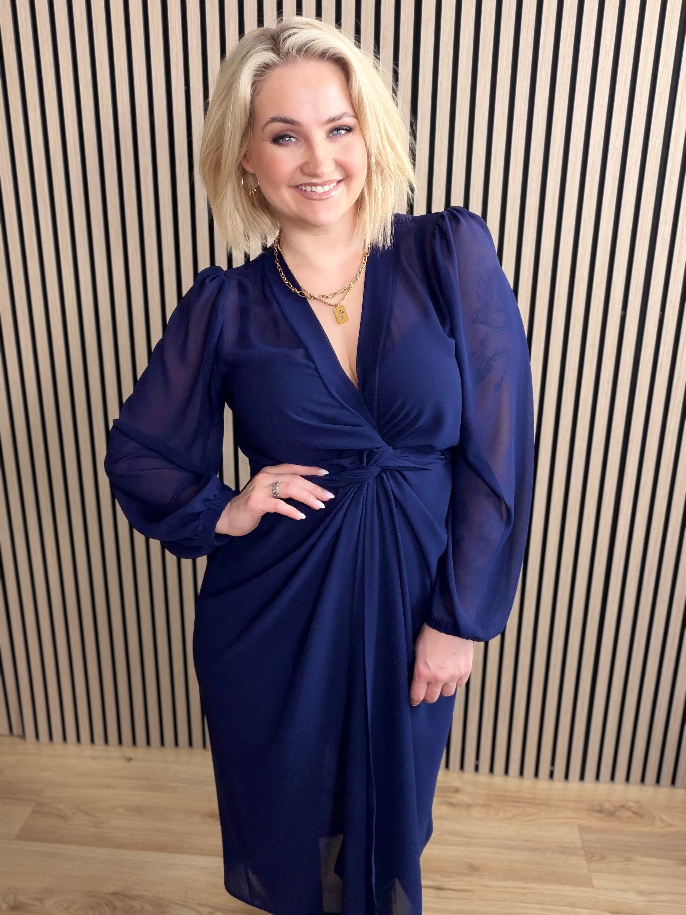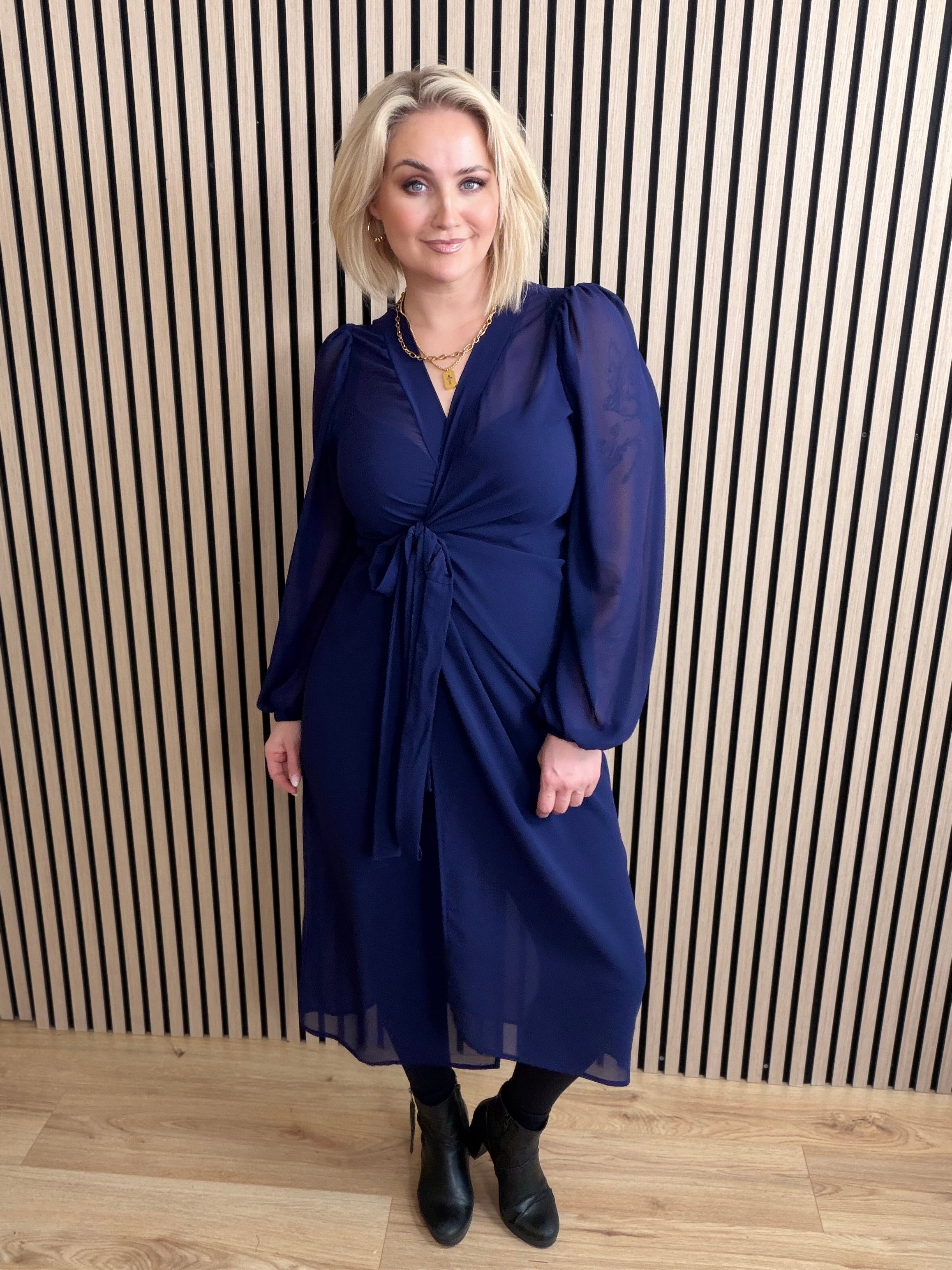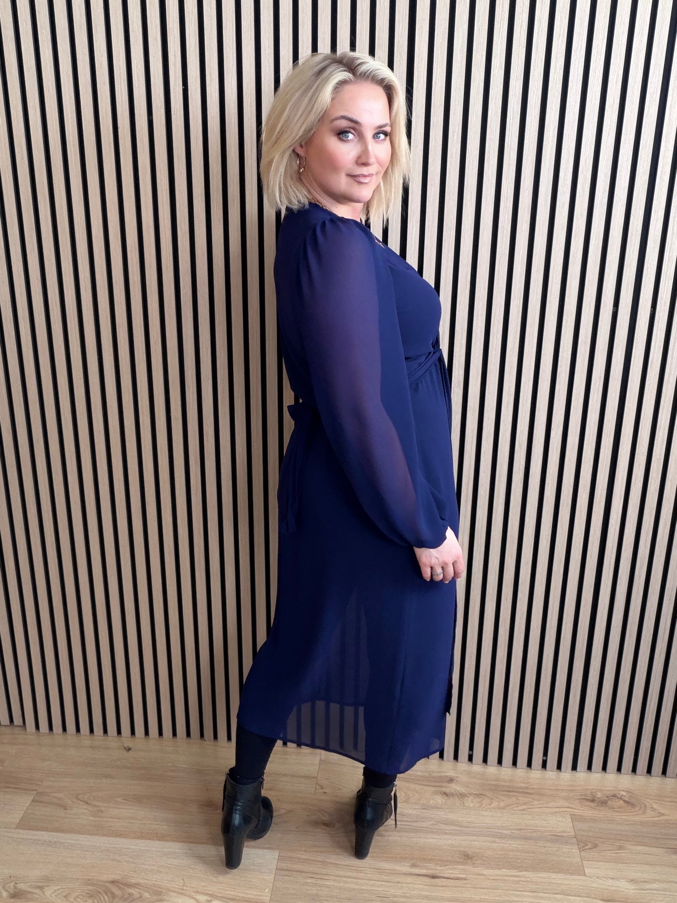Einstaklega sparilegur og fallegur sem þó er auðvelt að klæða upp og niður. Kjóllinn er bundinn á misvíxl til að fá sem mesta lokun en einnig er hægt að rykkja hann meira saman og vera með slaufuna að framan eða í hlið og þá er mittið enn ýktara. Eða snúa frampörtunum um hvorn annan og lengja þannig hálsmálið og binda að framan eða aftan.