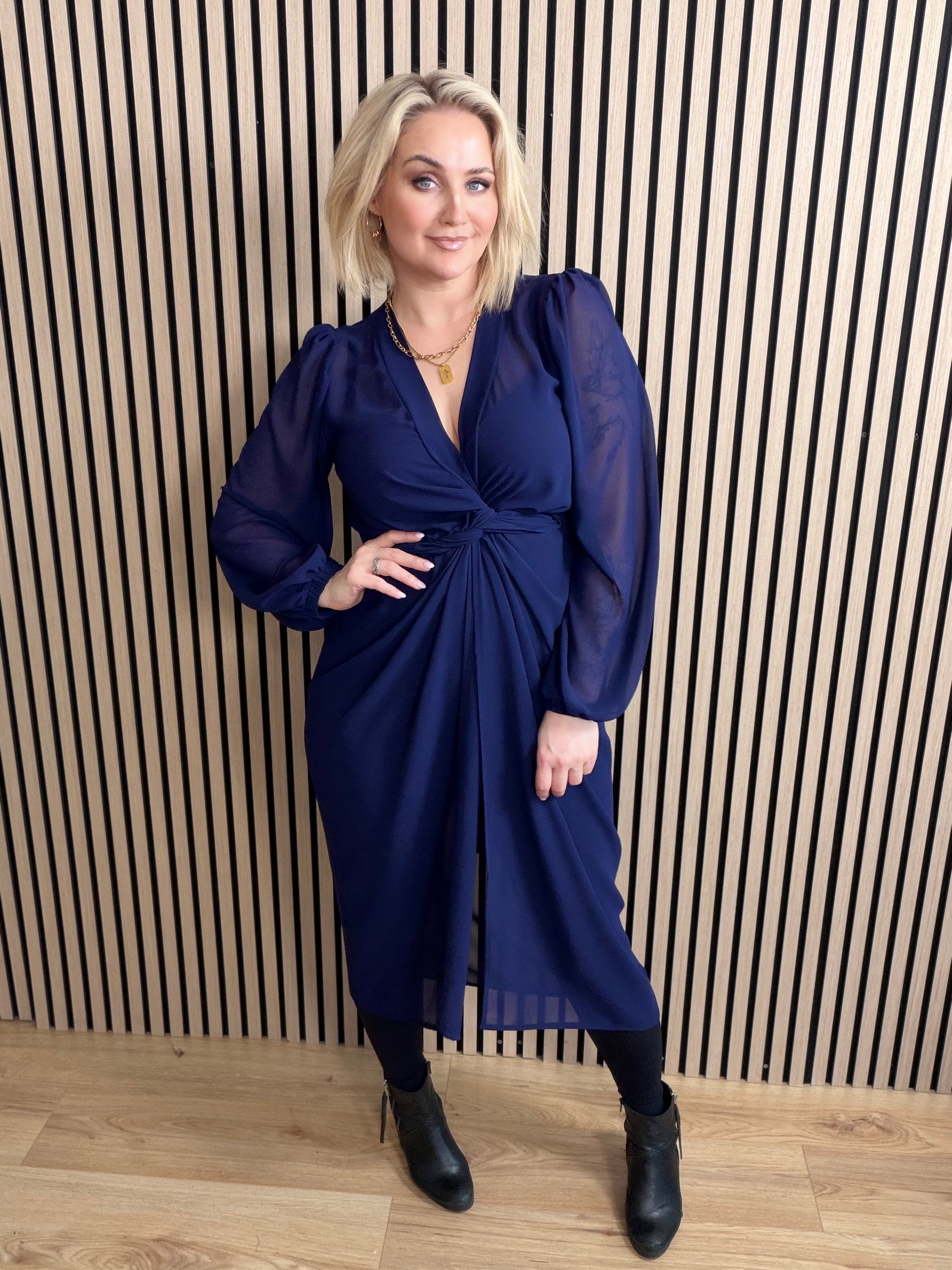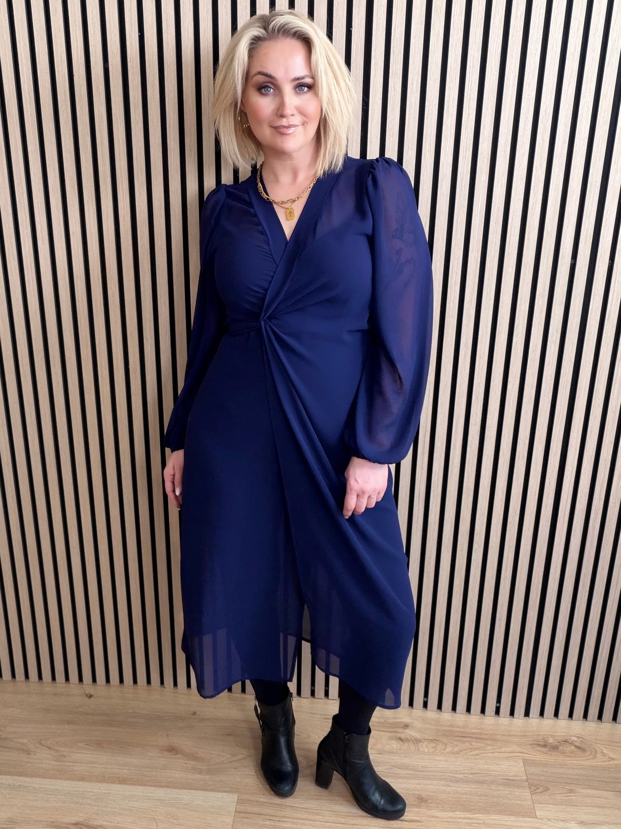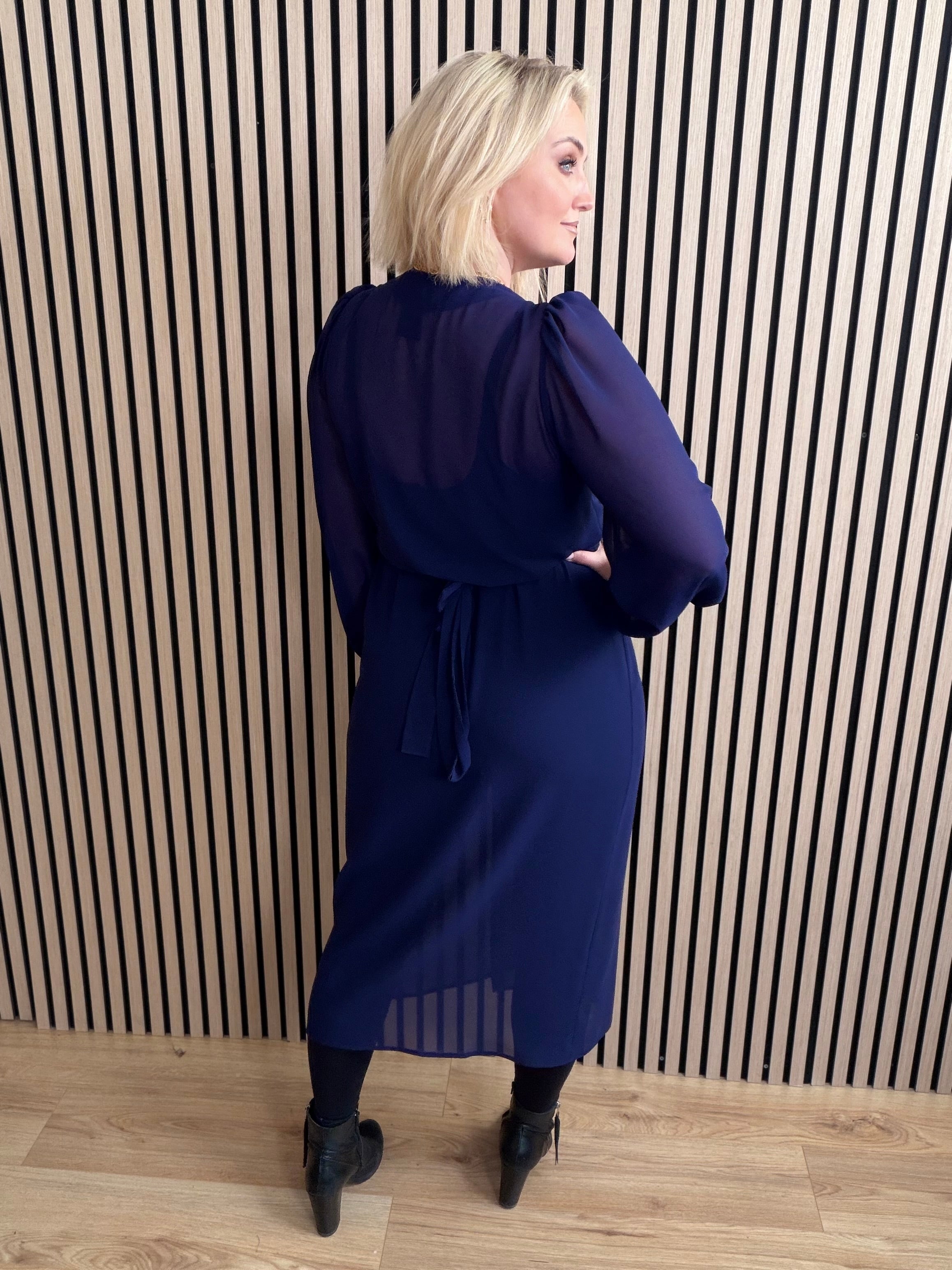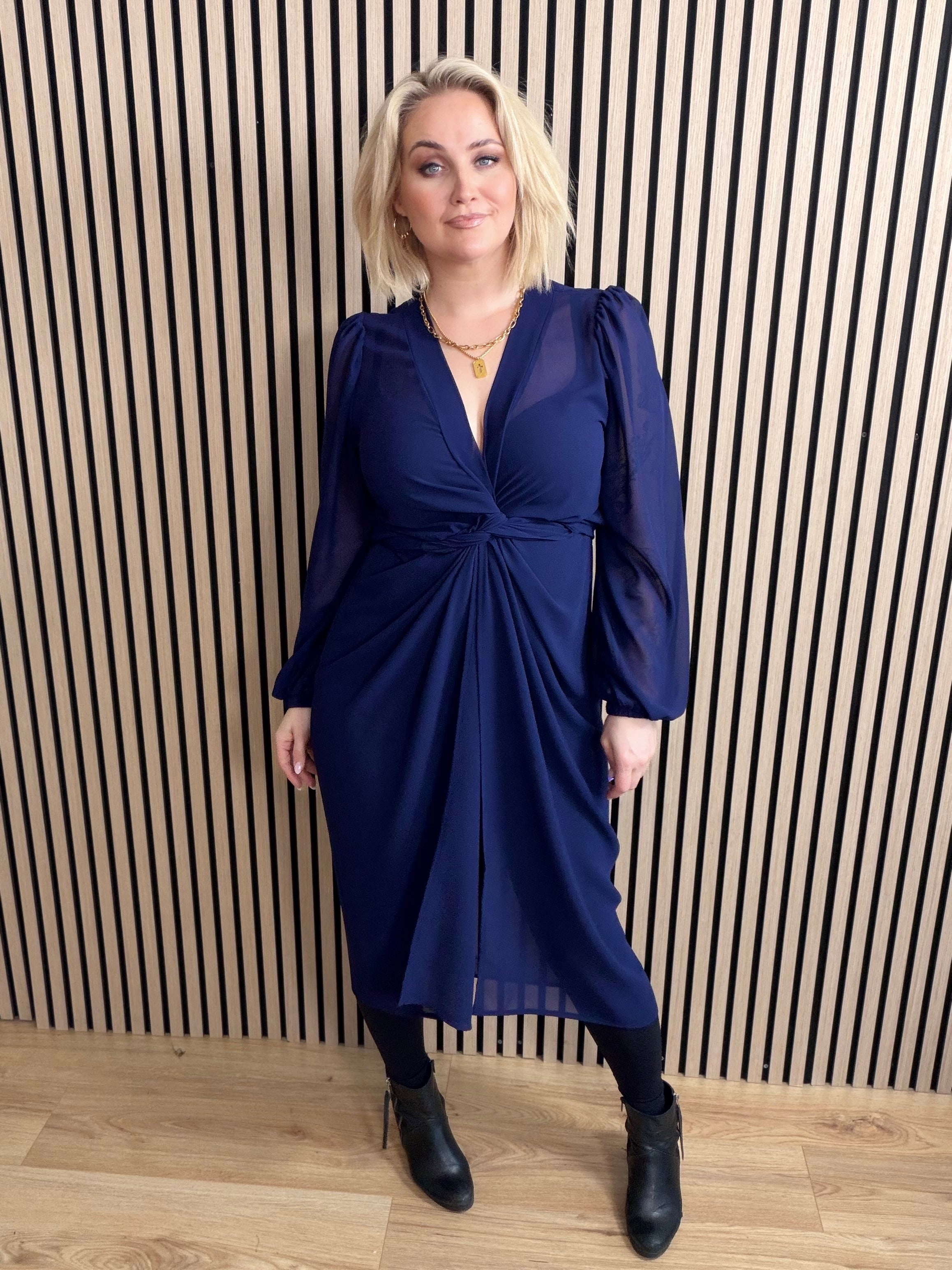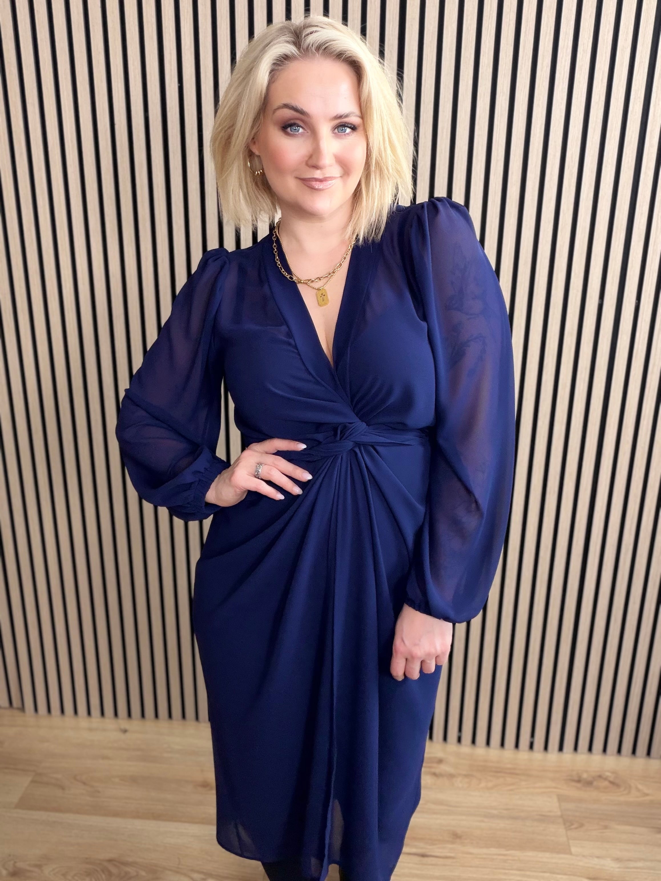 Einstaklega sparilegur og fallegur sem þó er auðvelt að klæða upp og niður. Kjóllinn er bundinn á misvíxl til að fá sem mesta lokun en einnig er hægt að rykkja hann meira saman og vera með slaufuna að framan eða í hlið og þá er mittið enn ýktara. Eða snúa frampörtunum um hvorn annan og lengja þannig hálsmálið og binda að framan eða aftan.