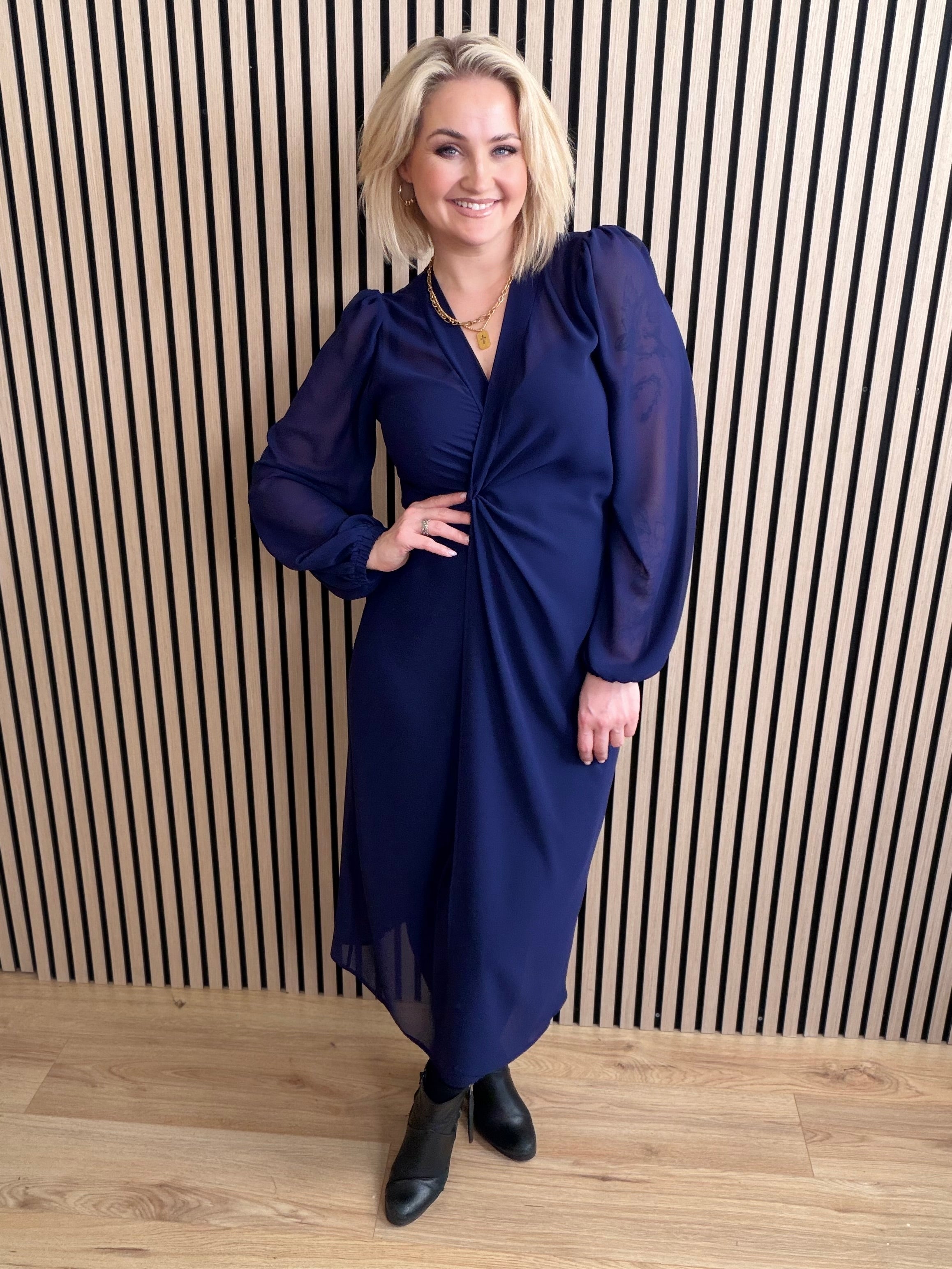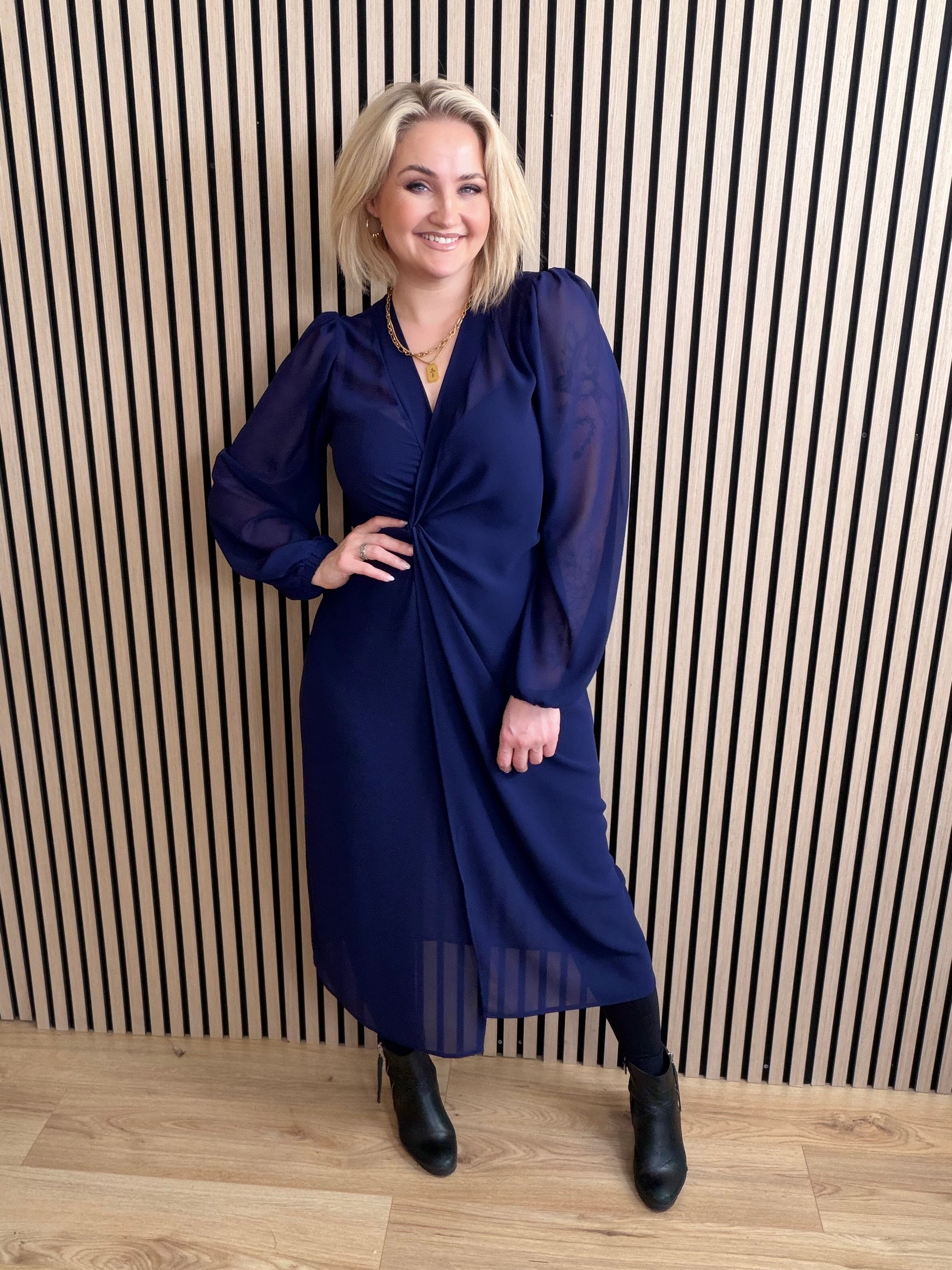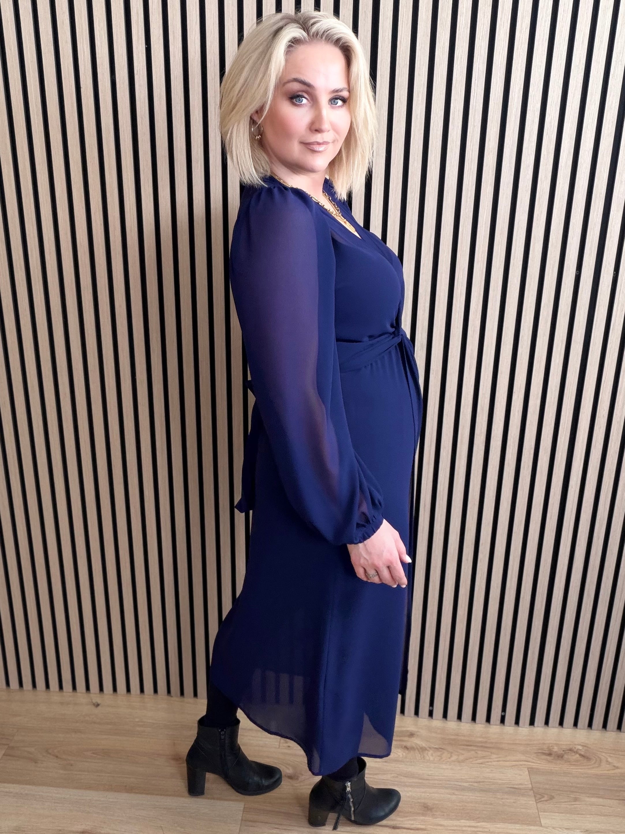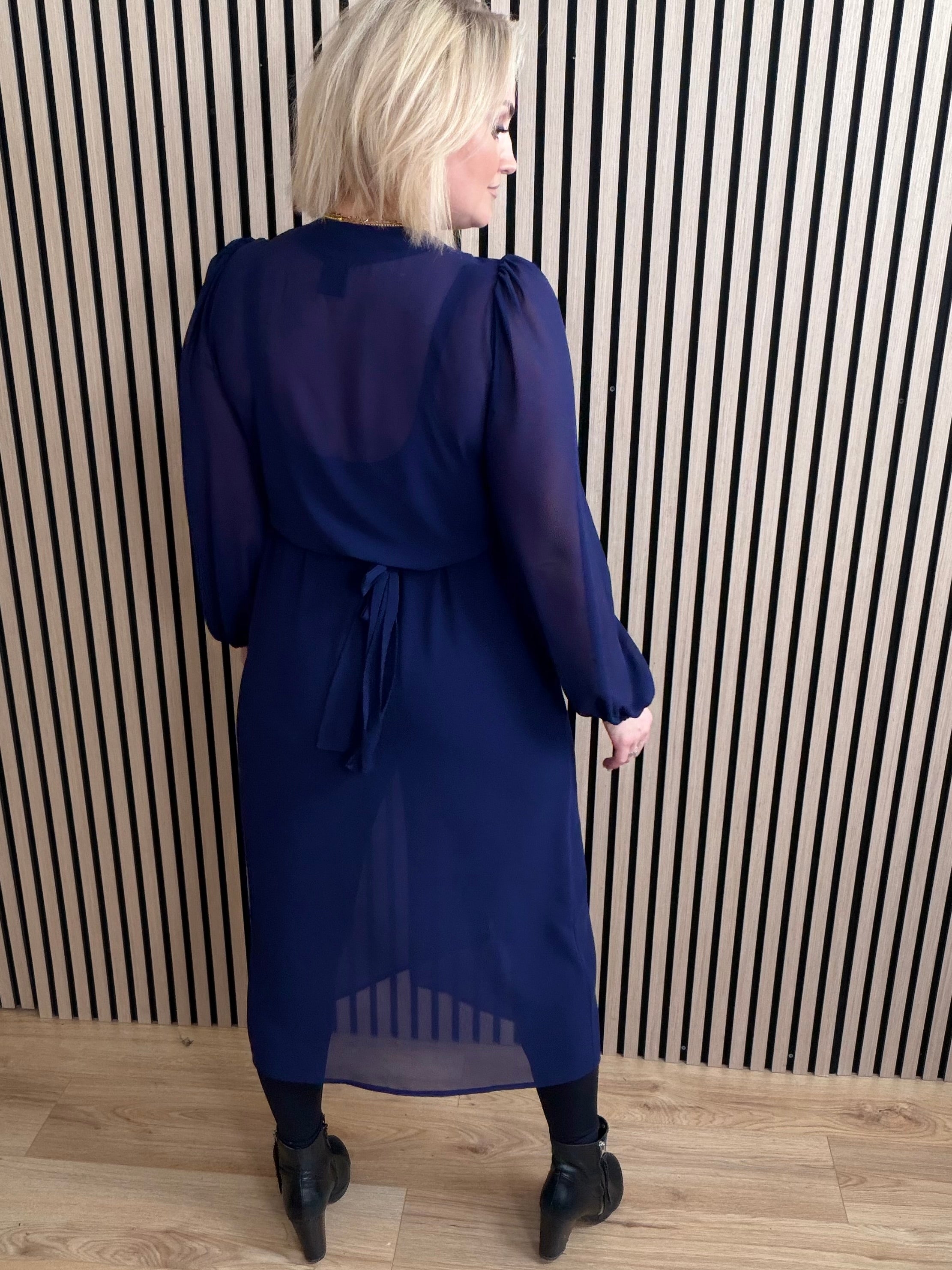 Einstaklega sparilegur og fallegur sem þó er auðvelt að klæða upp og niður. Kjóllinn er bundinn á misvíxl til að fá sem mesta lokun en einnig er hægt að rykkja hann meira saman og vera með slaufuna að framan eða í hlið og þá er mittið enn ýktara. Eða snúa frampörtunum um hvorn annan og lengja þannig hálsmálið og binda að framan eða aftan.