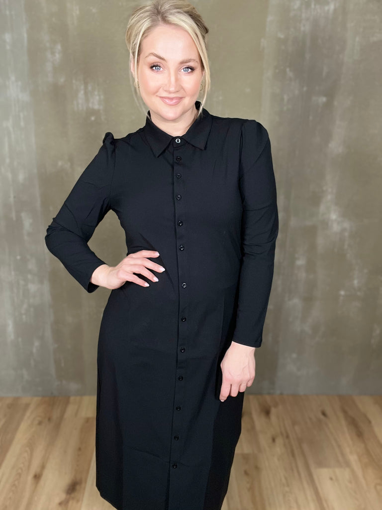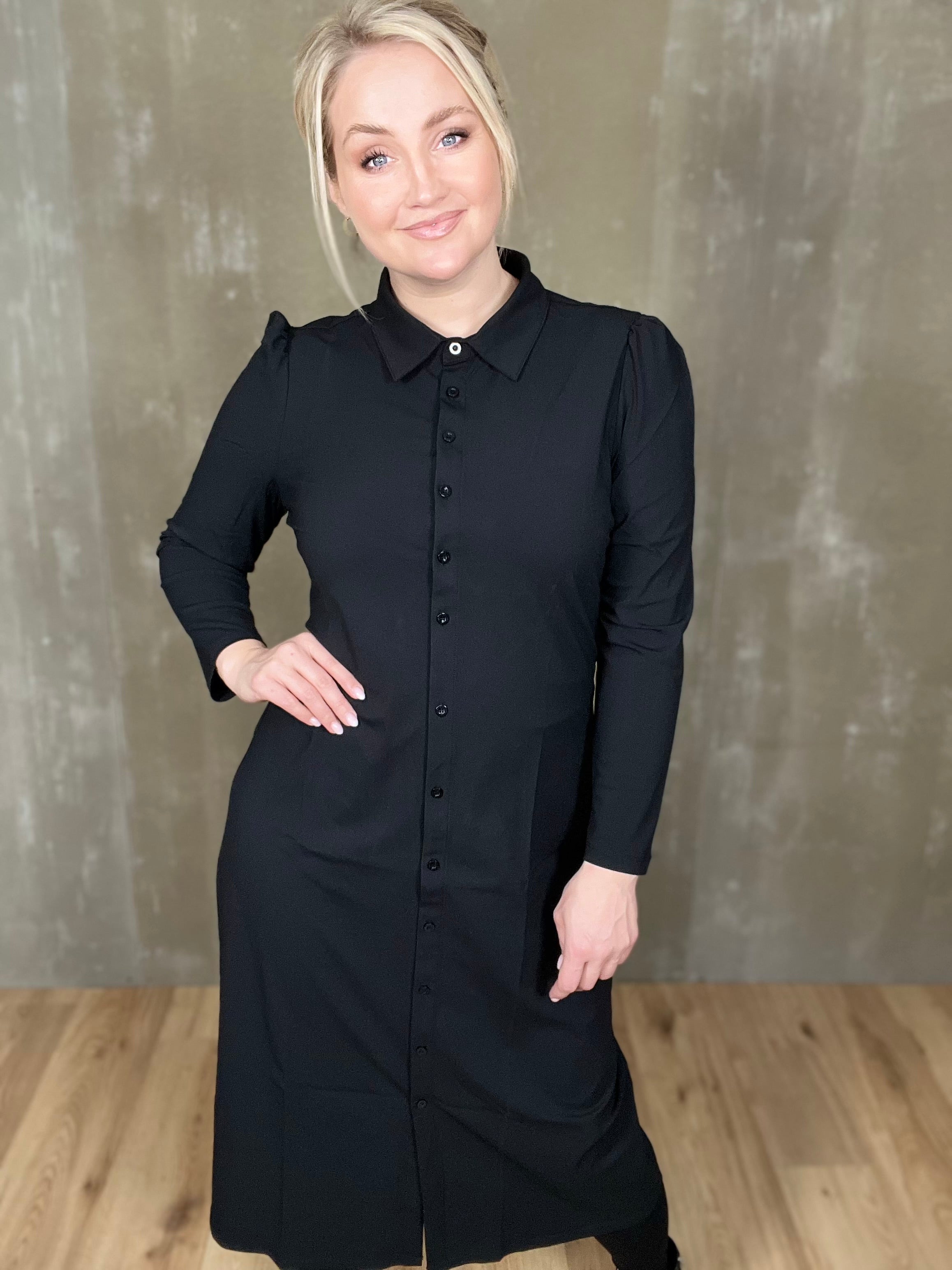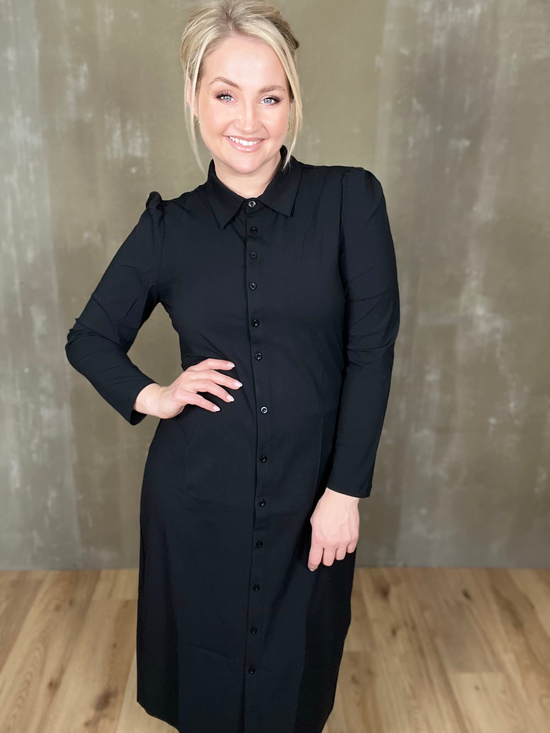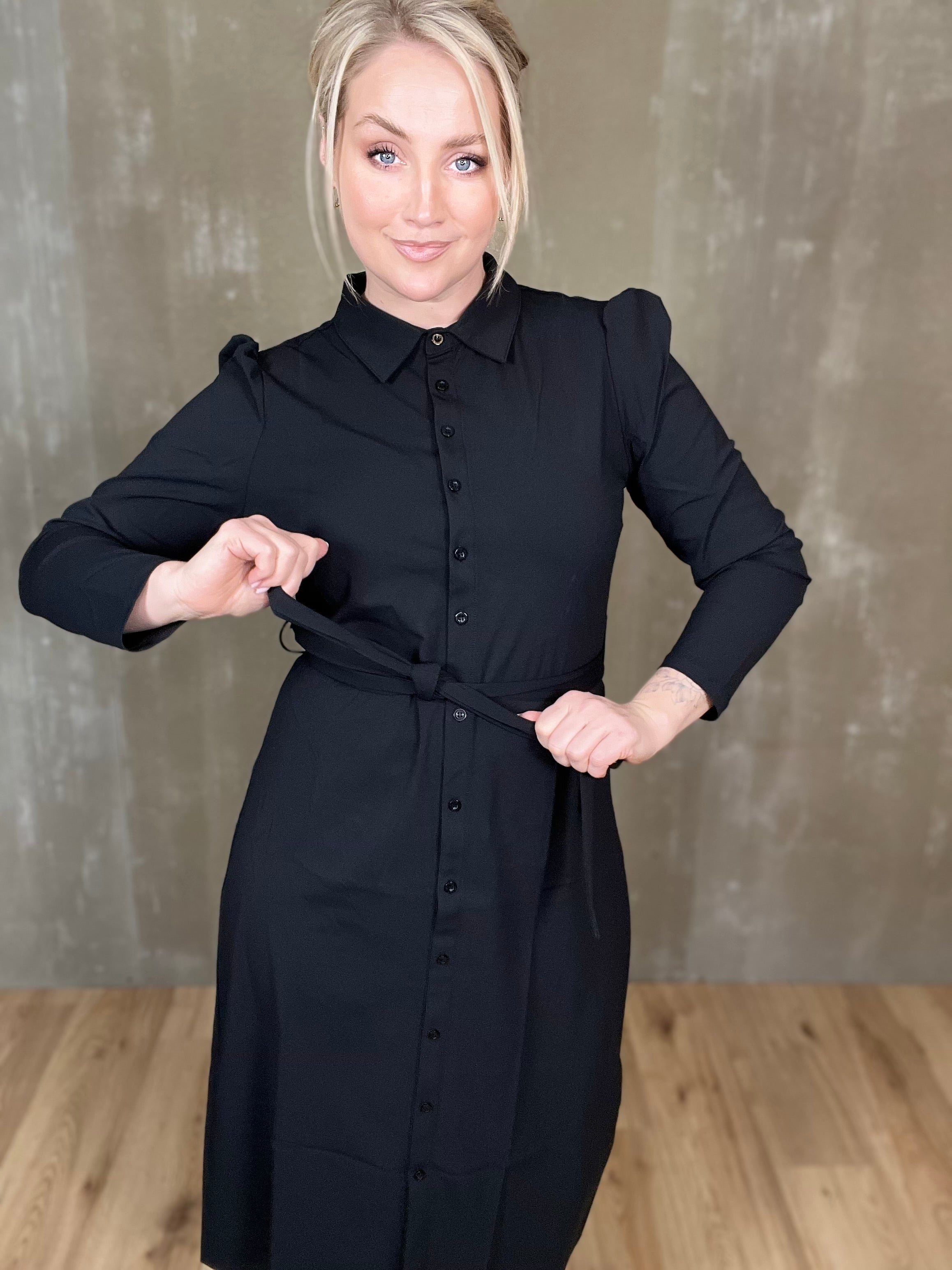 Janice er hnepptur kjóll með síðum ermum með púfföxlum. Með honum fylgir belti sem má binda í mittið eða hafa lausbundinn í baki. Ermarnar er þægilegt að draga aðeins uppá handleggi og hafa í kvart sídd. Þennan er auðvelt að klæða upp meira spari eða nota hversdags.