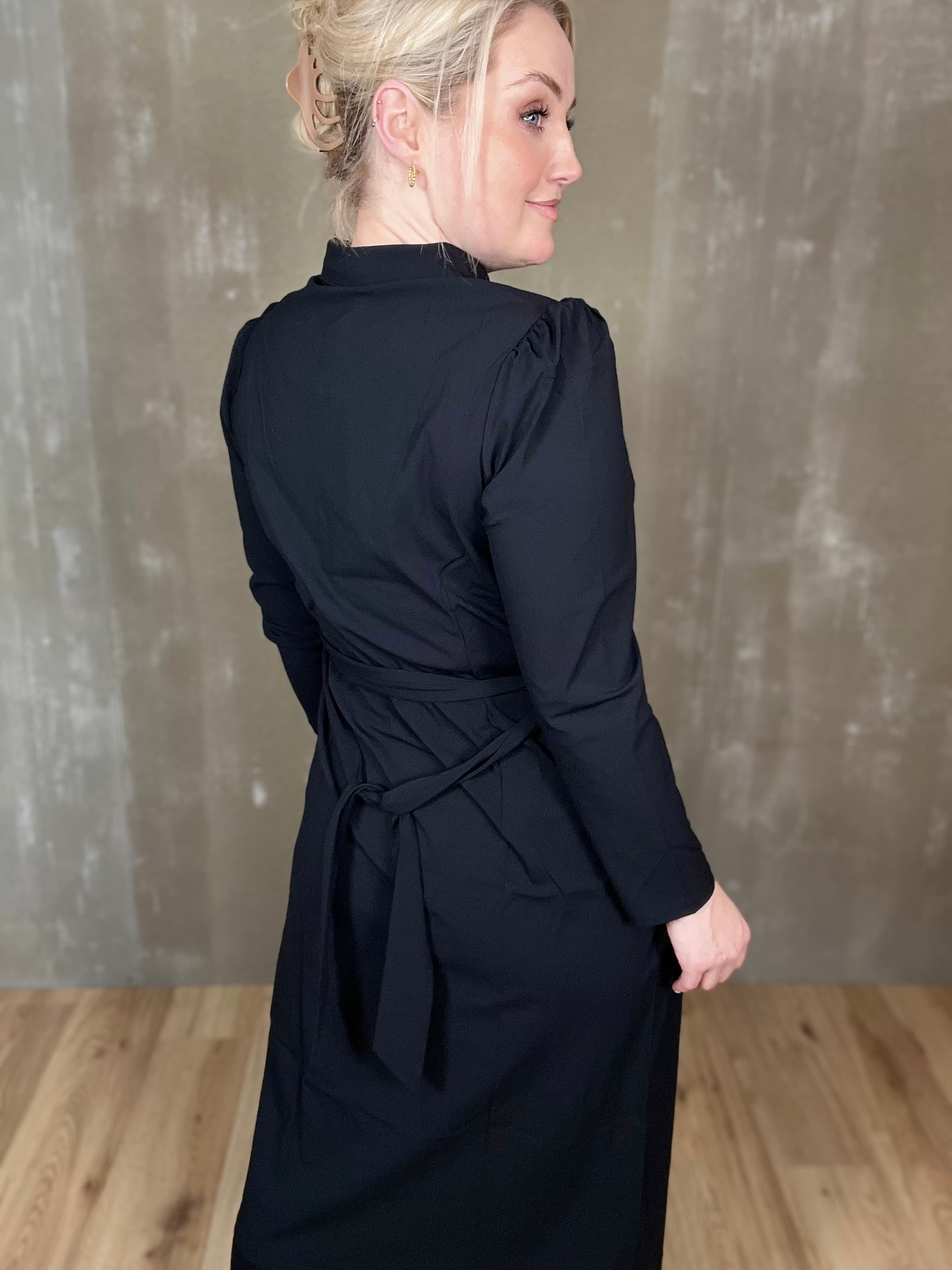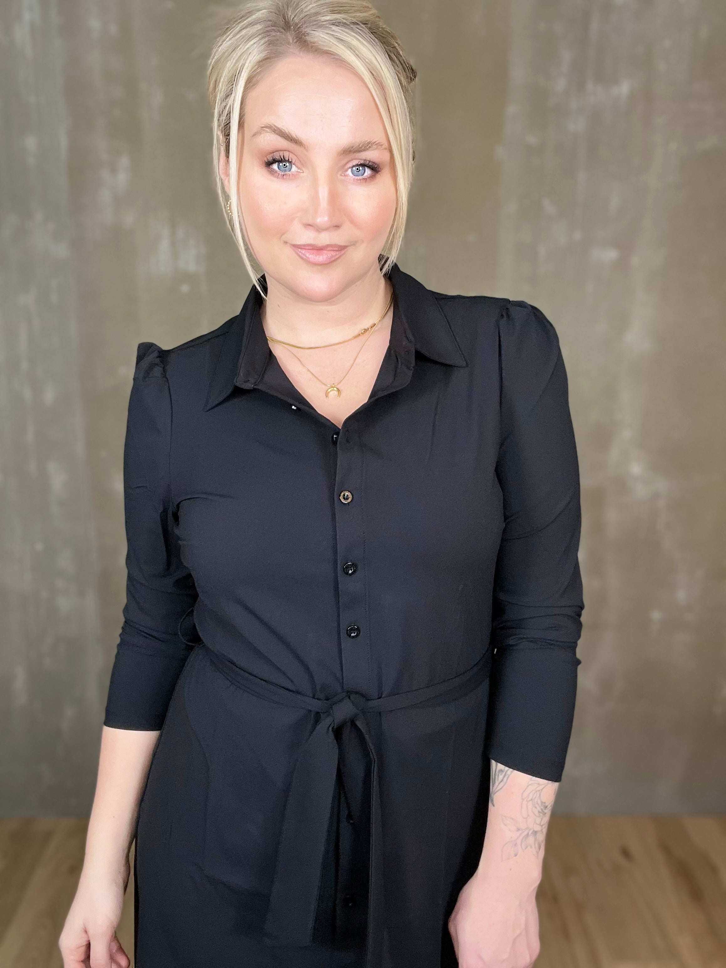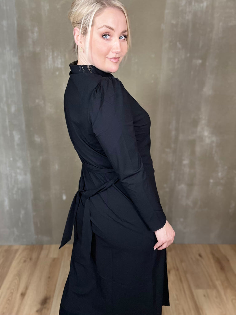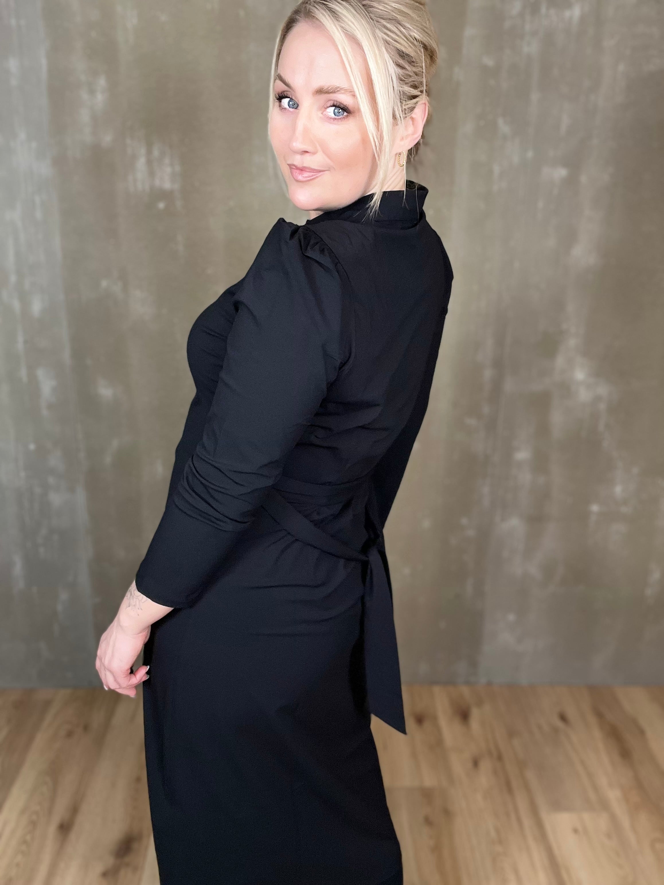 Janice er hnepptur kjóll með síðum ermum með púfföxlum. Með honum fylgir belti sem má binda í mittið eða hafa lausbundinn í baki. Ermarnar er þægilegt að draga aðeins uppá handleggi og hafa í kvart sídd. Þennan er auðvelt að klæða upp meira spari eða nota hversdags.