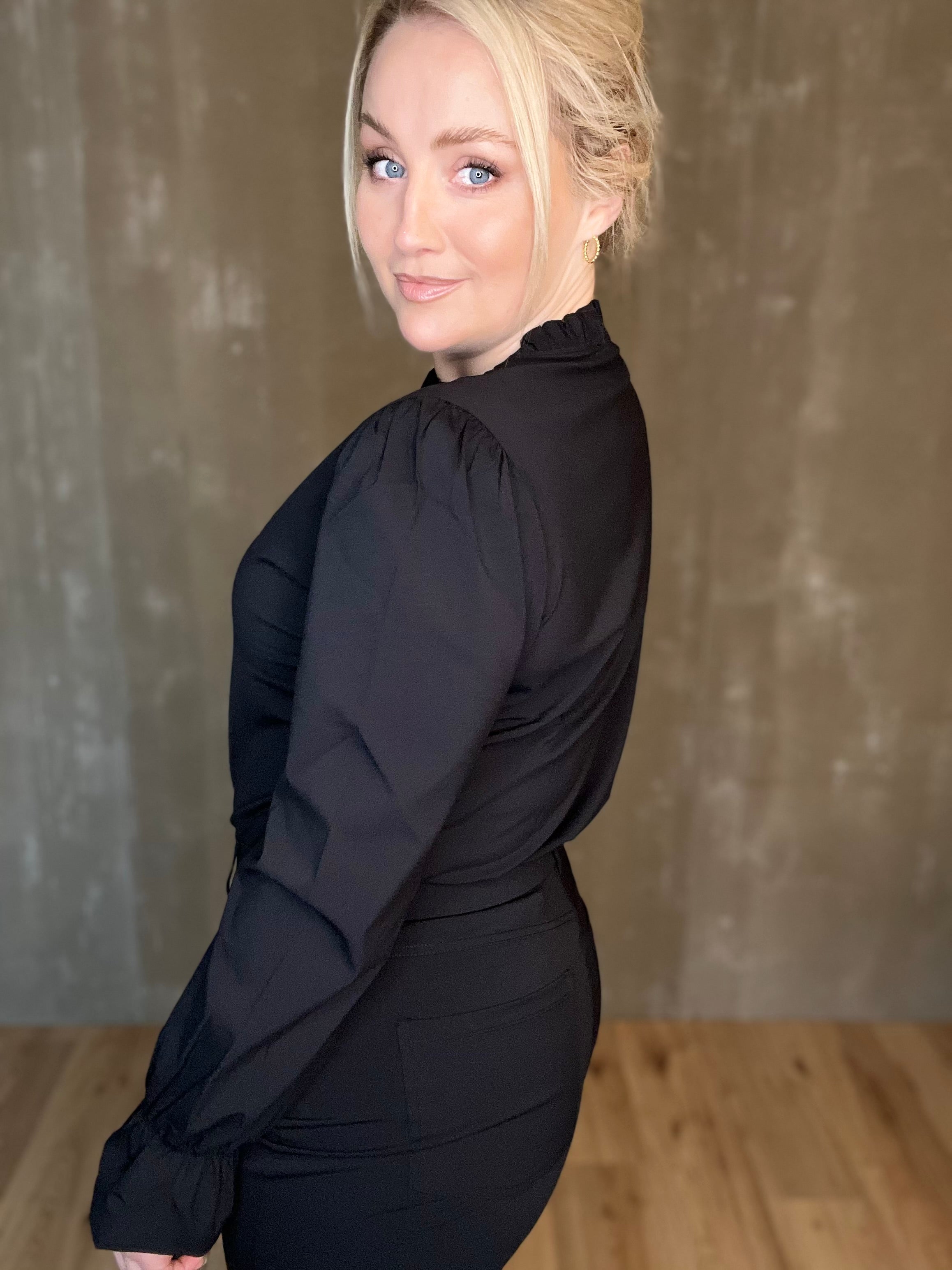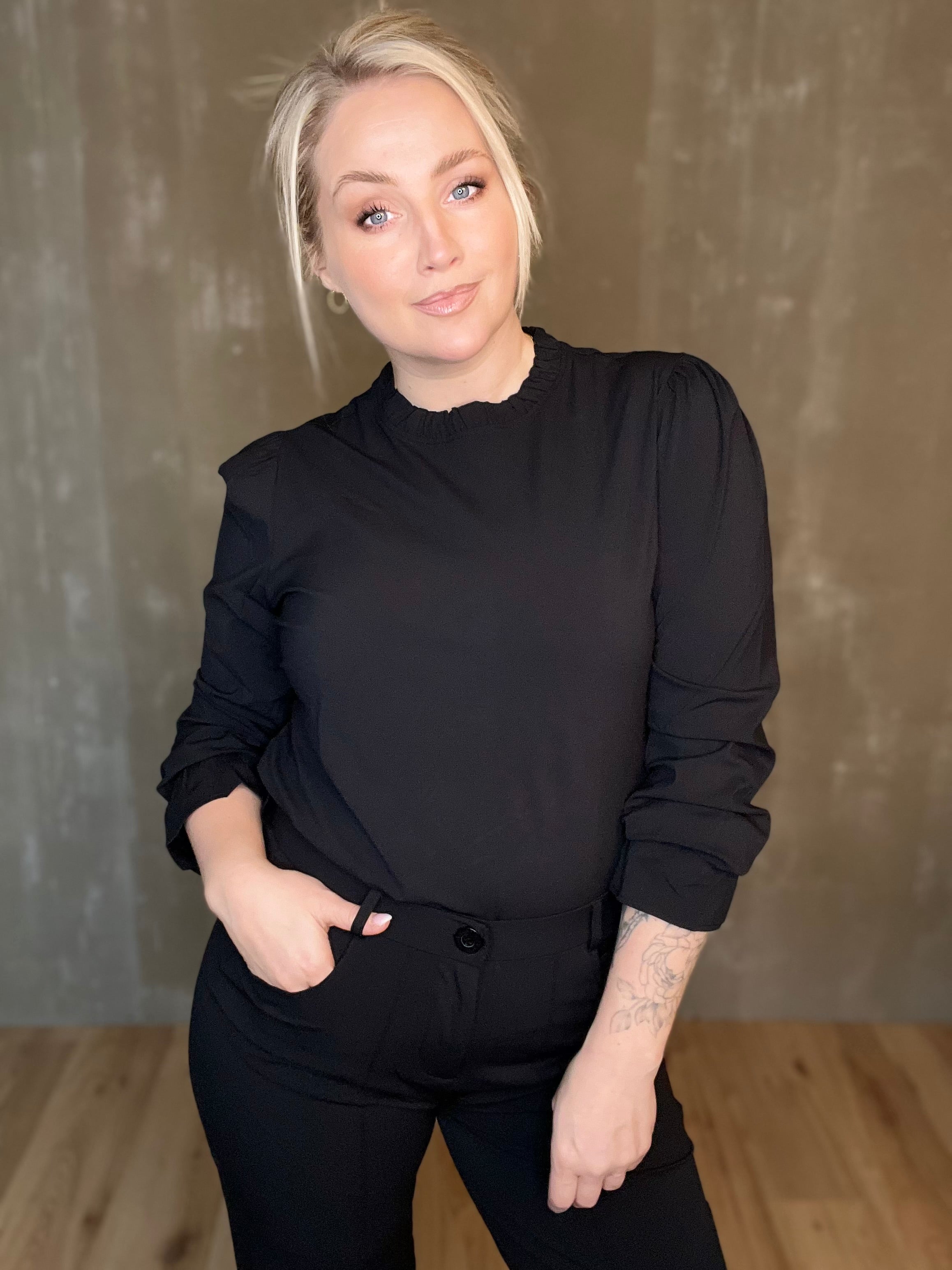 Glæsileg blússa frá Zoso úr hágæða travel-efni! Jeyda Fancy Travel blússan er með fallegum smáatriðum eins og rykktum kraga og ermum en teygjan fremst á ermunum er þægileg og mjúk sem gerir það auðvelt að draga hana upp í kvart ef vill. Púffermar, falleg vídd sem einnig er smart að girða ofan í mitta, við erum að elska þessa!