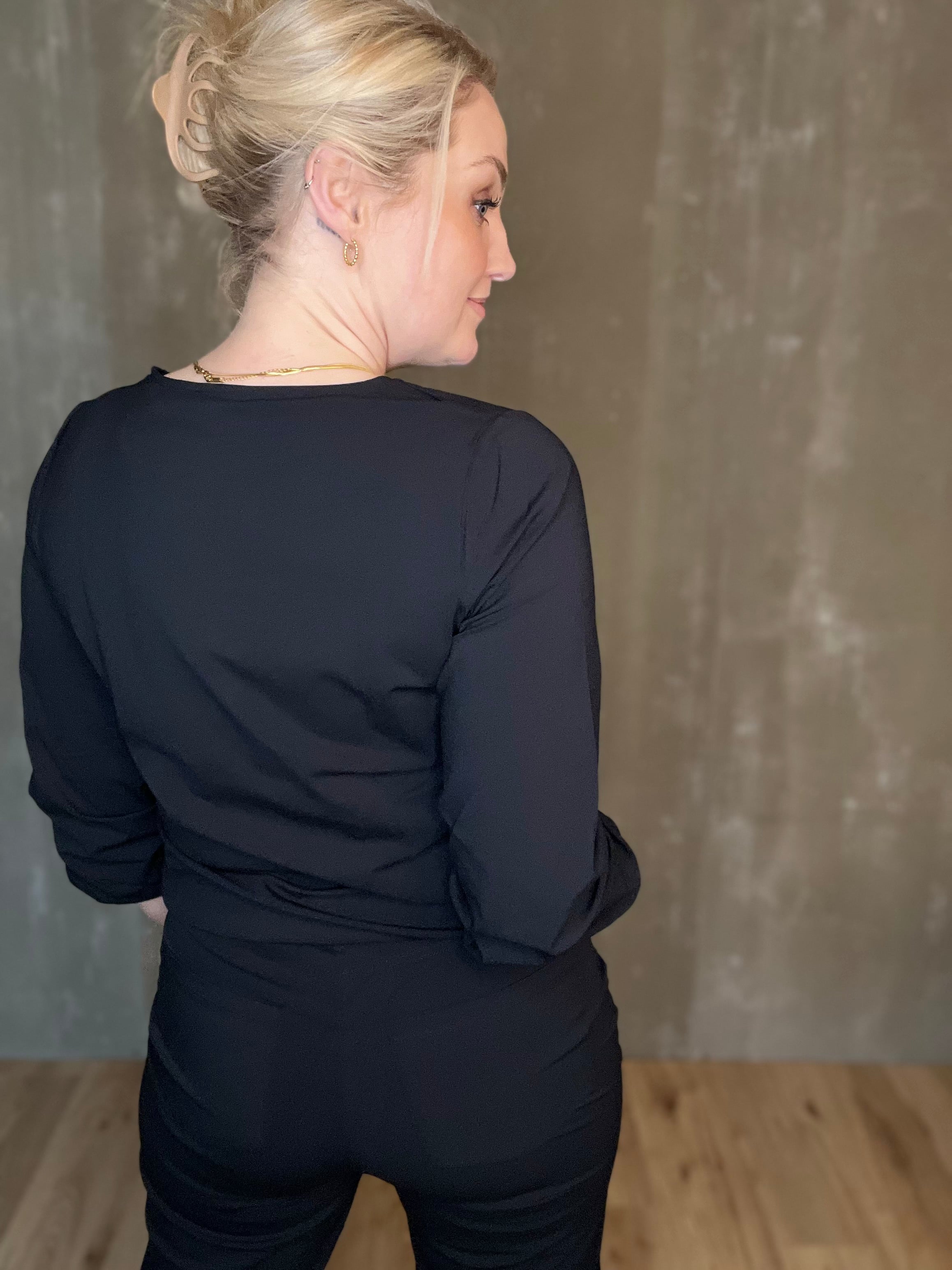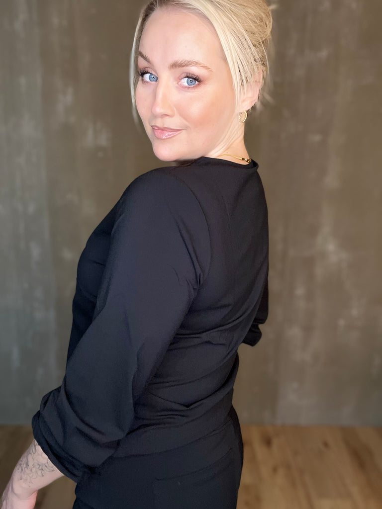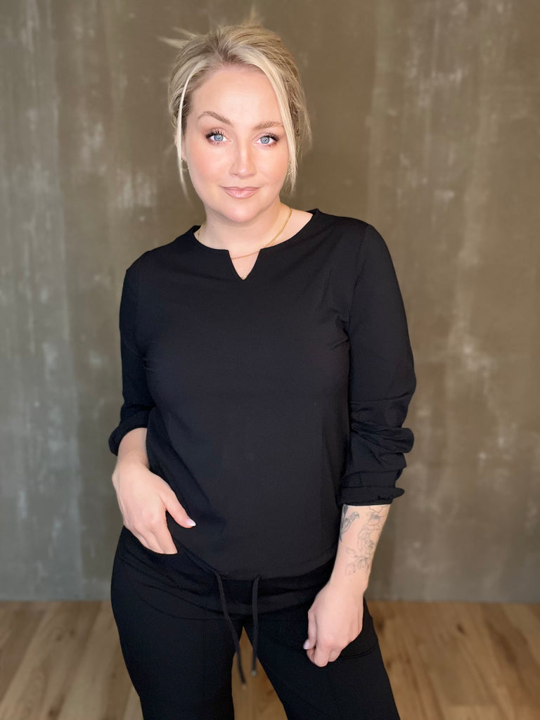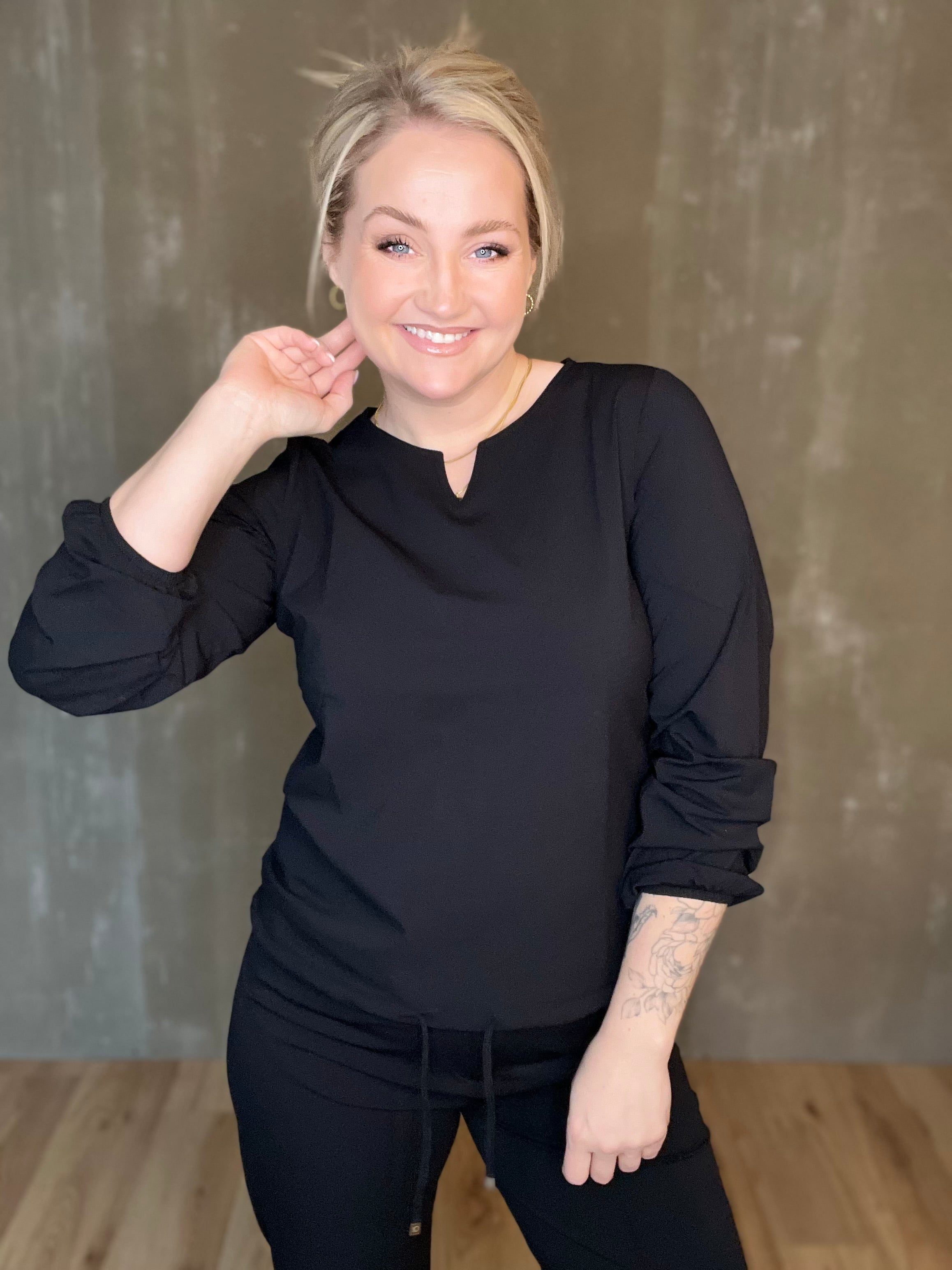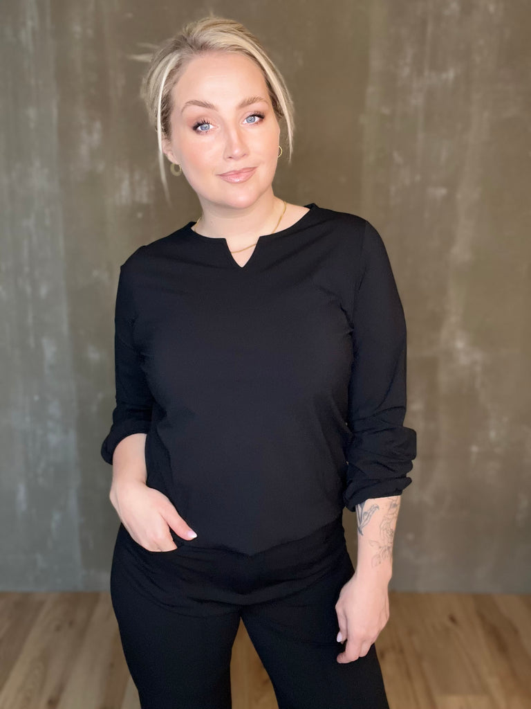 Fallegur grunn toppur frá Zoso úr hágæða travel-efni! Joan toppurinn er með síðum ermum, V-hálsmáli og reim neðst á bolnum sem hægt er að stilla og fá þannig aukna vídd yfir magasvæði. Þessi er með aðeins meiri vídd líka í ermum og mjúkri teygju fremst.