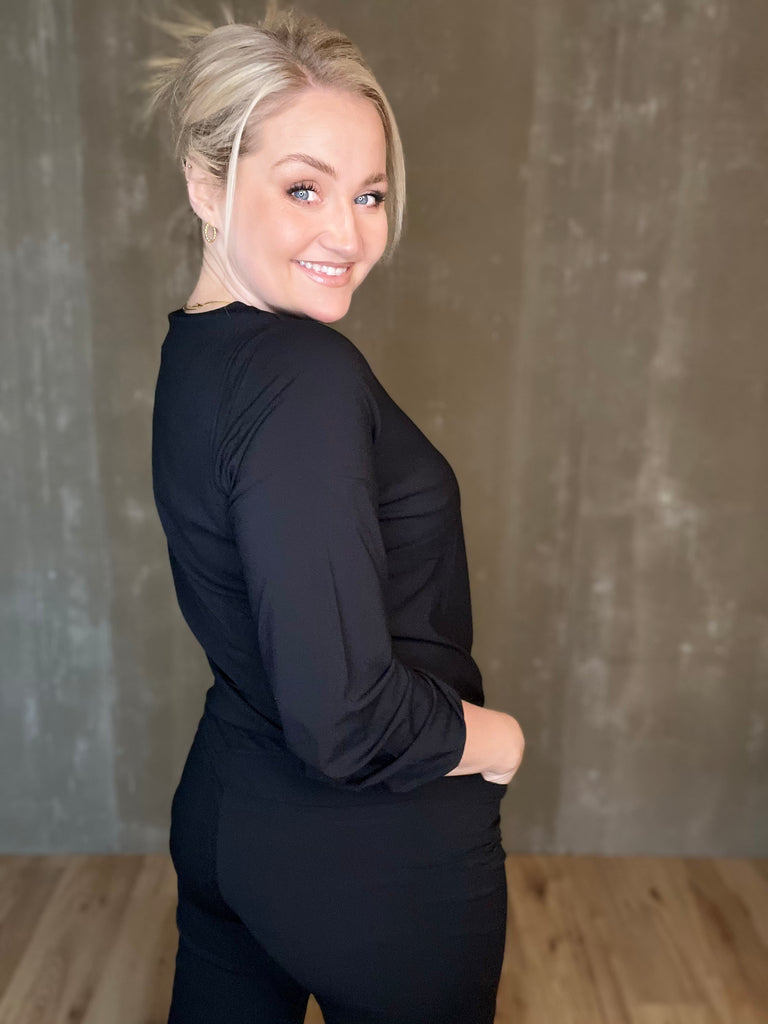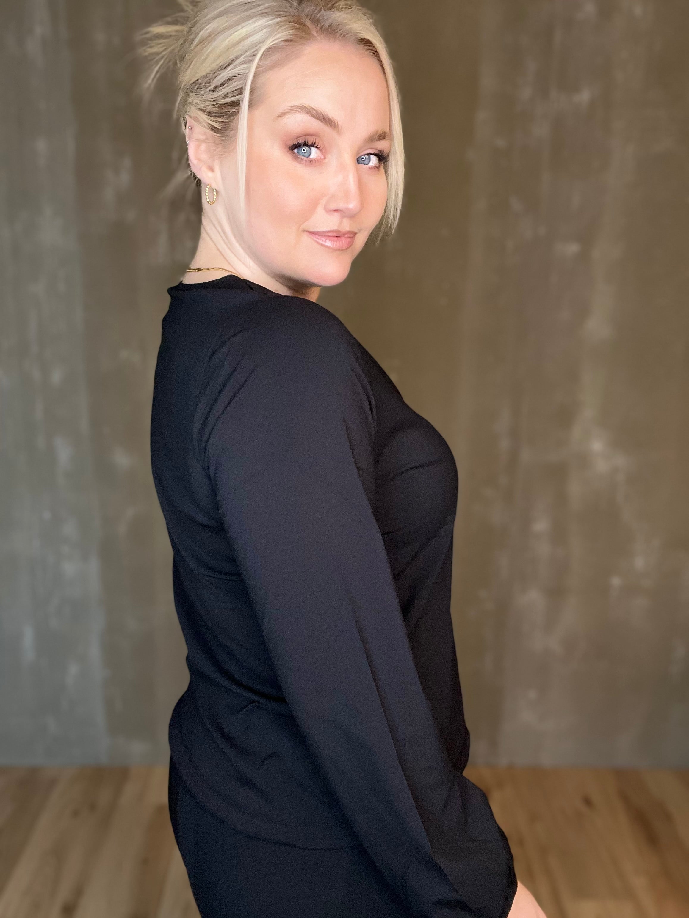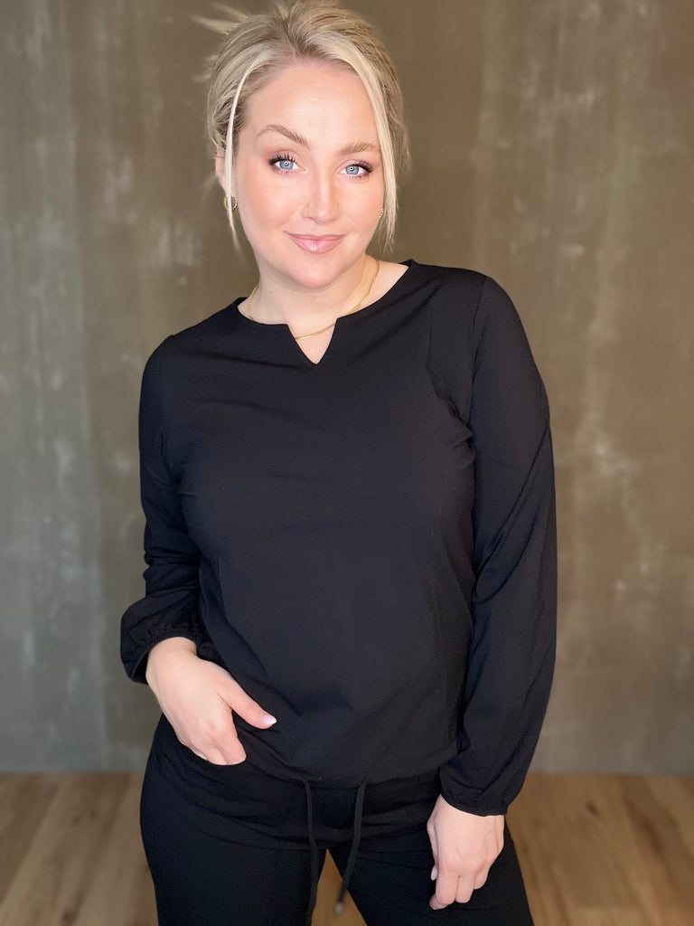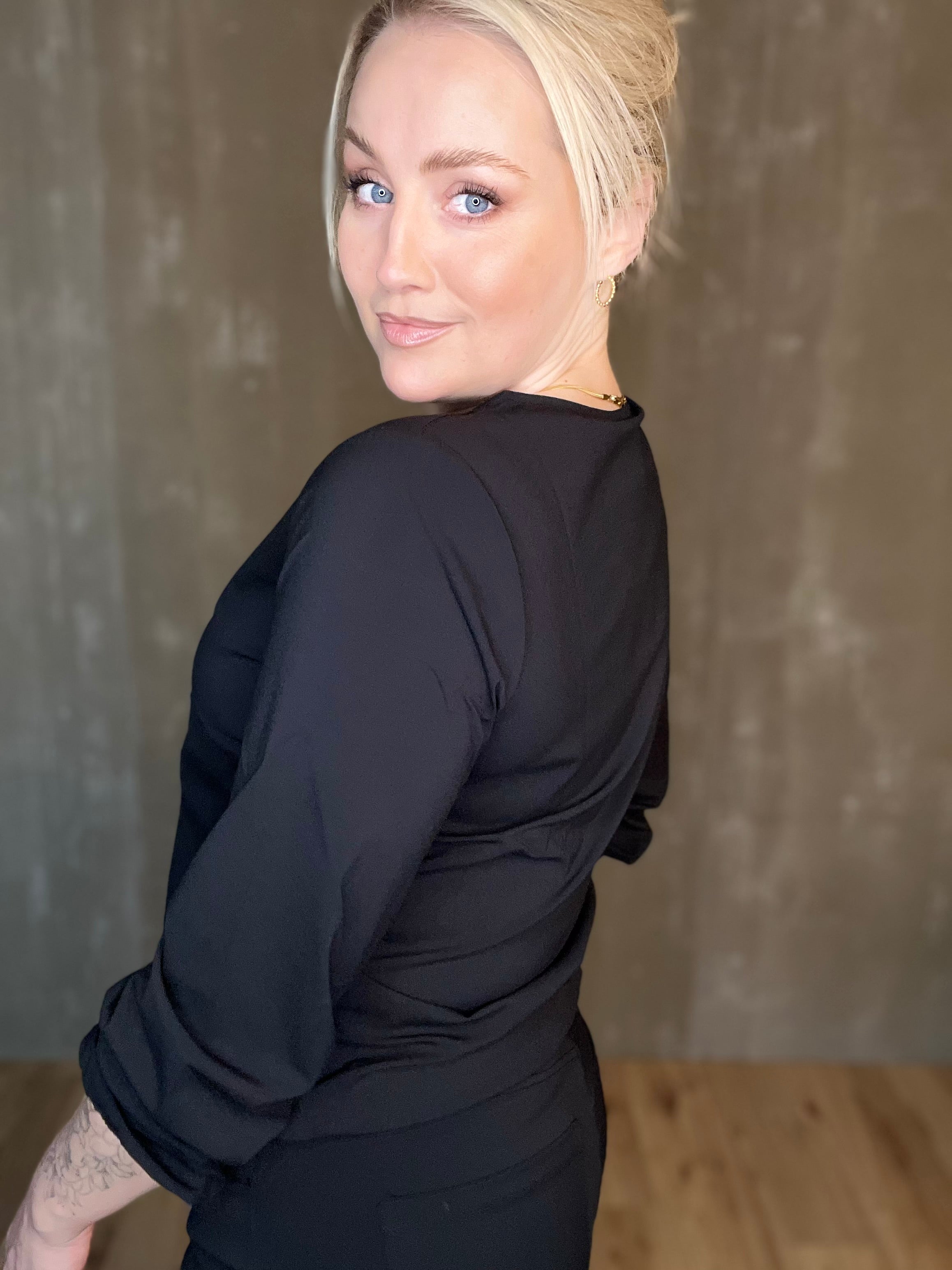 Fallegur grunn toppur frá Zoso úr hágæða travel-efni! Joan toppurinn er með síðum ermum, V-hálsmáli og reim neðst á bolnum sem hægt er að stilla og fá þannig aukna vídd yfir magasvæði. Þessi er með aðeins meiri vídd líka í ermum og mjúkri teygju fremst.