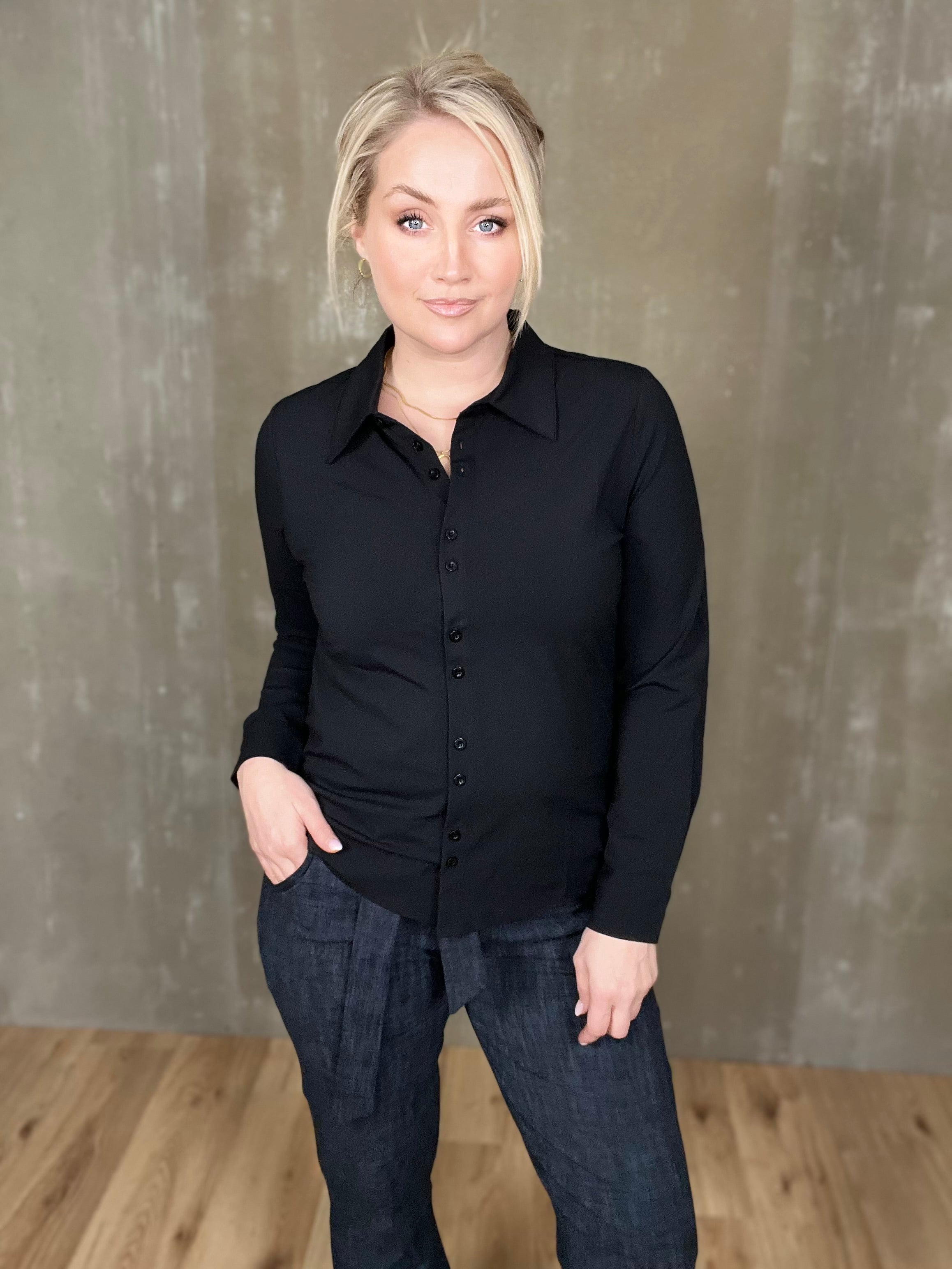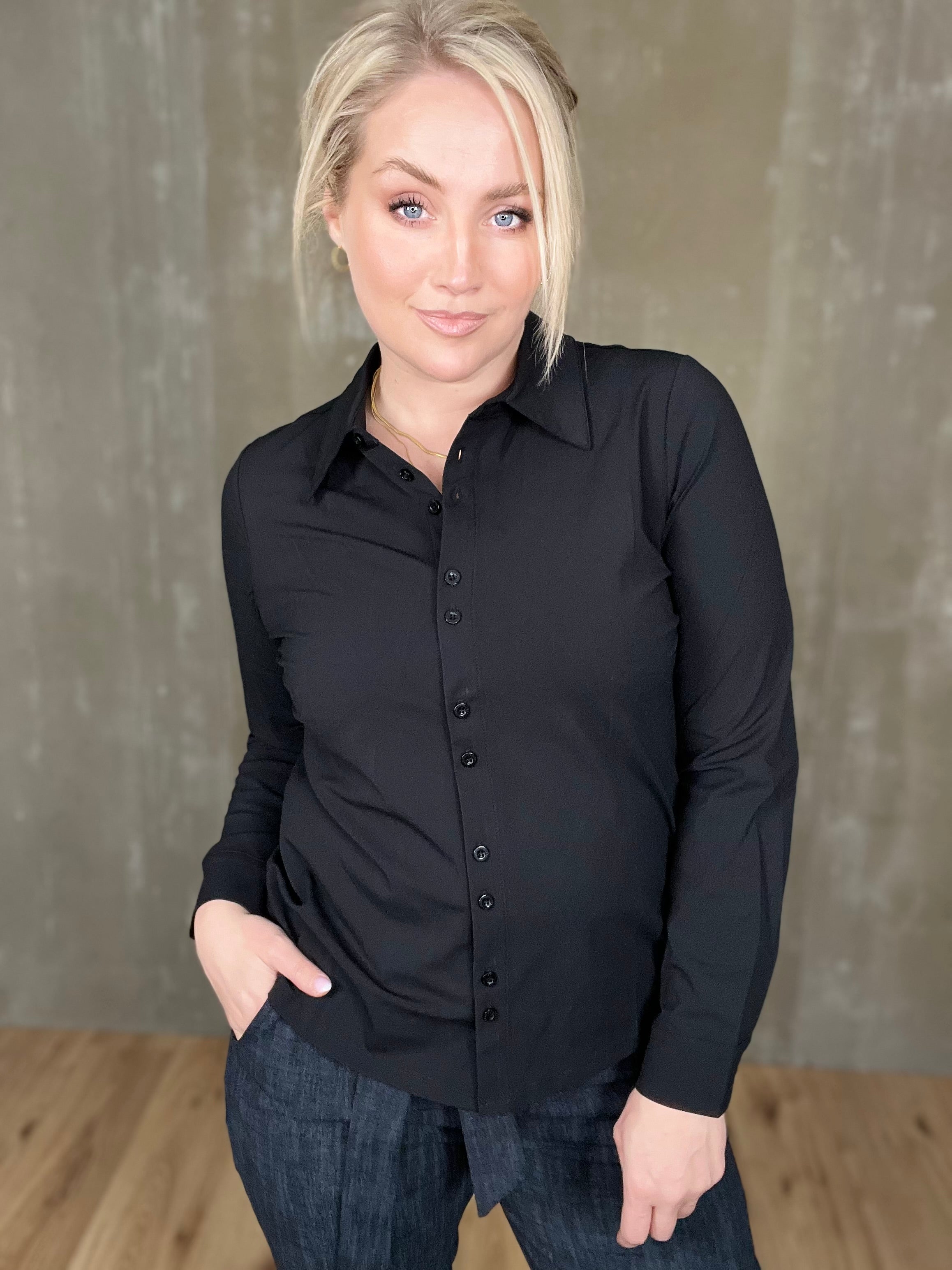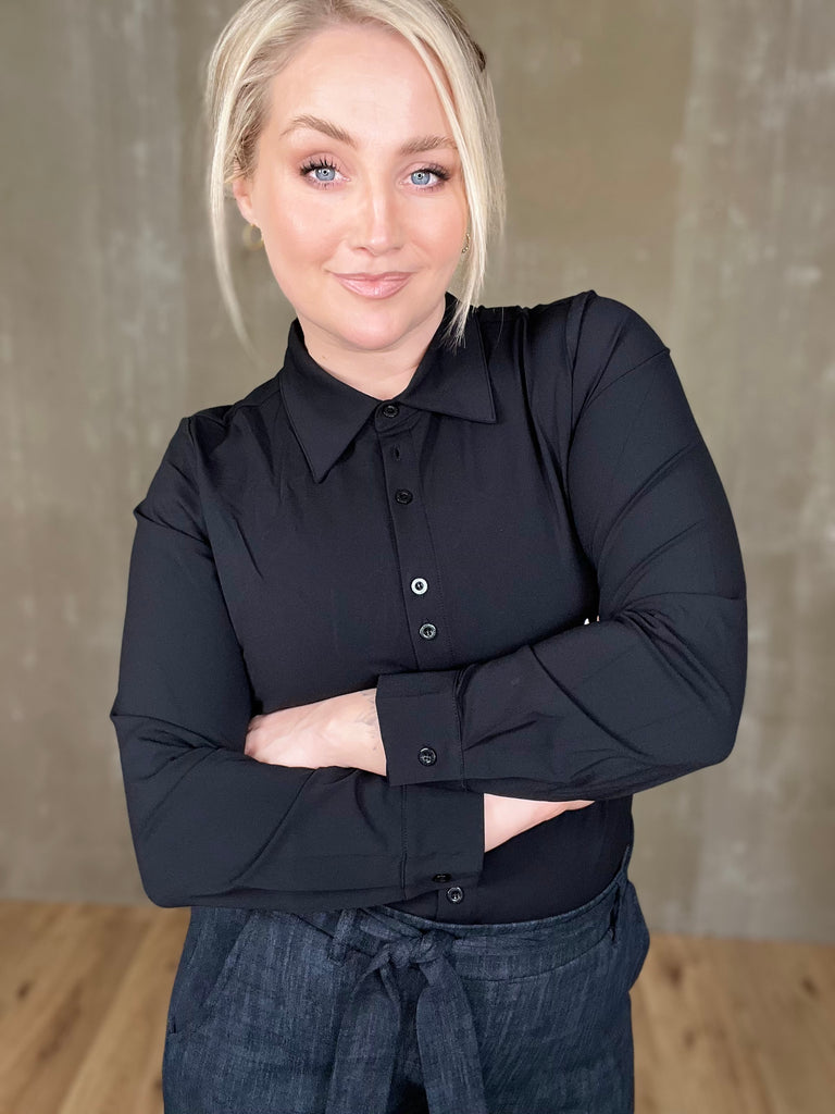 Þessi er klassísk! Einstaklega falleg og tímalaus skyrta úr dásemdar travel efninu sem heldur sér svo vel með heilmikilli teygju. Þessi er líka svo mikil snilld með tveimur tölum í einu niður að framan sem kemur sér svo vel þegar það er teygjuefni en tölurnar sporna við því að gapi.
