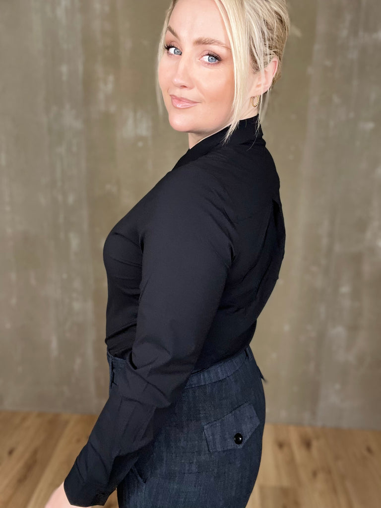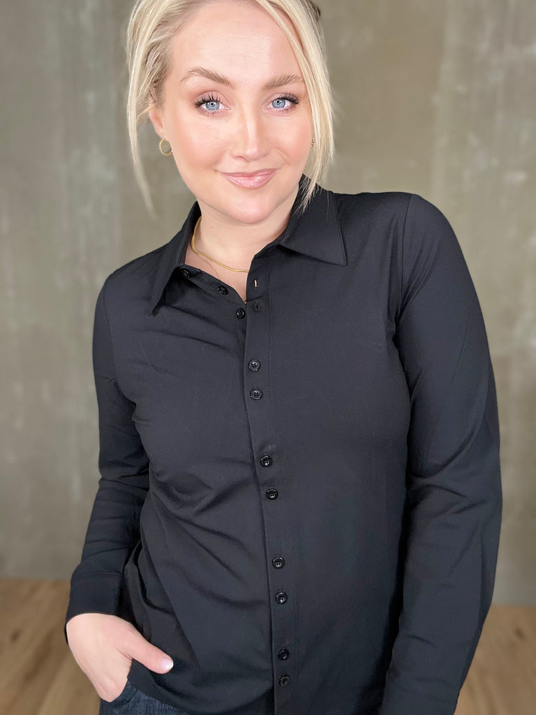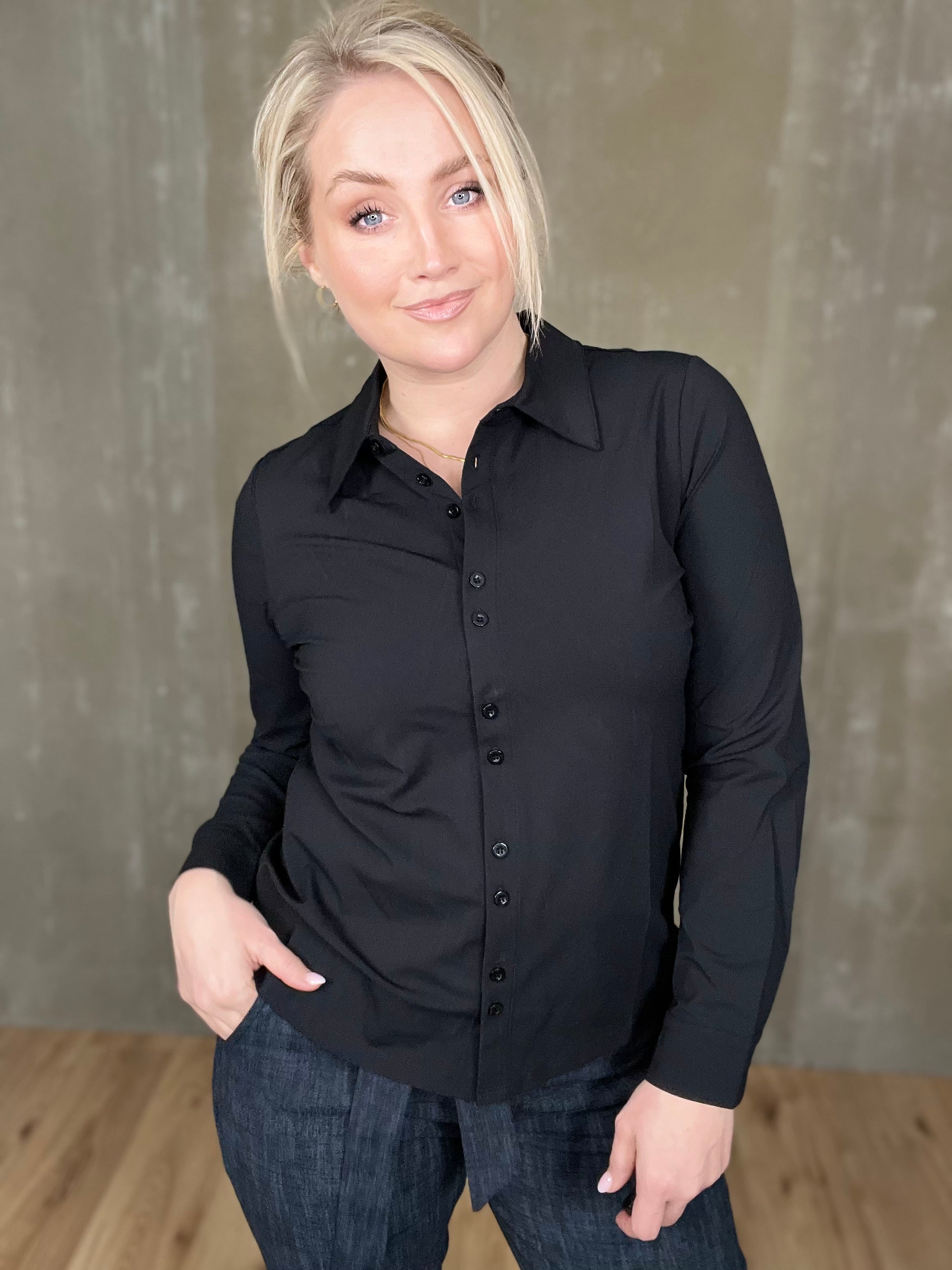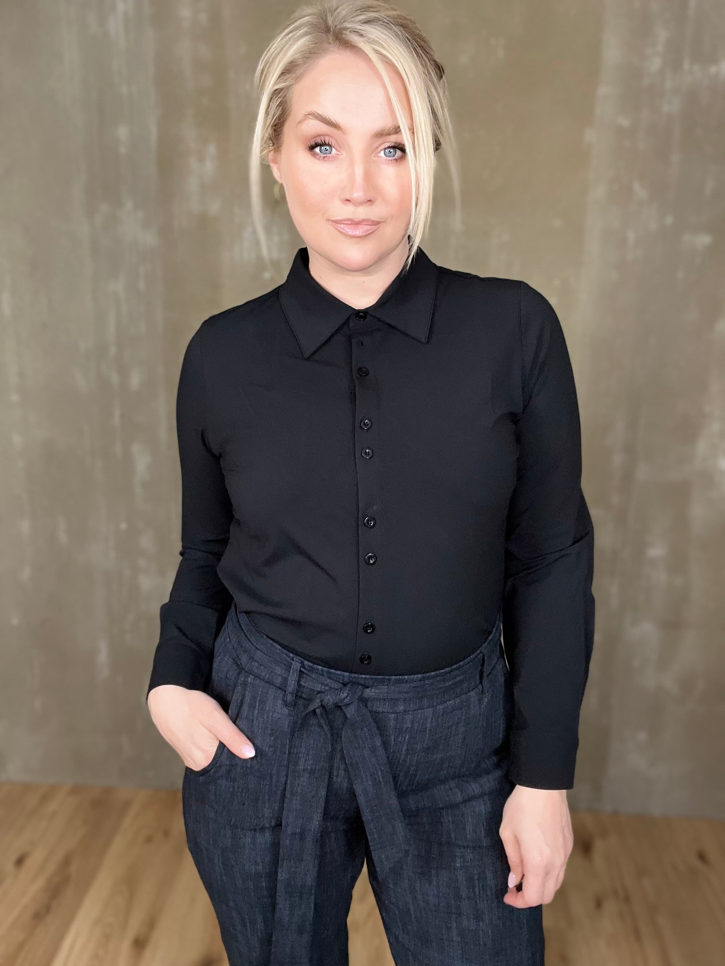 Þessi er klassísk! Einstaklega falleg og tímalaus skyrta úr dásemdar travel efninu sem heldur sér svo vel með heilmikilli teygju. Þessi er líka svo mikil snilld með tveimur tölum í einu niður að framan sem kemur sér svo vel þegar það er teygjuefni en tölurnar sporna við því að gapi.