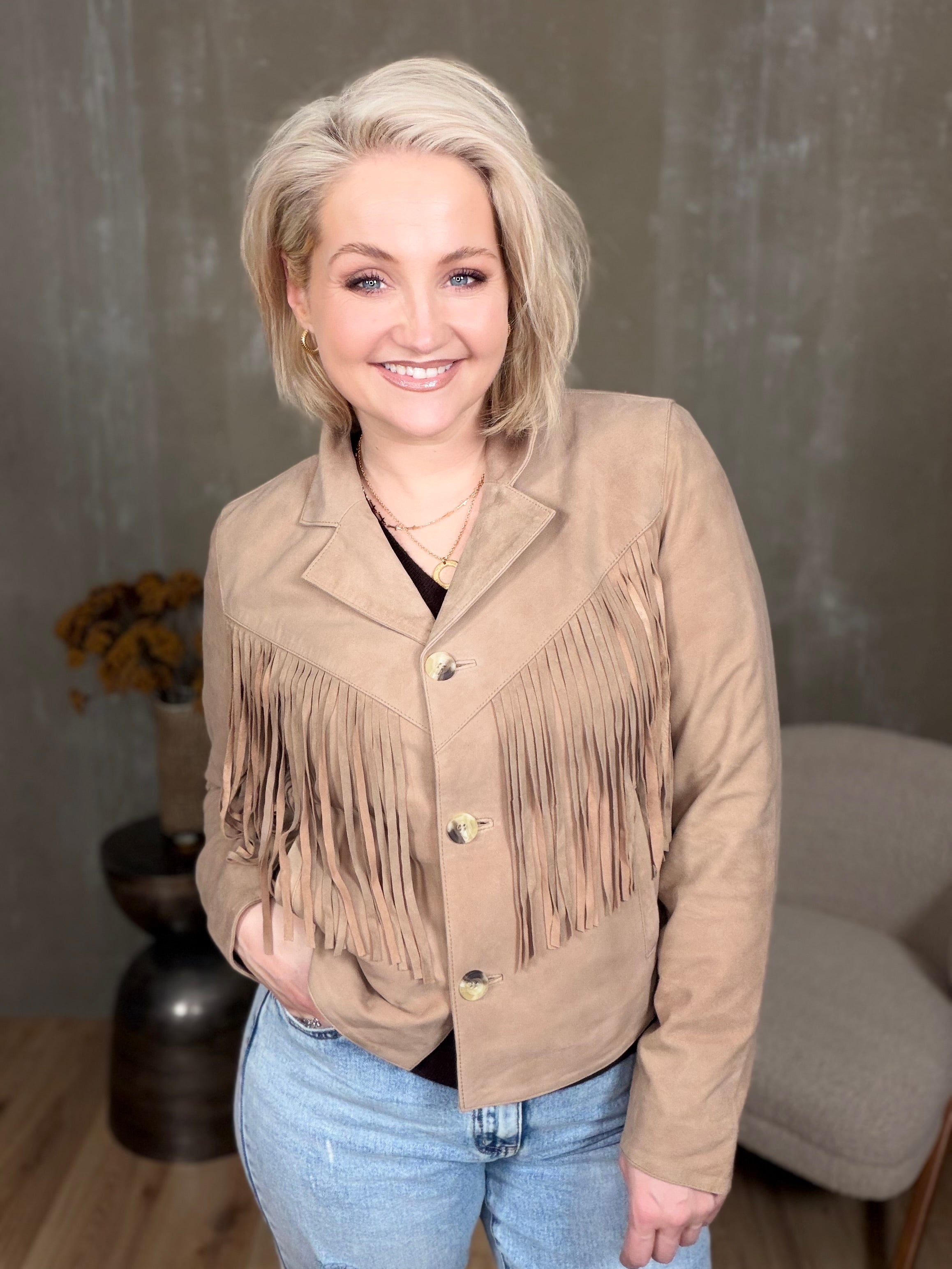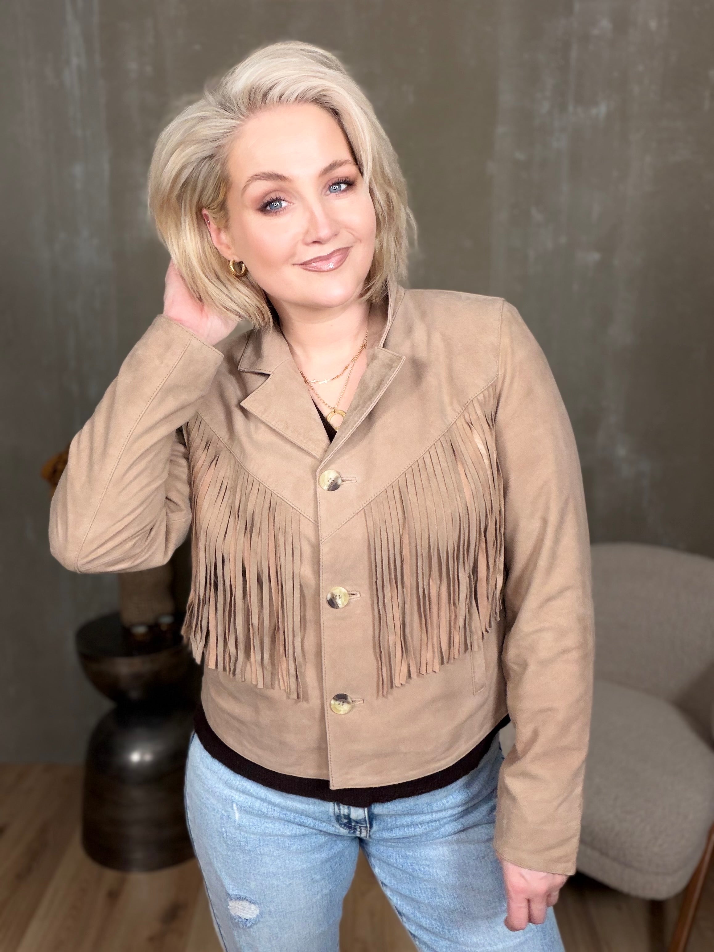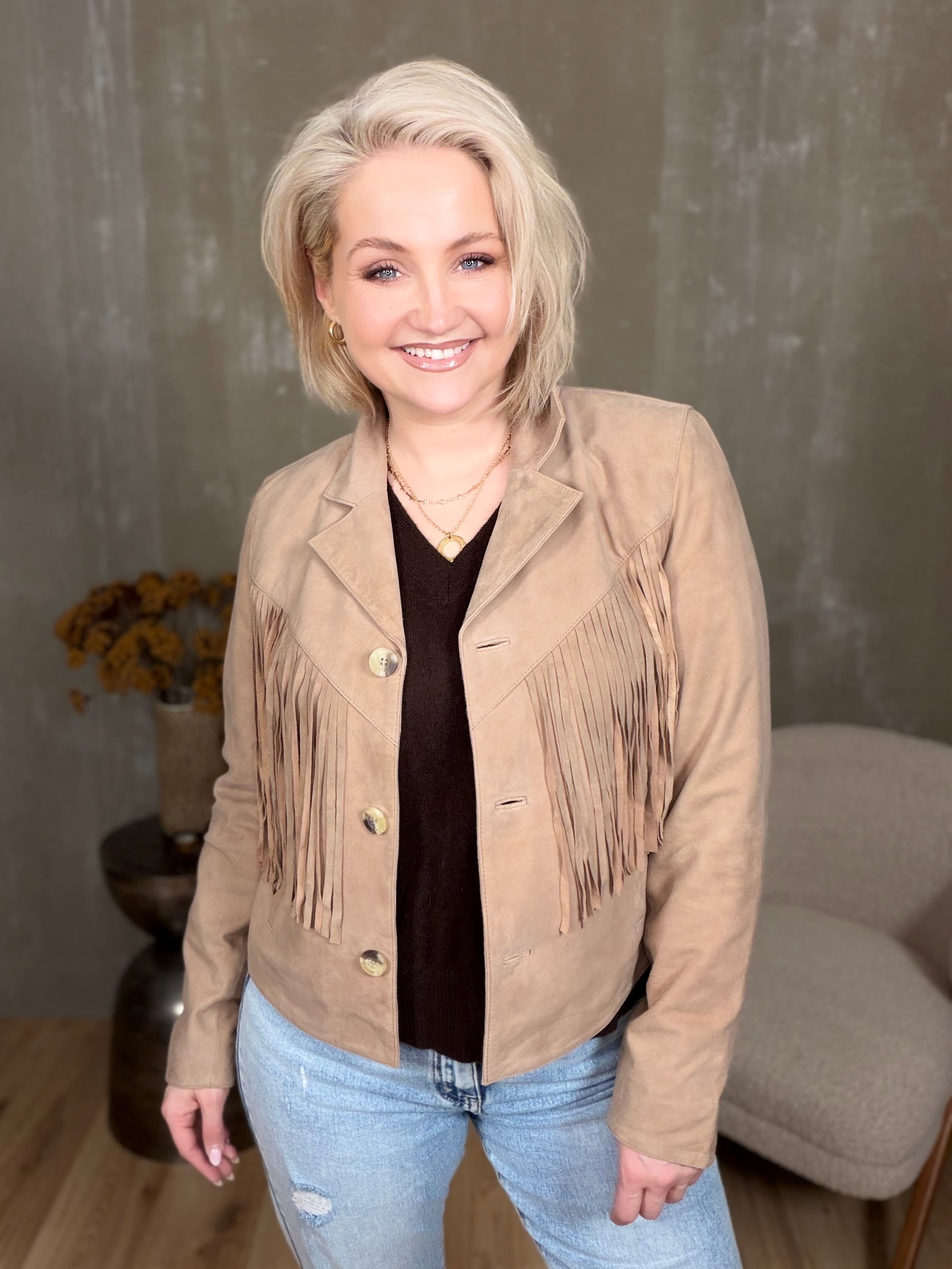 Kögurjakki úr rúskinni með tölum og vösum í hlið.