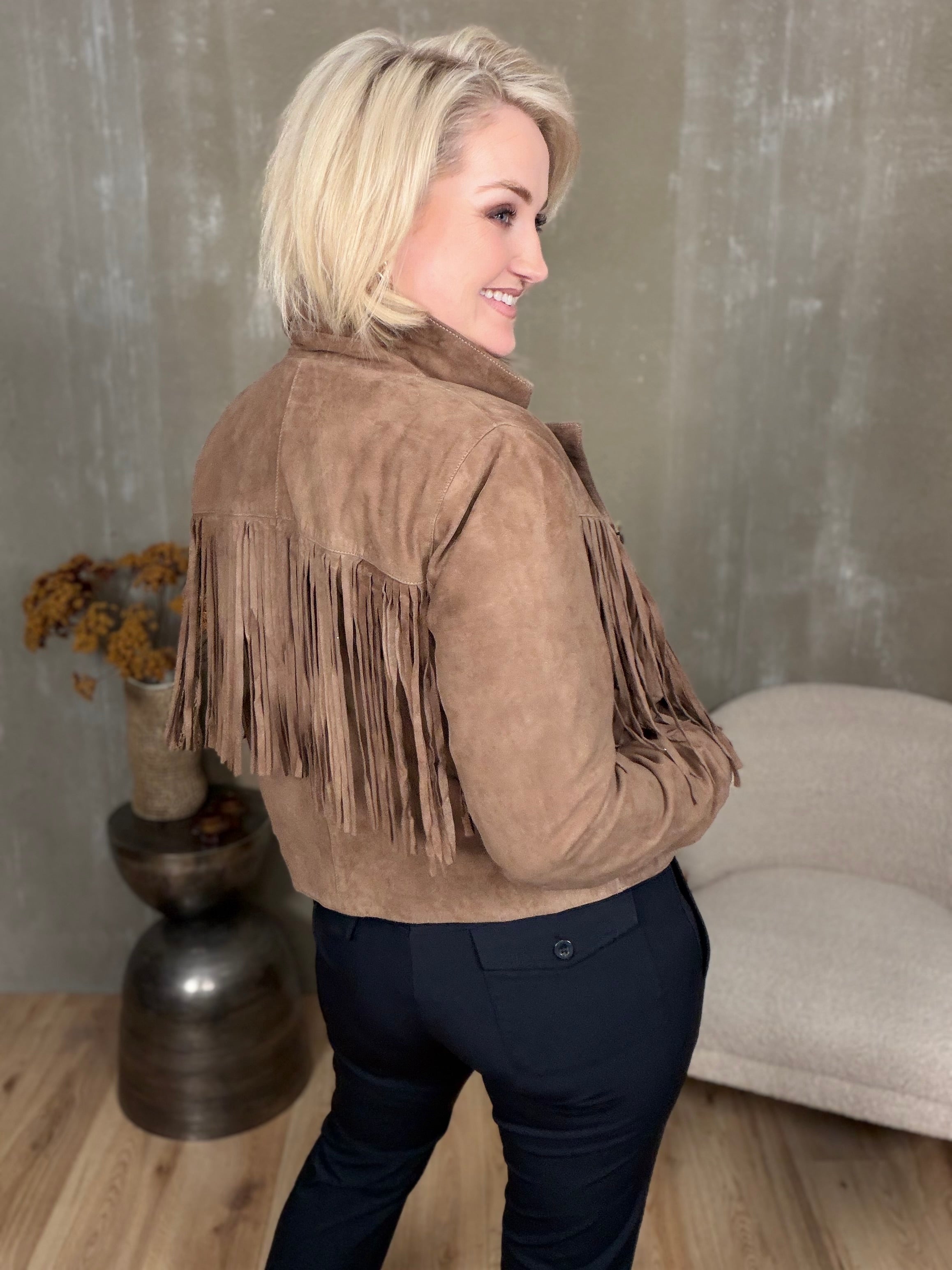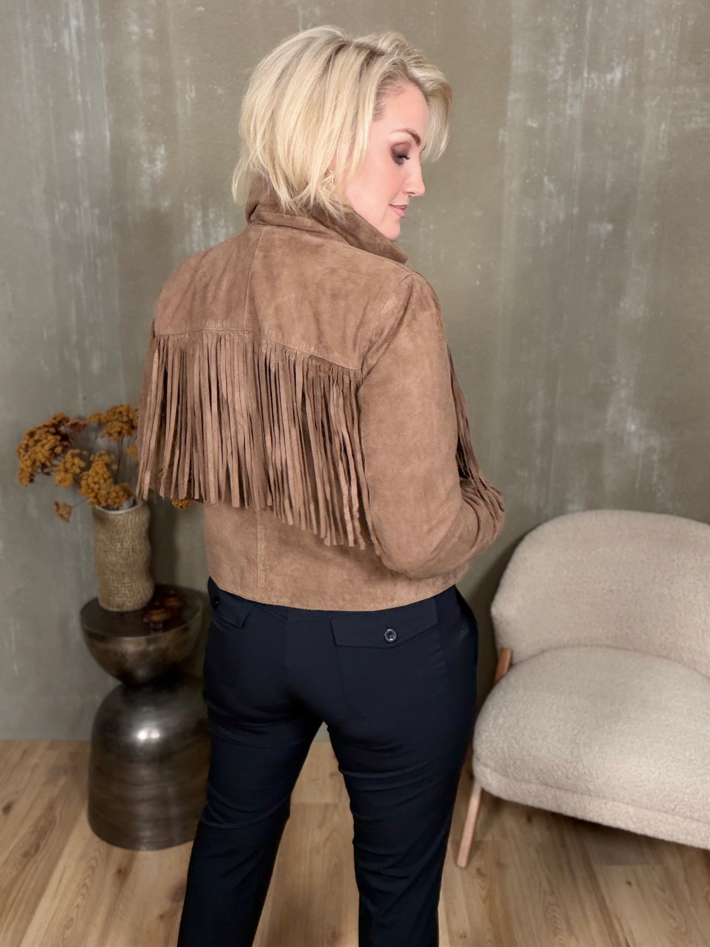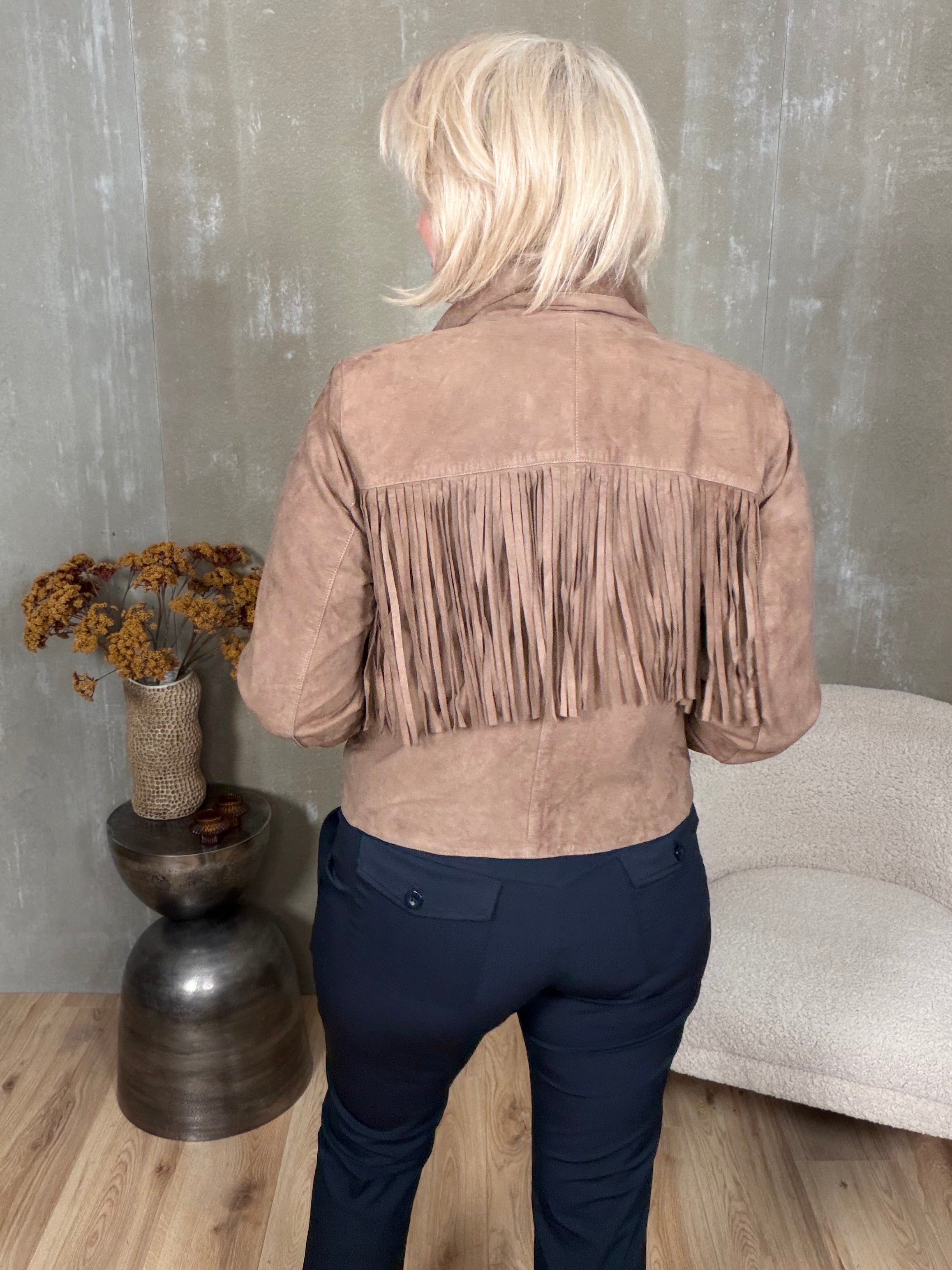 Kögurjakki úr rúskinni með tölum og vösum í hlið.