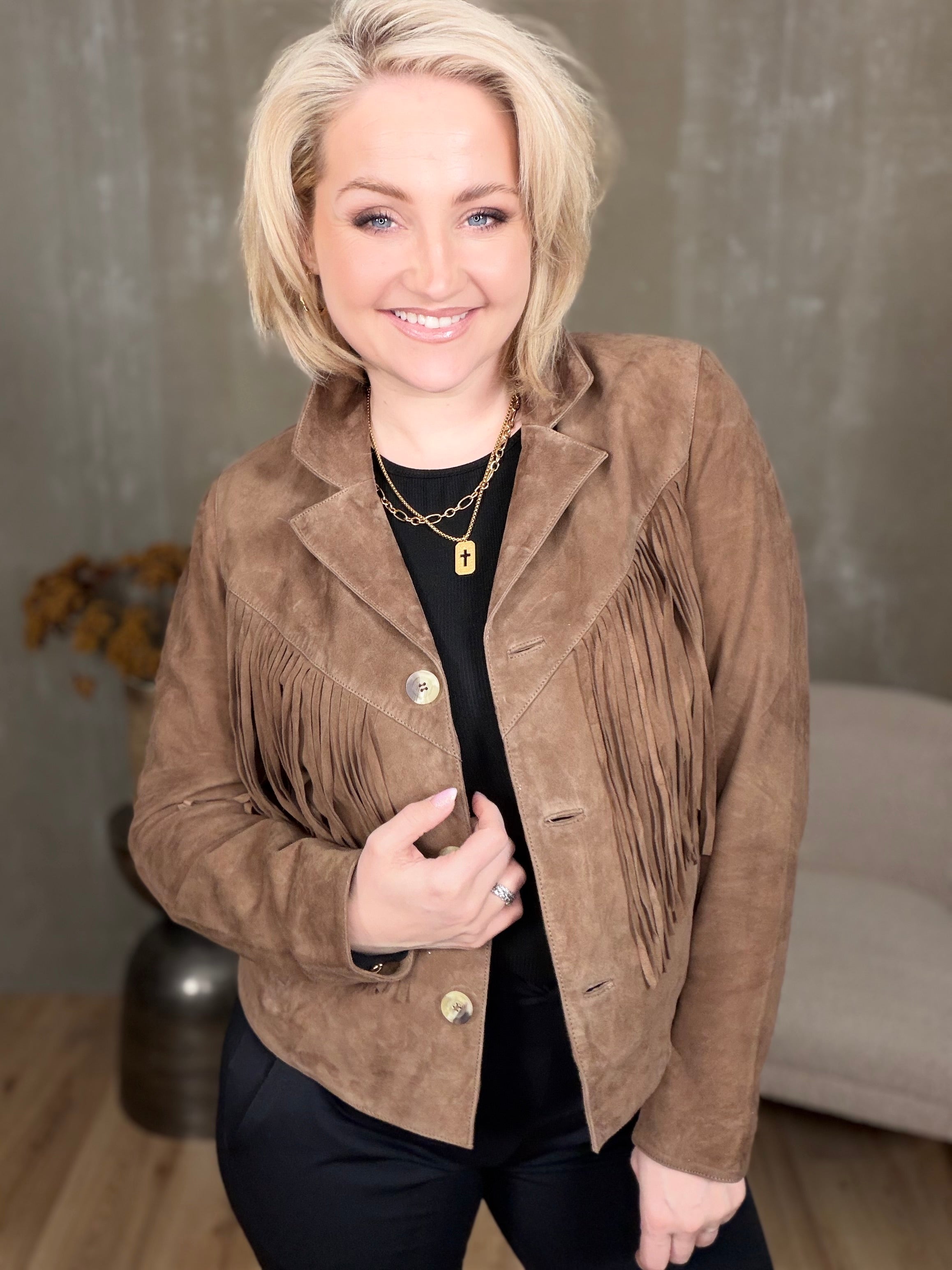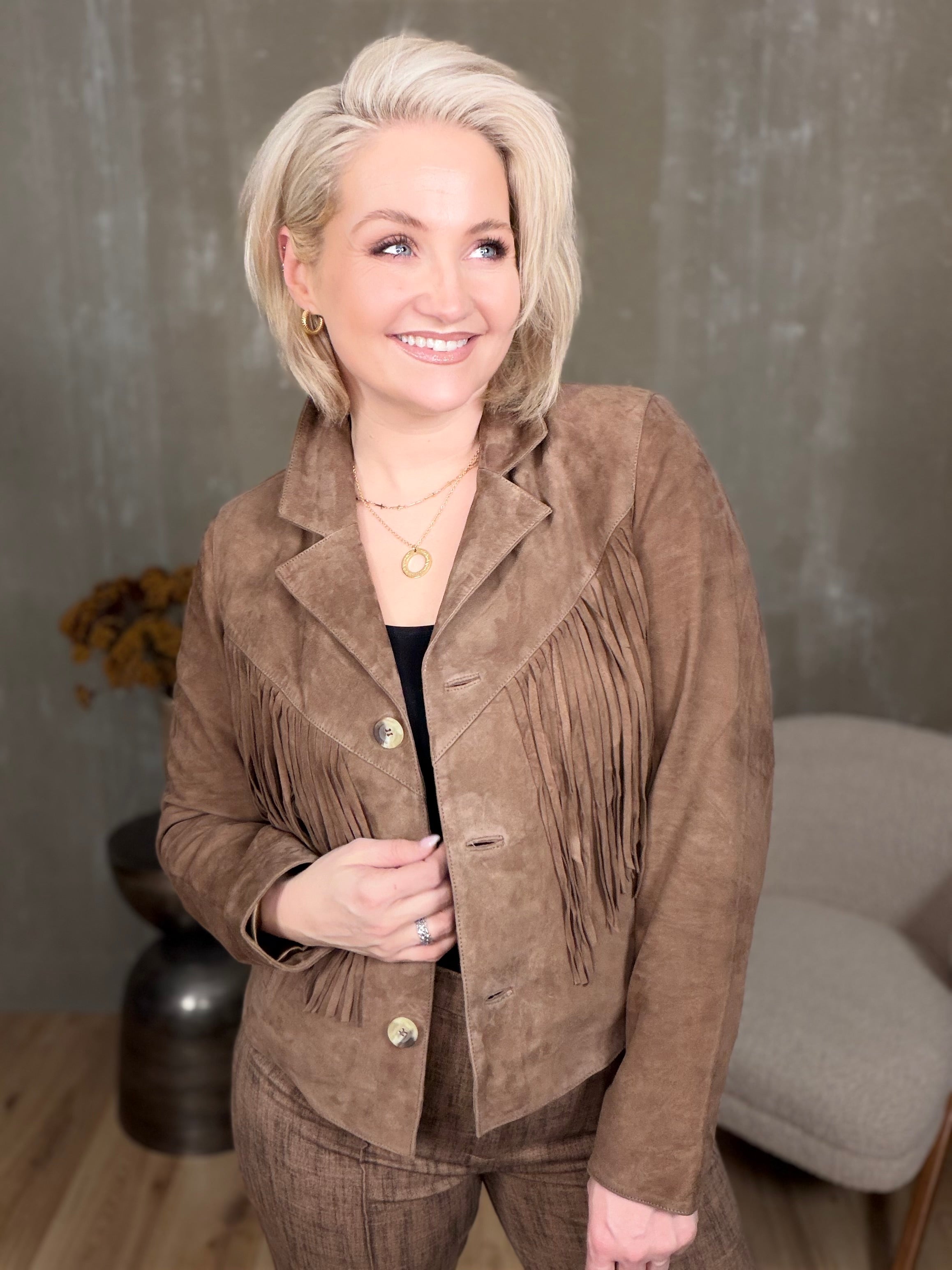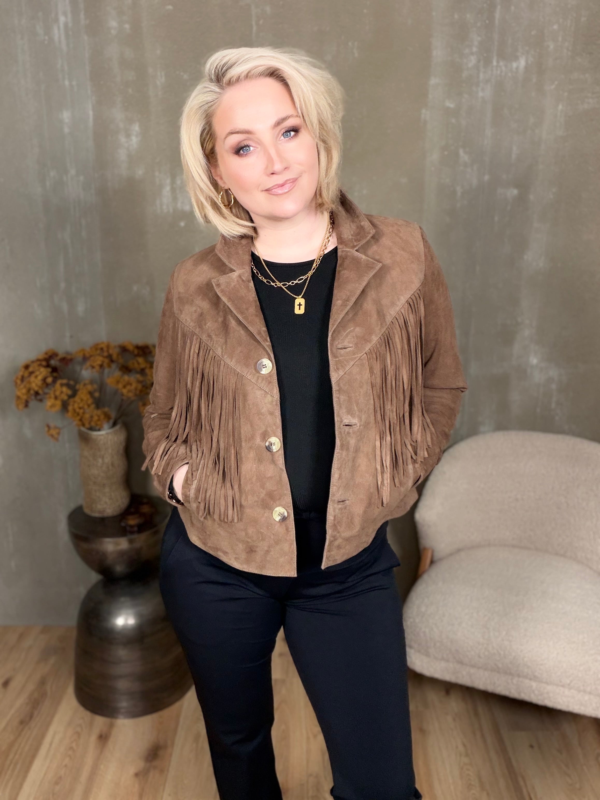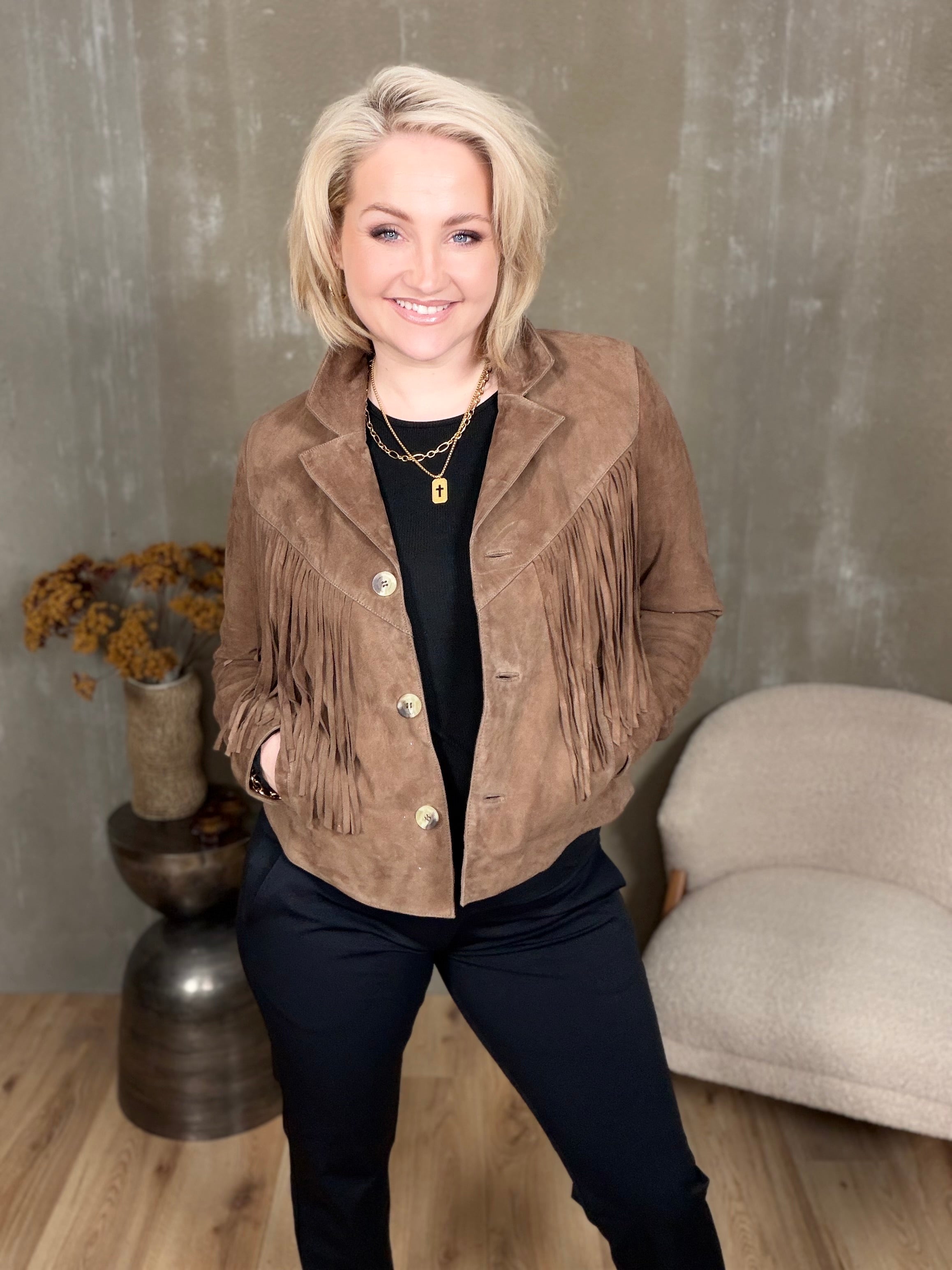 Kögurjakki úr rúskinni með tölum og vösum í hlið.