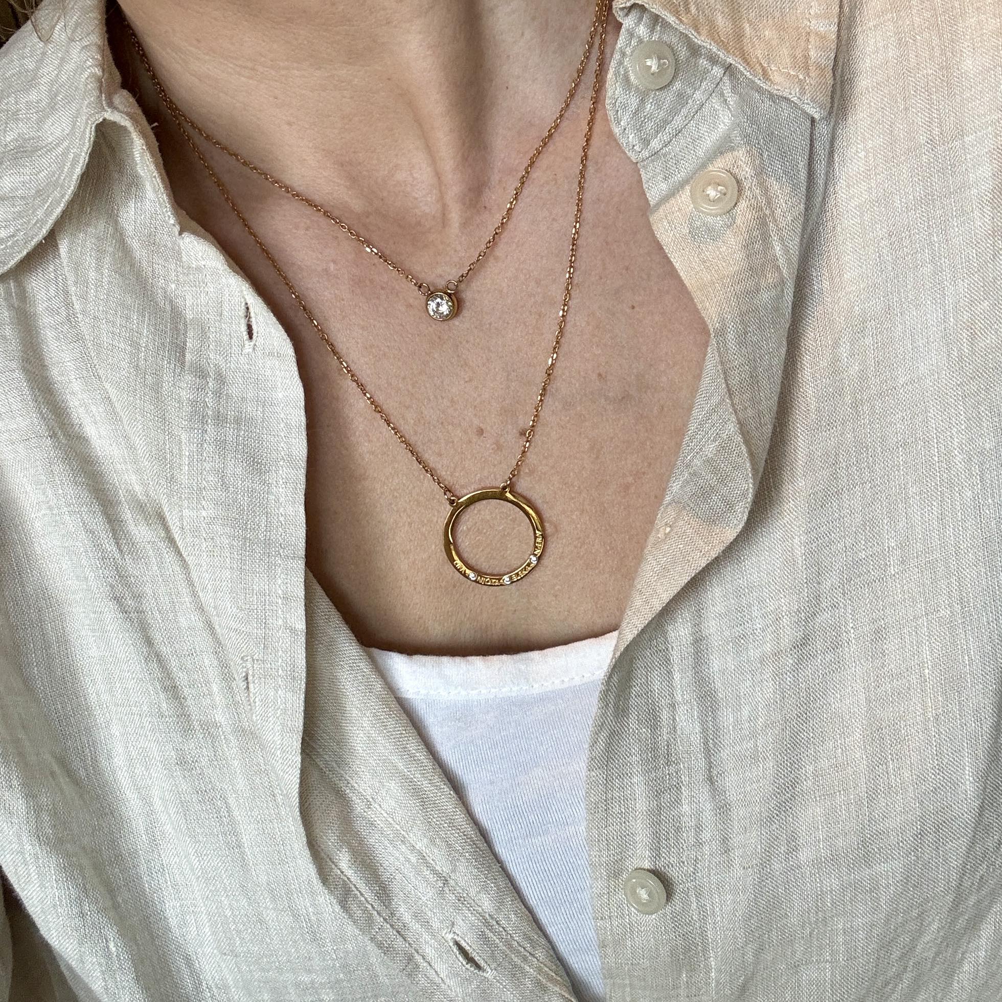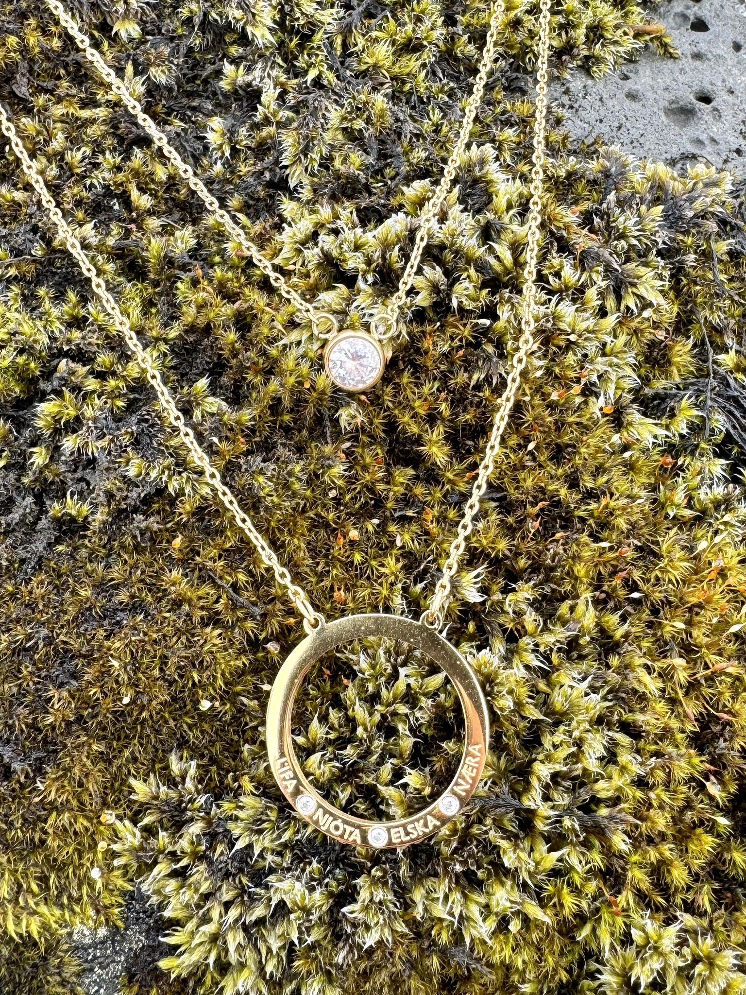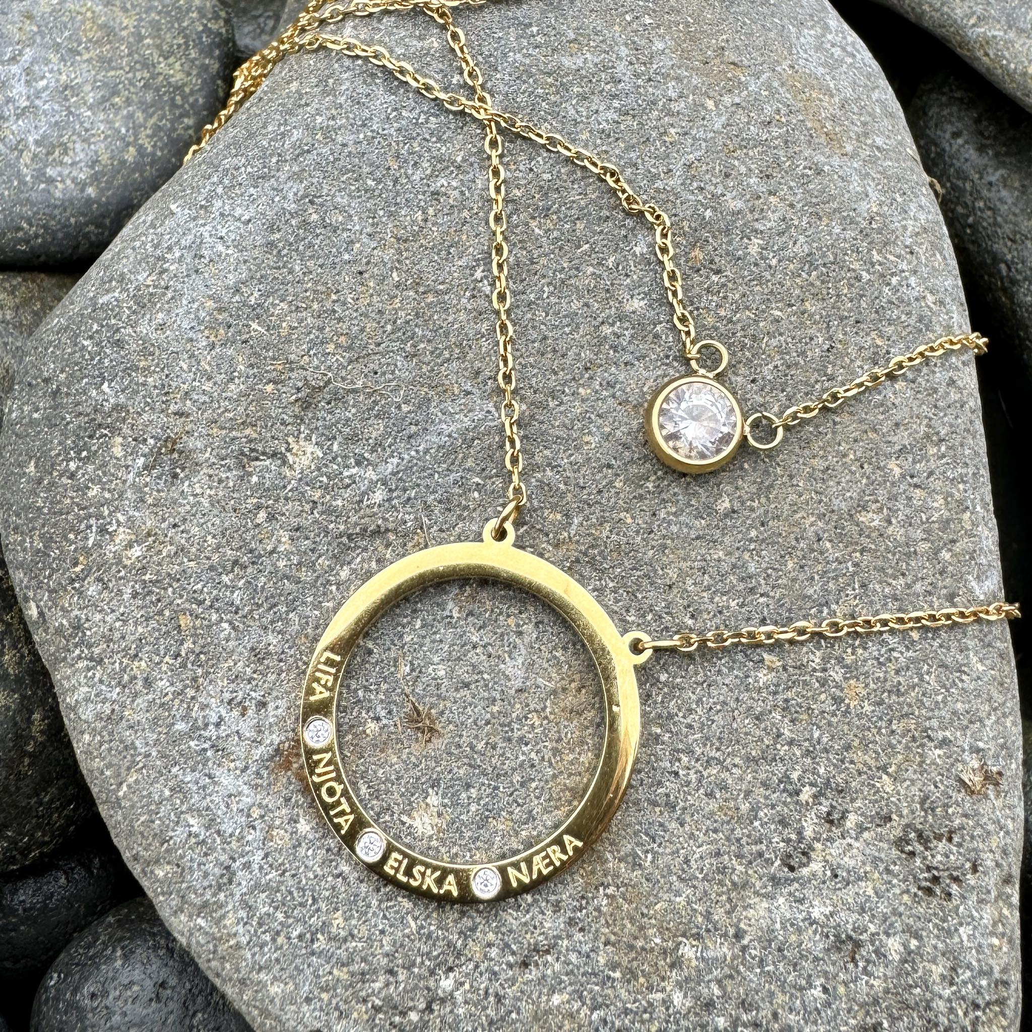 Nistin eru bæði í gylltu og silfur og með stillanlegri keðju svo hægt er að lengja úr 40 cm í 45 cm s.s. minni keðjan með steininum.